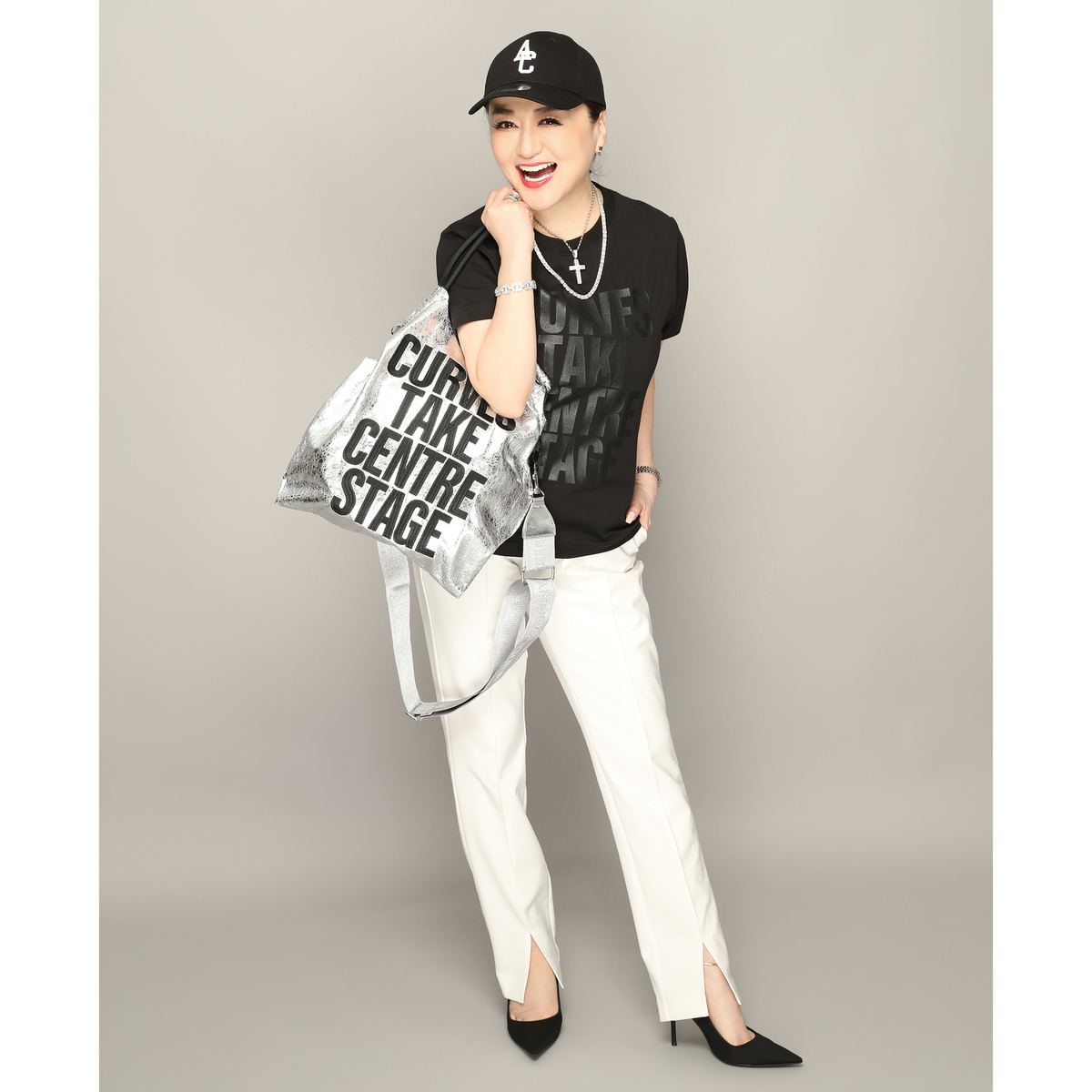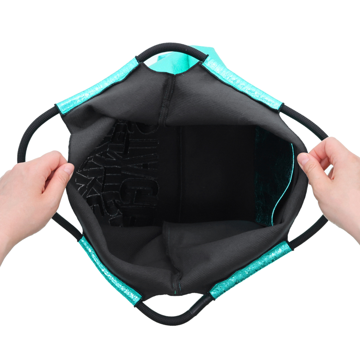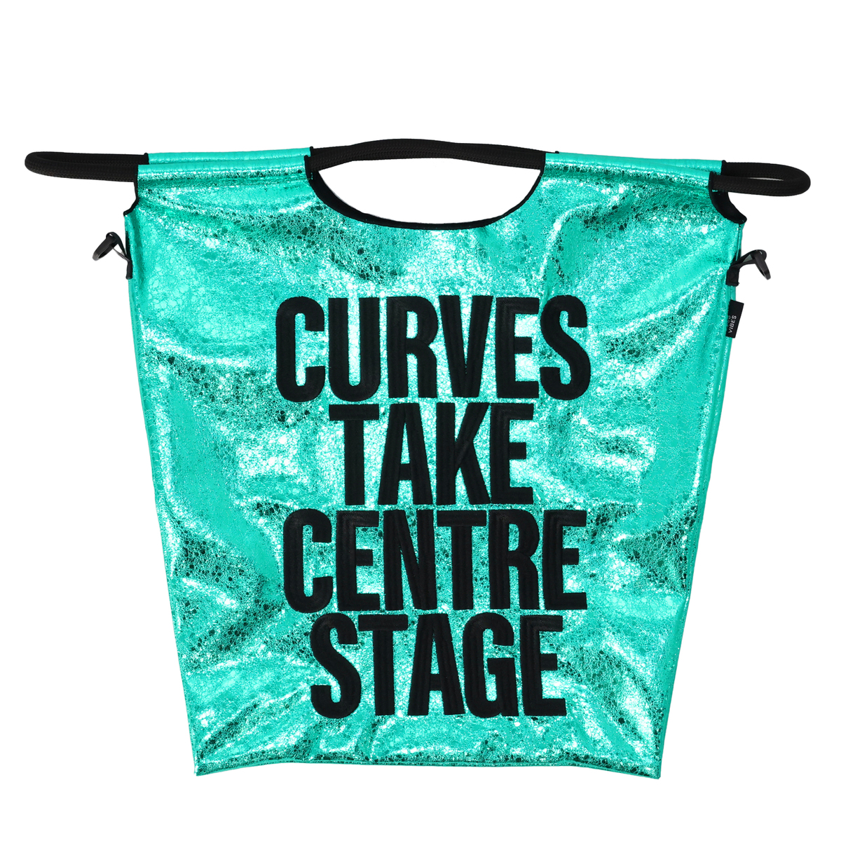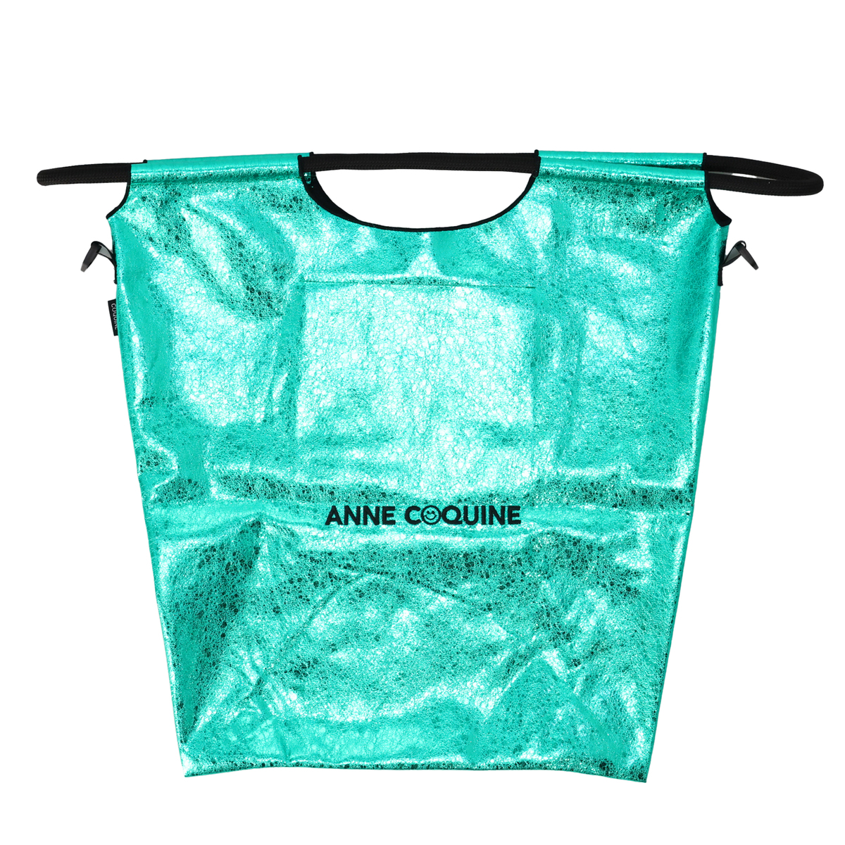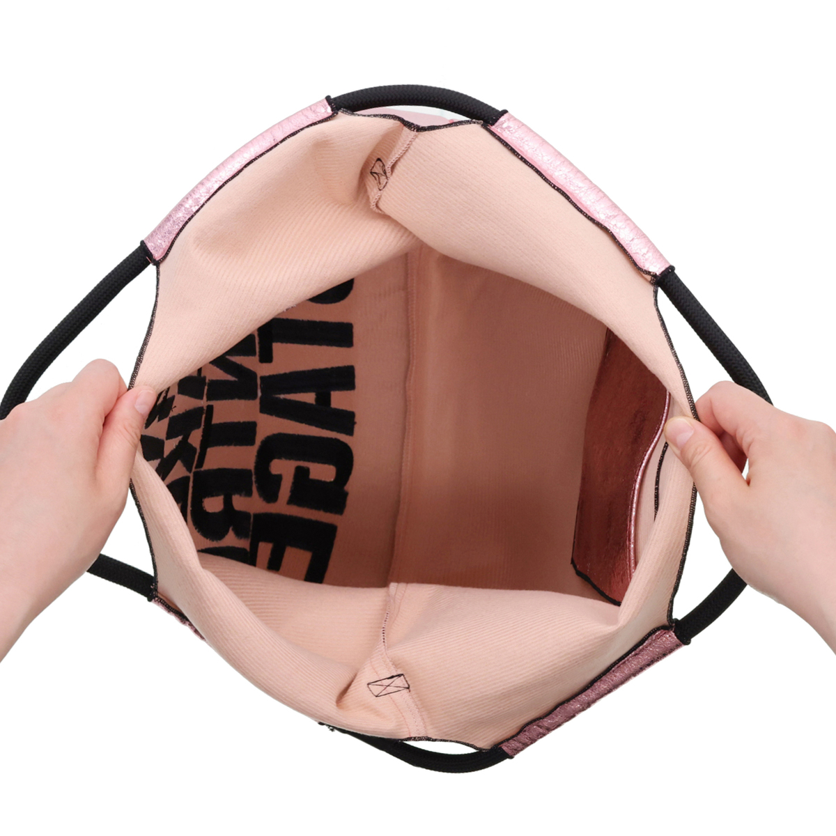 メタリックな素材感とメッセージ刺繍が目を惹くエコバッグ。コーデのポイントになってくれるスタイリッシュなデザインです