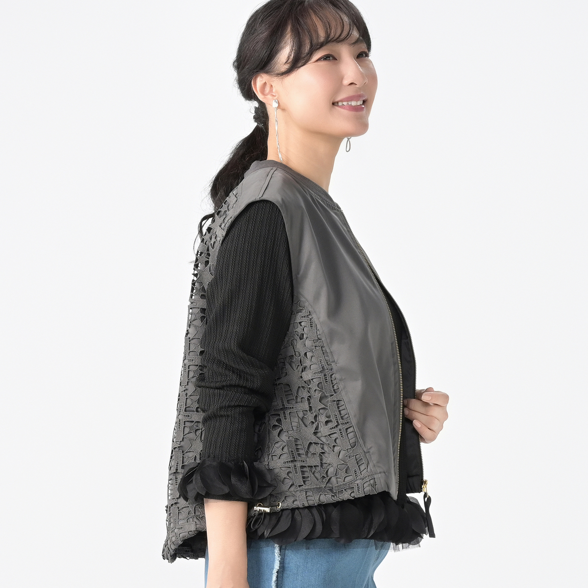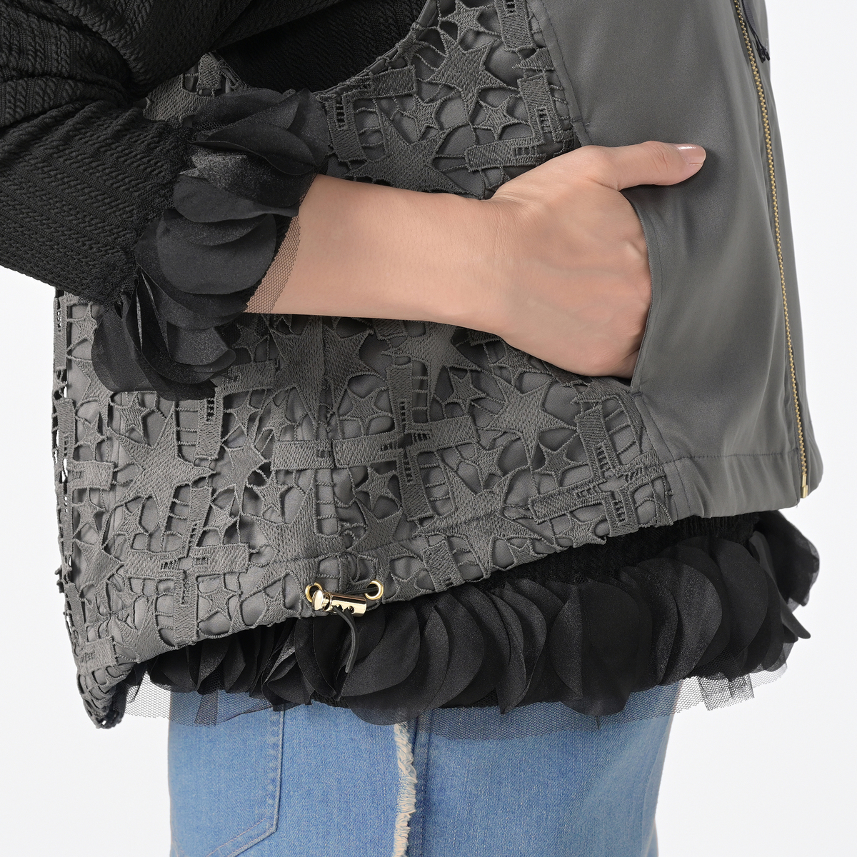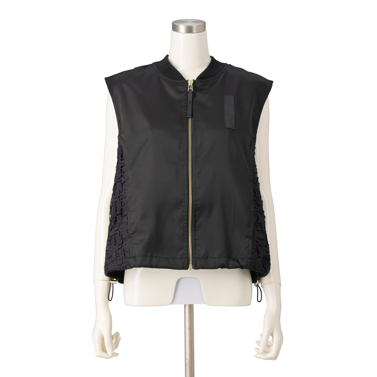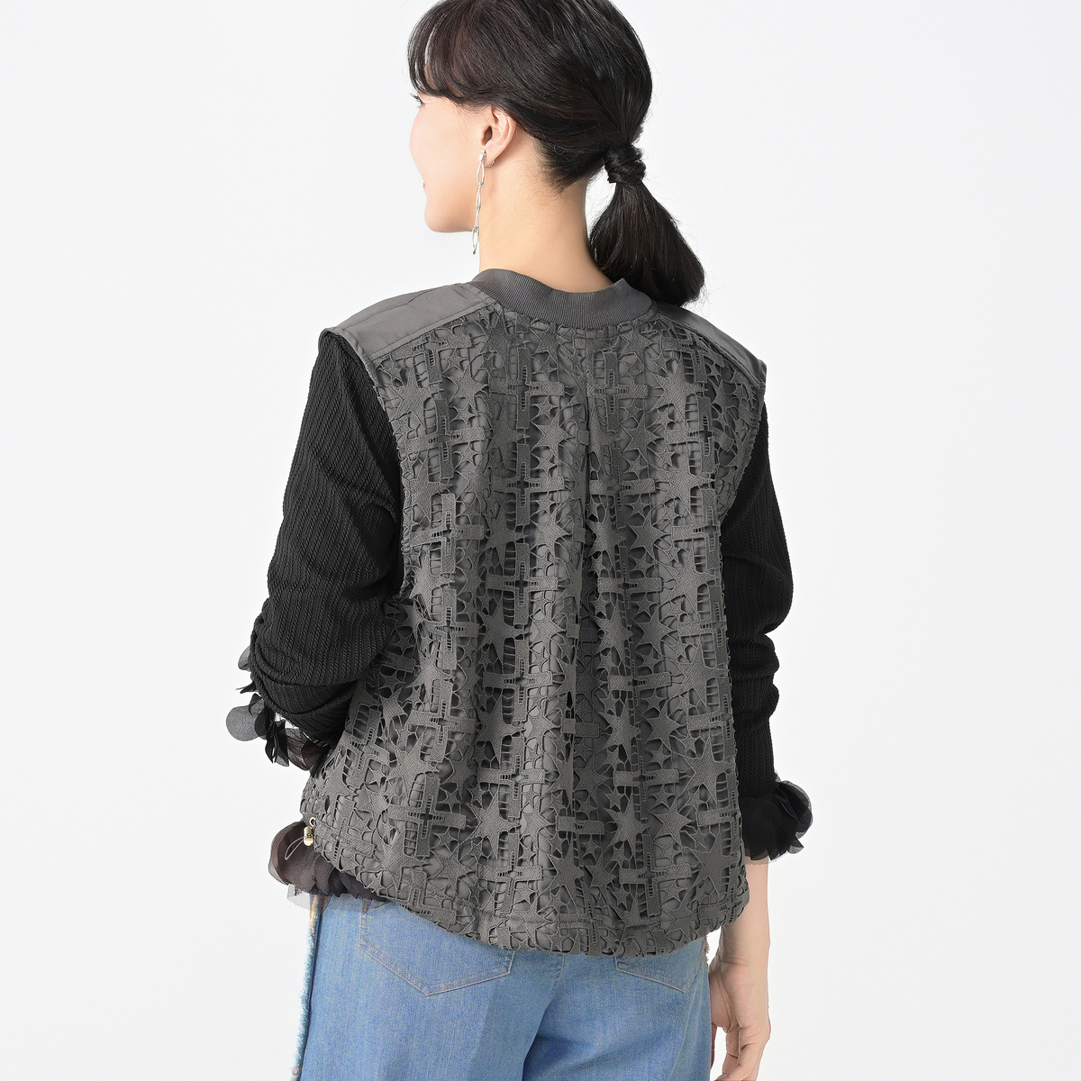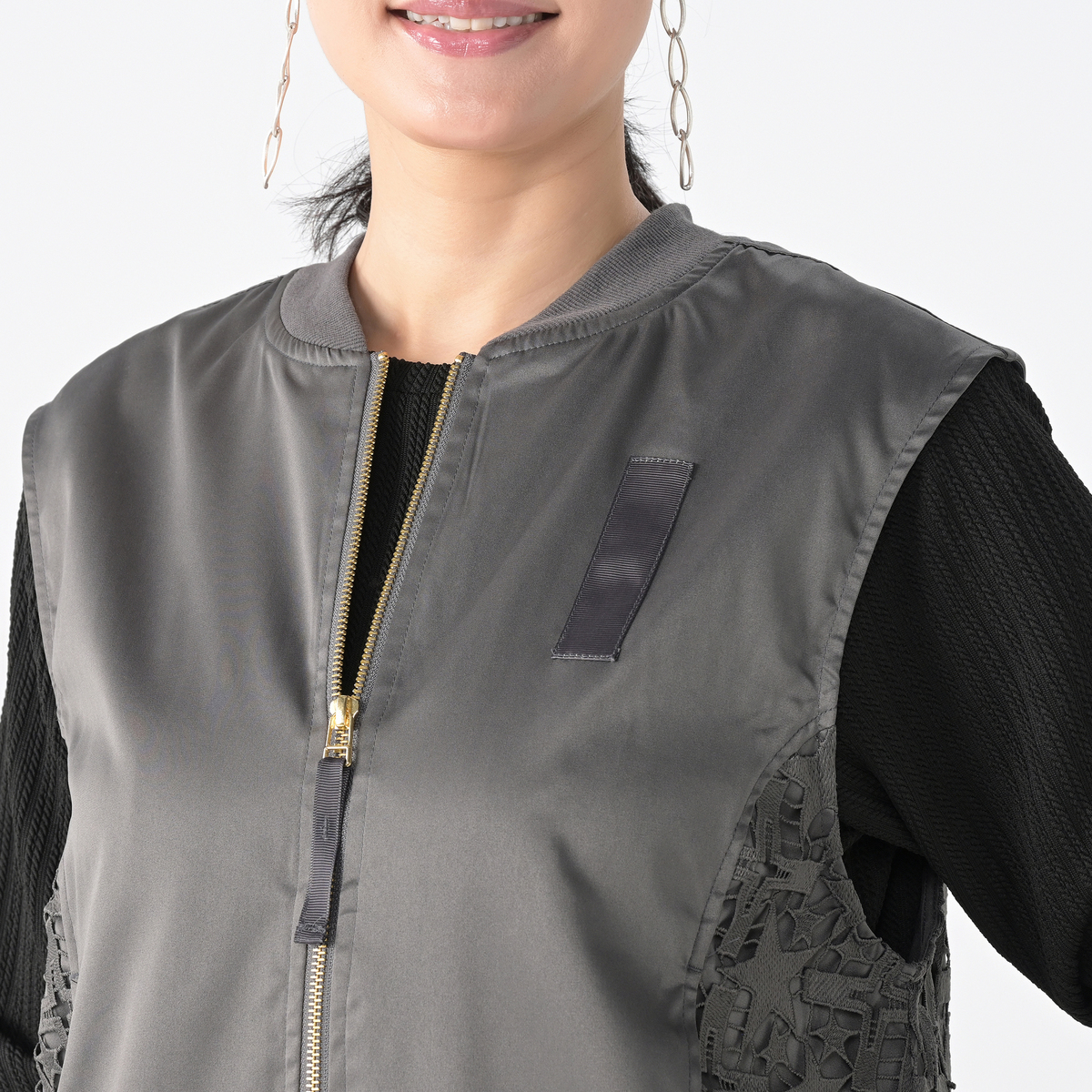 星レースと微光沢感のある素材を使用したMA-1風ジレです。襟ぐりのリブやグログランテープがアクセントとなり、脇から前身頃にかけて斜めに配置したレースがすっきりとした印象に。視覚効果で細見えを狙いつつ、コーディネートに個性と華やぎを添えます