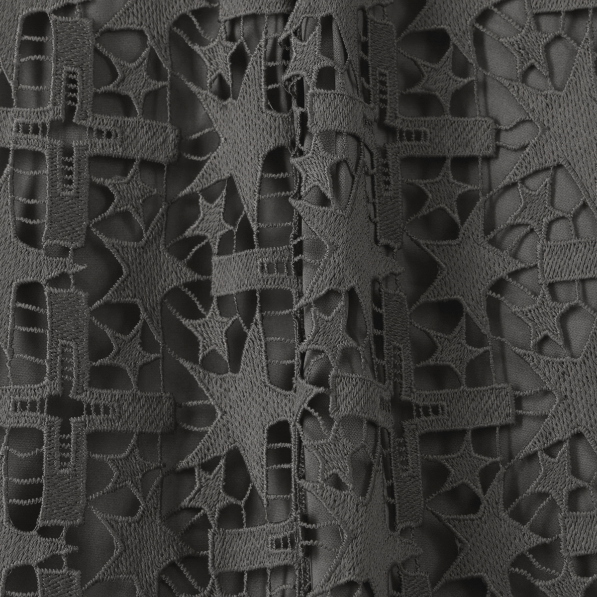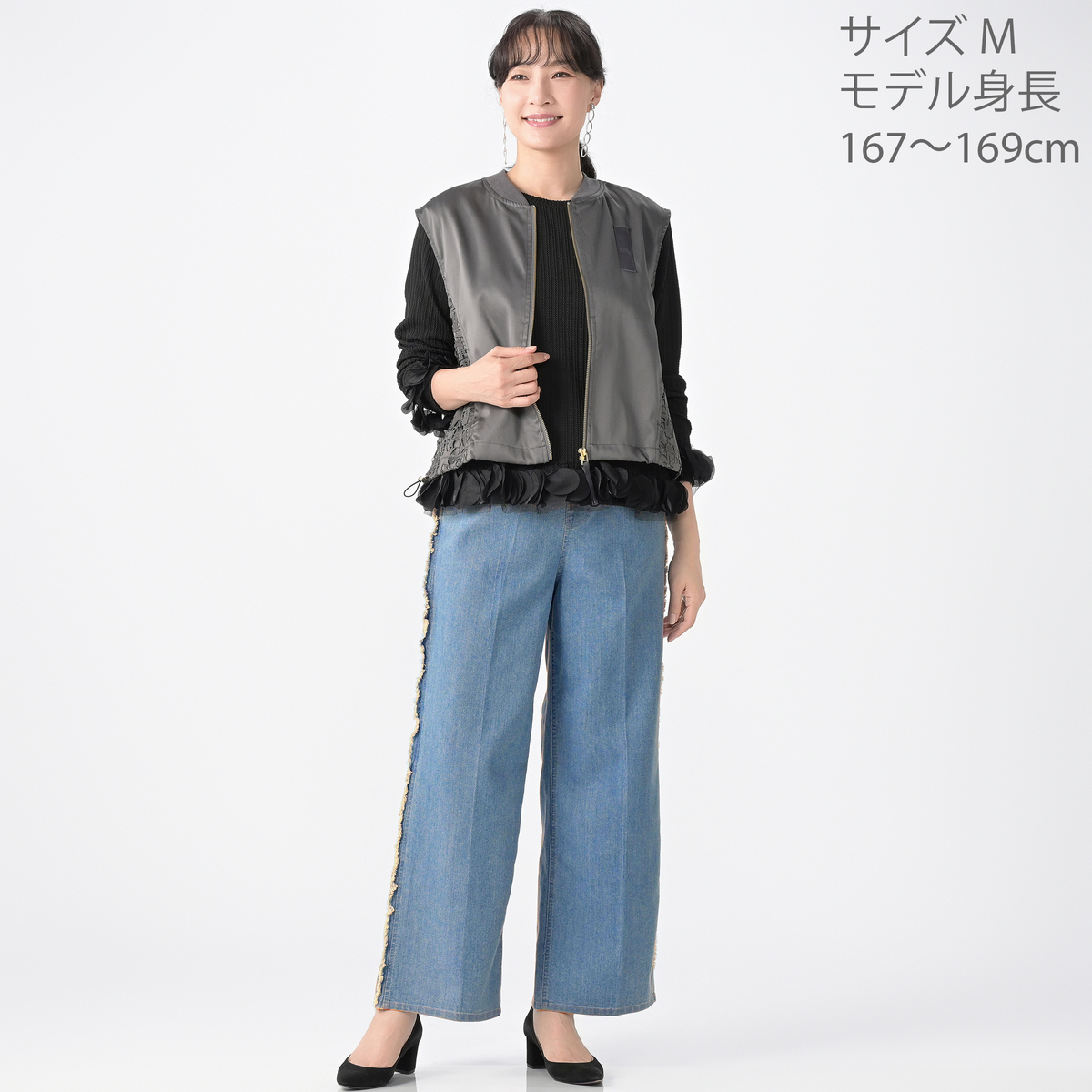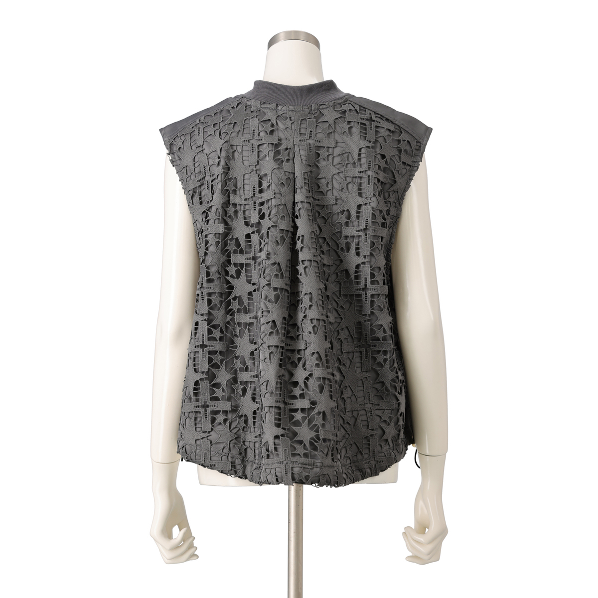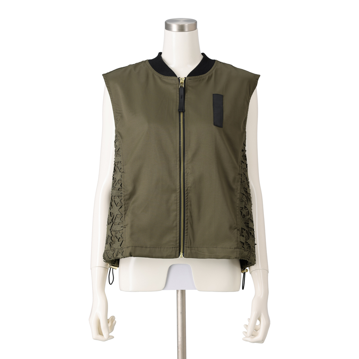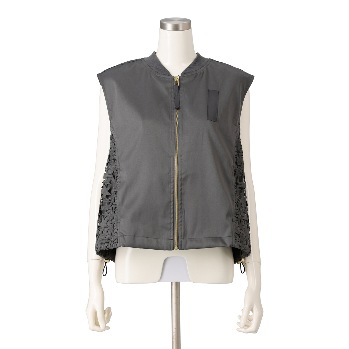 星レースと微光沢感のある素材を使用したMA-1風ジレです。襟ぐりのリブやグログランテープがアクセントとなり、脇から前身頃にかけて斜めに配置したレースがすっきりとした印象に。視覚効果で細見えを狙いつつ、コーディネートに個性と華やぎを添えます