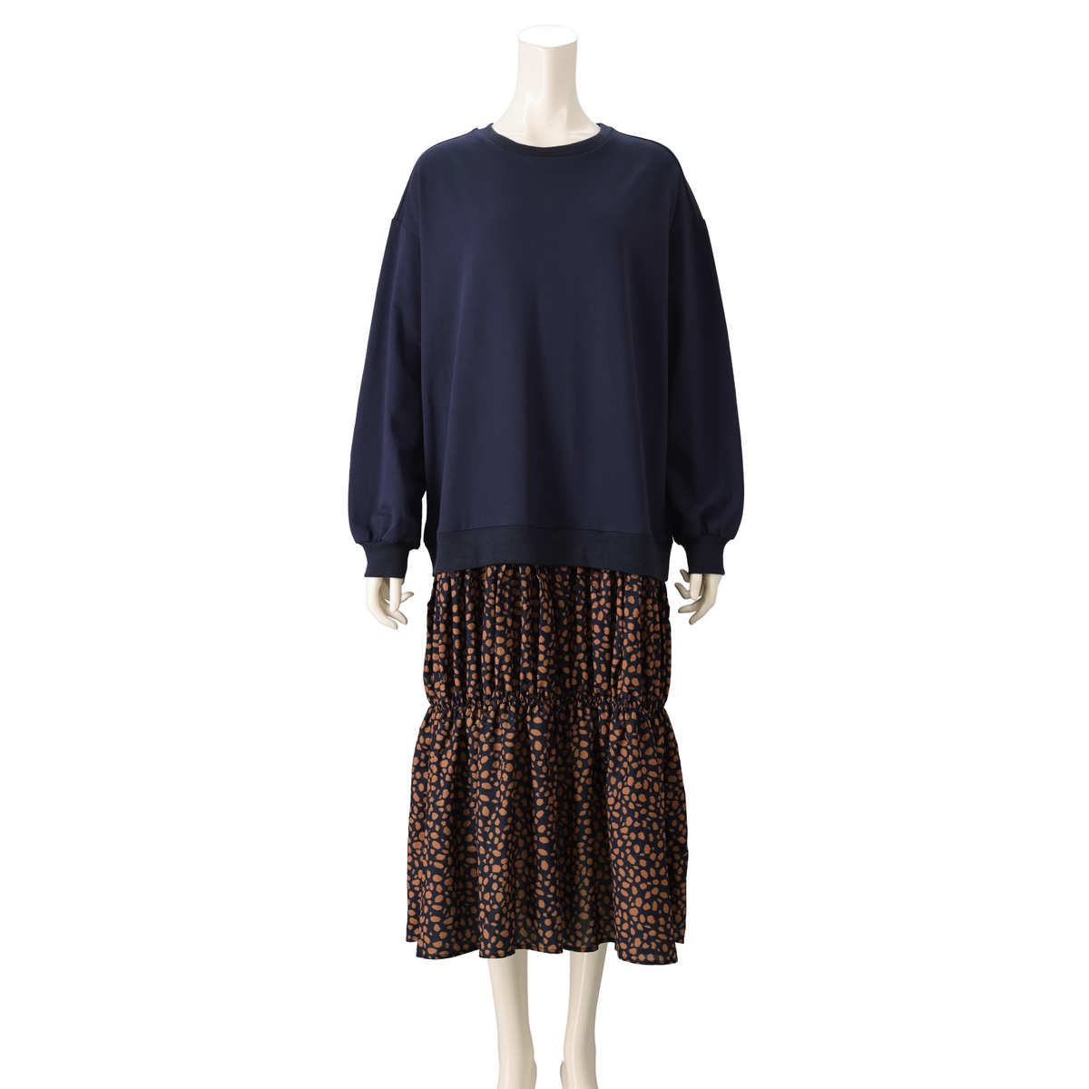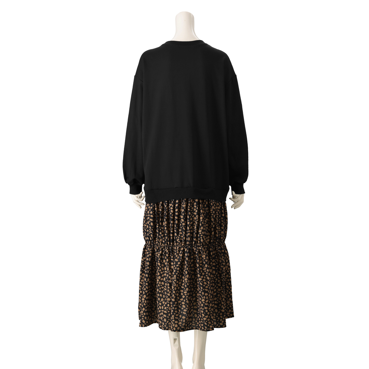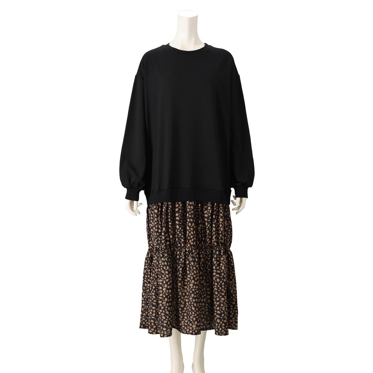 1枚着るだけできまるドッキングワンピース。上身頃にはカットソー、スカート部分にはレオパード柄の布帛素材を使用しました