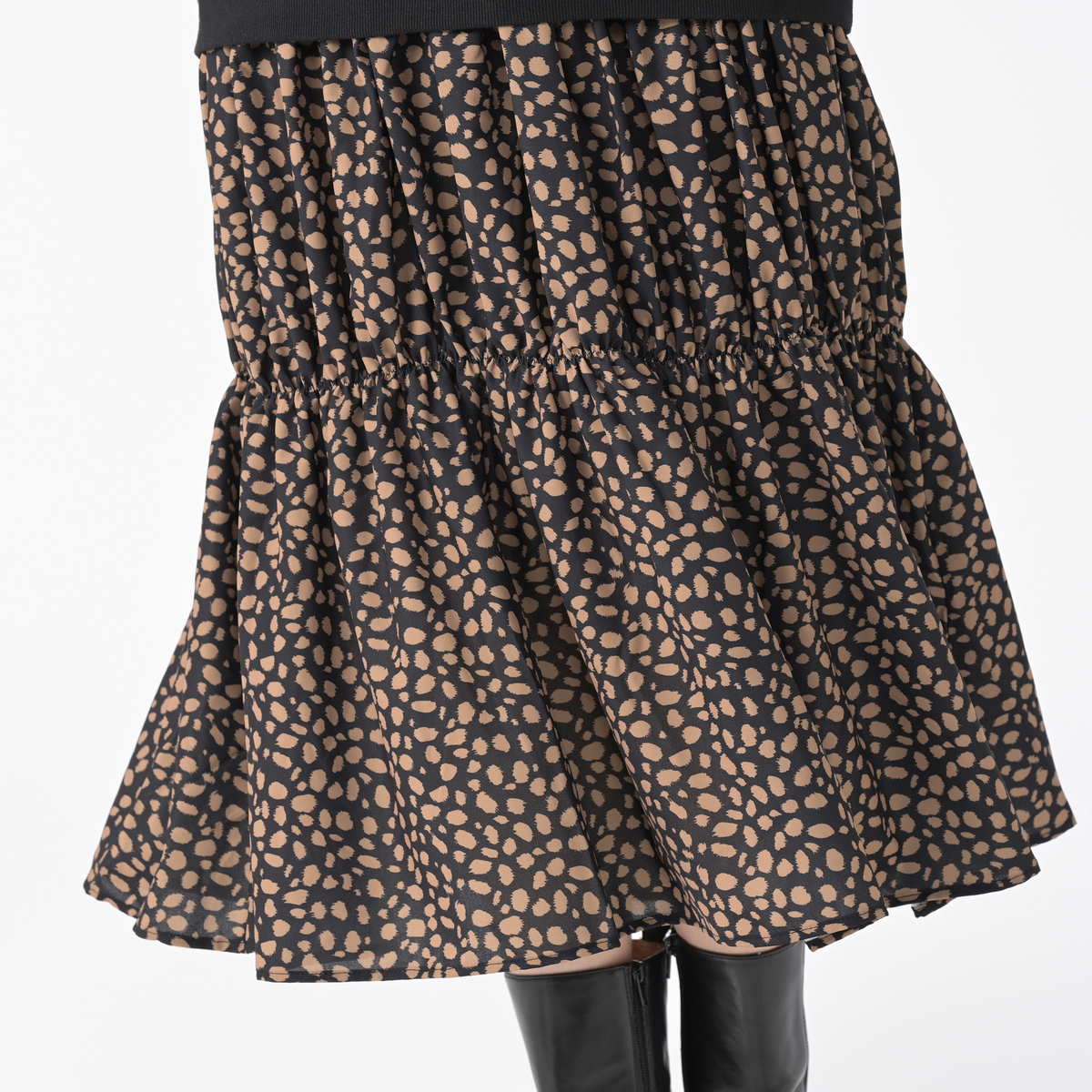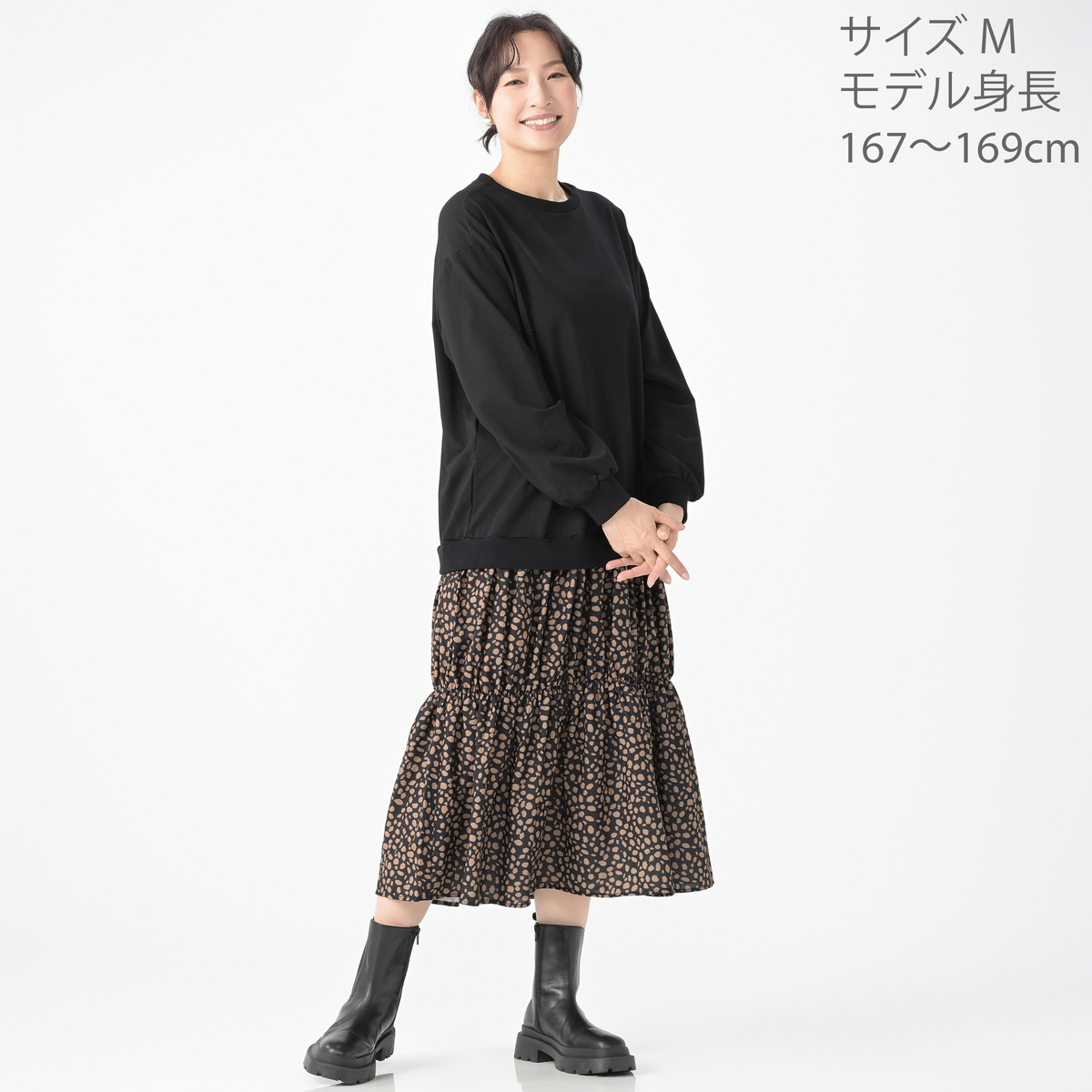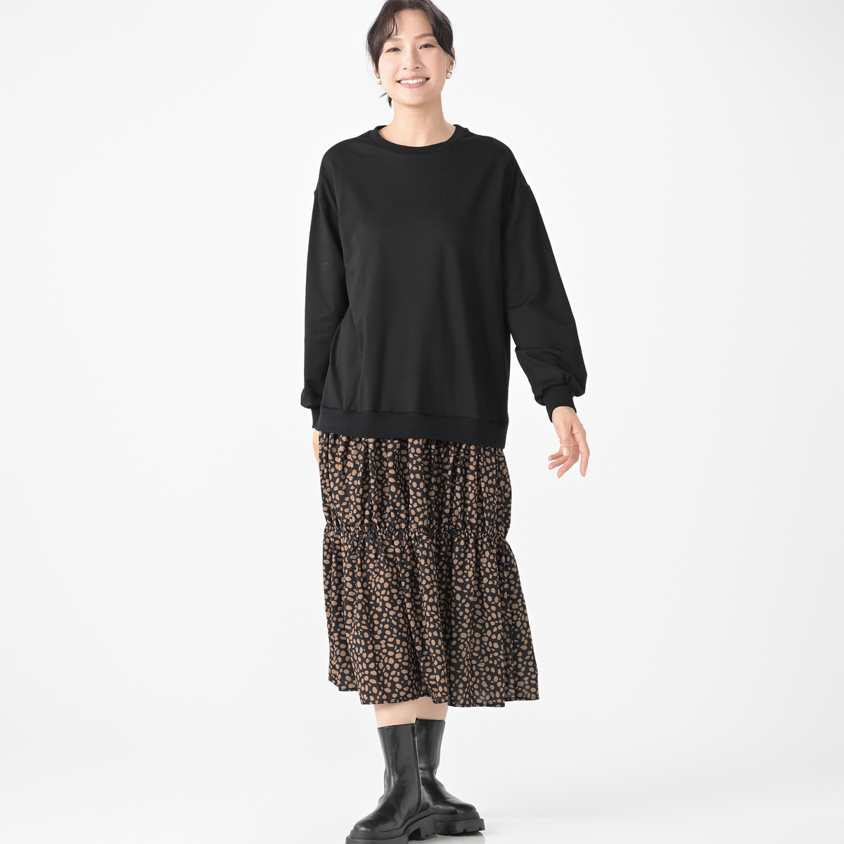 1枚着るだけできまるドッキングワンピース。上身頃にはカットソー、スカート部分にはレオパード柄の布帛素材を使用しました