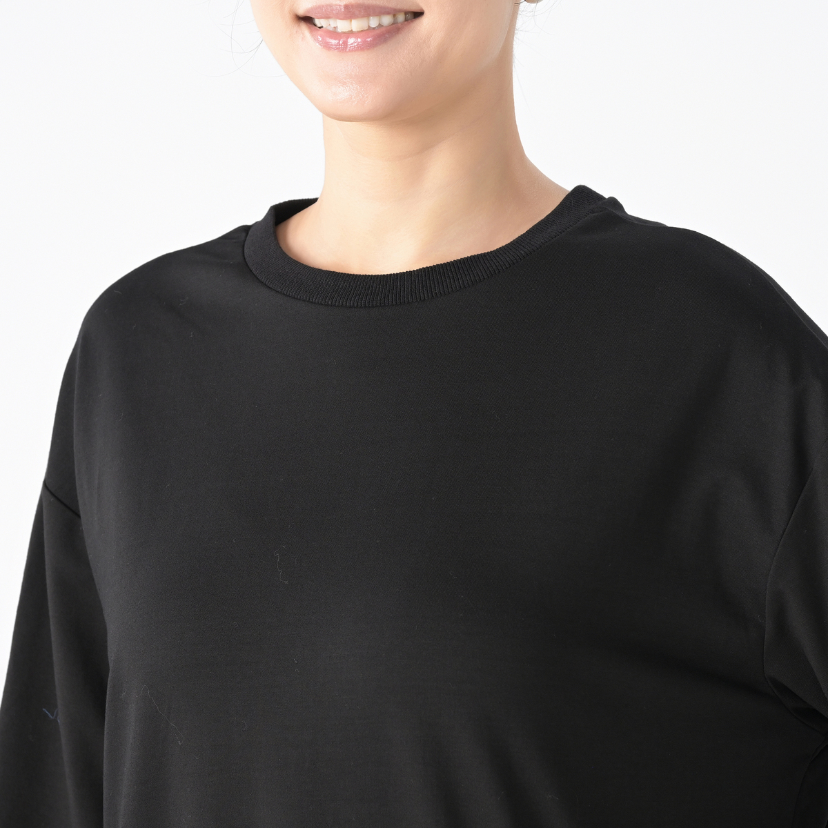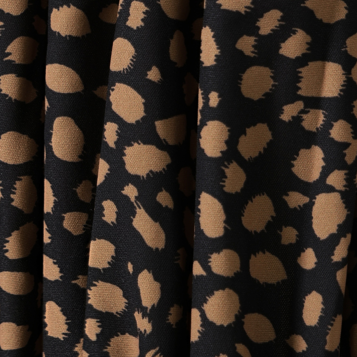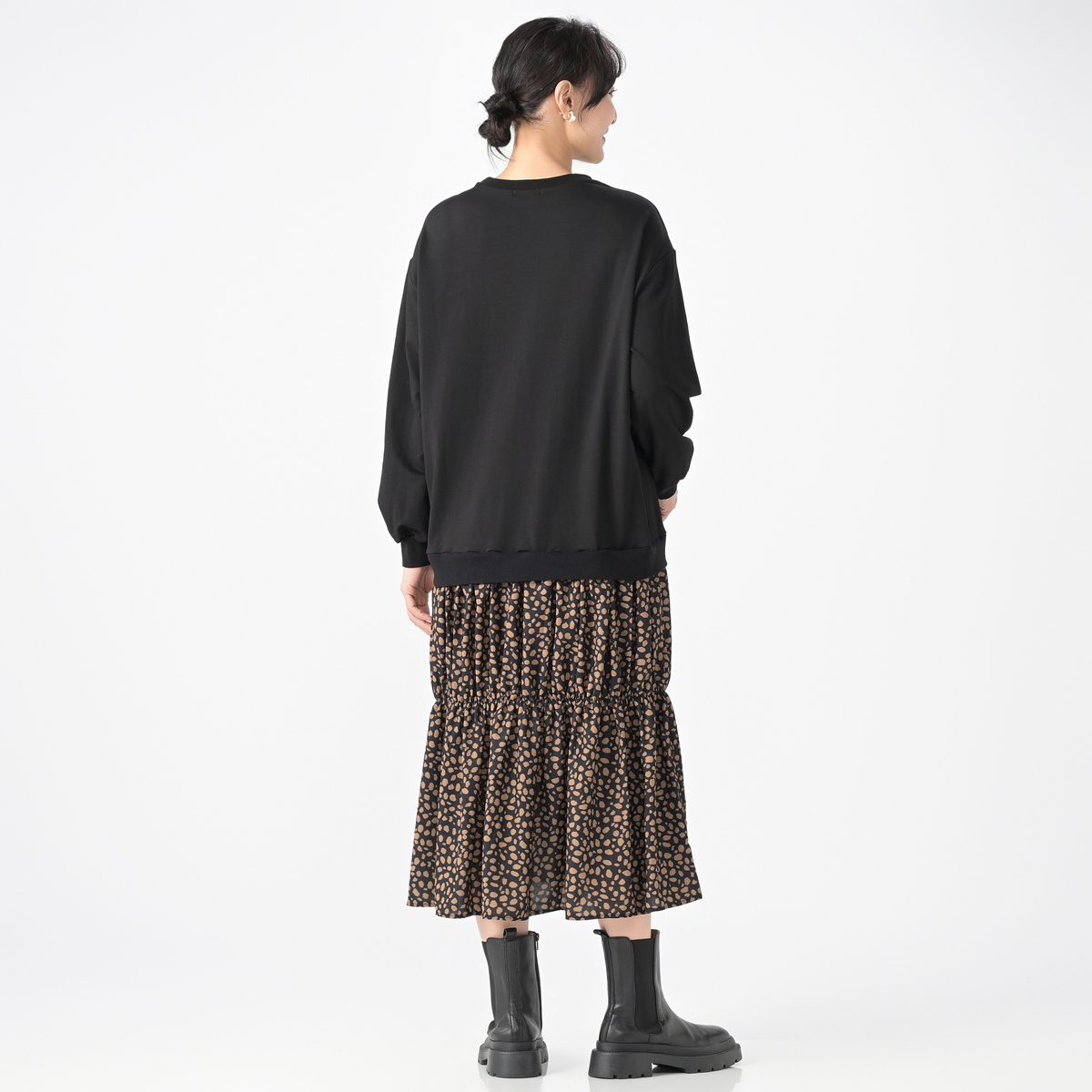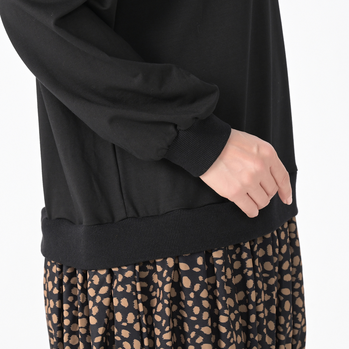 カットソーには綿混の裏毛素材を使用。きれいめな素材感で上品に着こなせます。布帛部分には薄手の綾織生地を使い、インクジェットプリントでオリジナルのレオパード柄をあしらいました