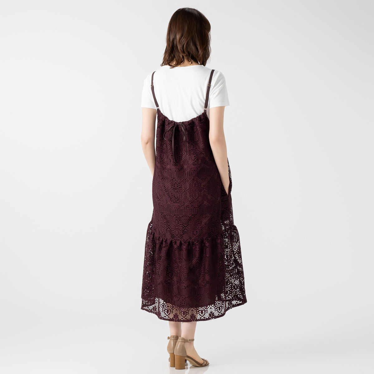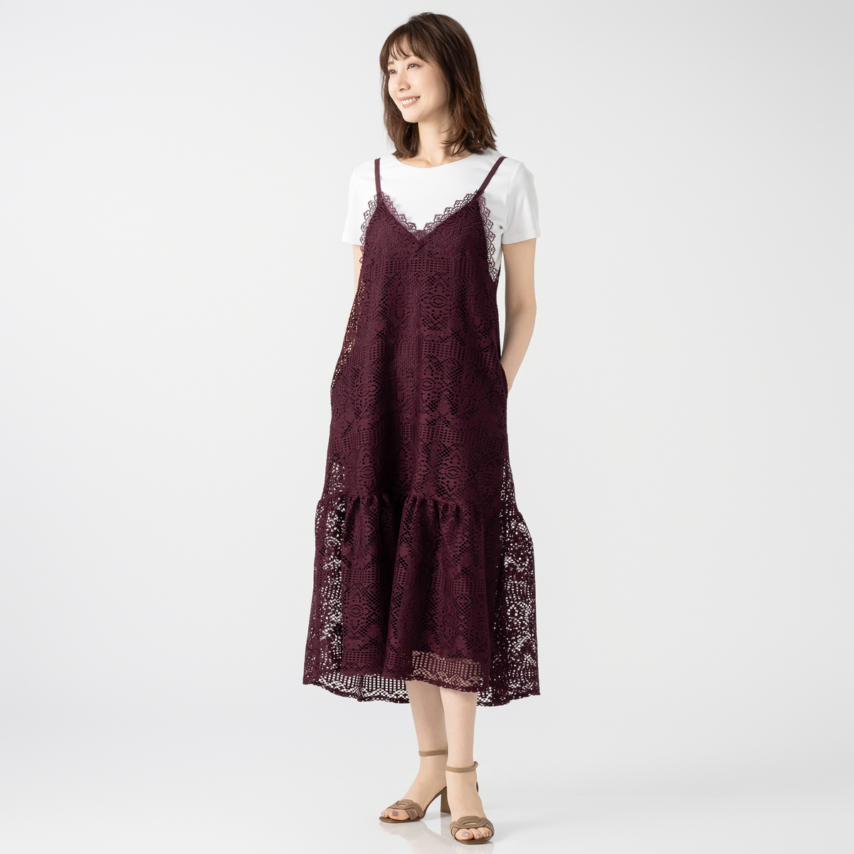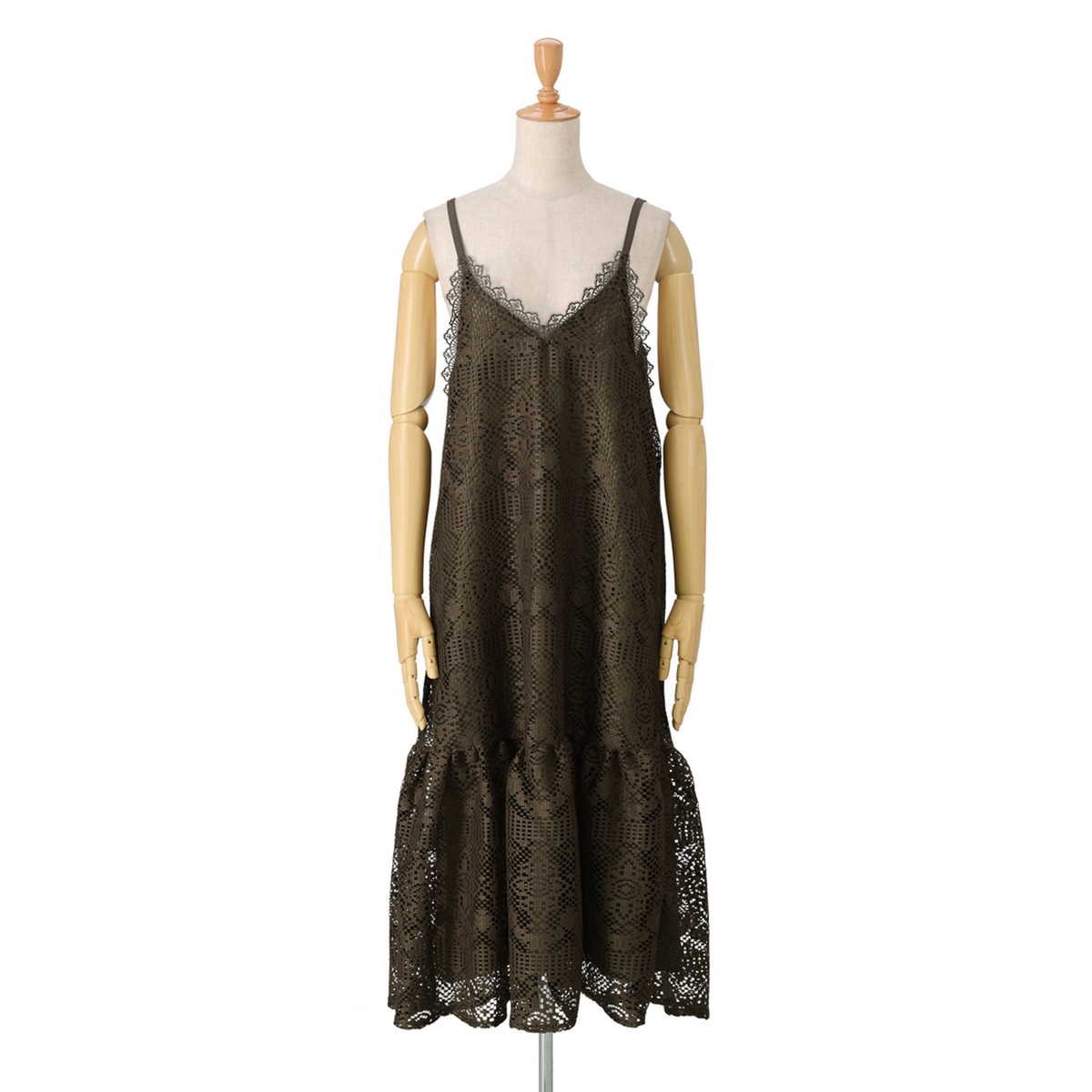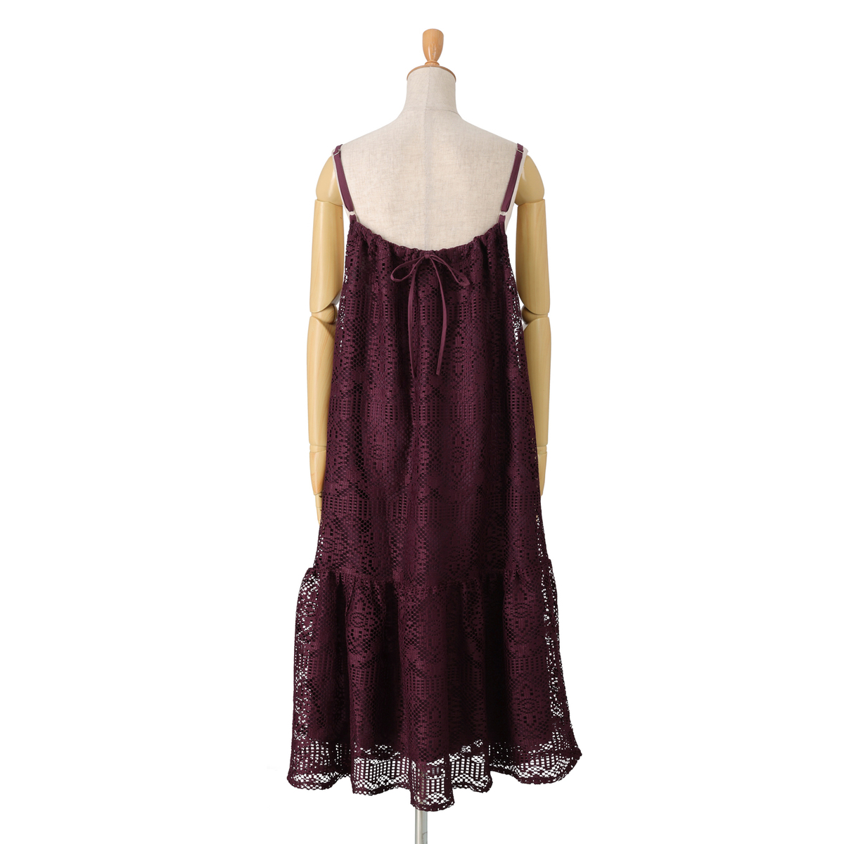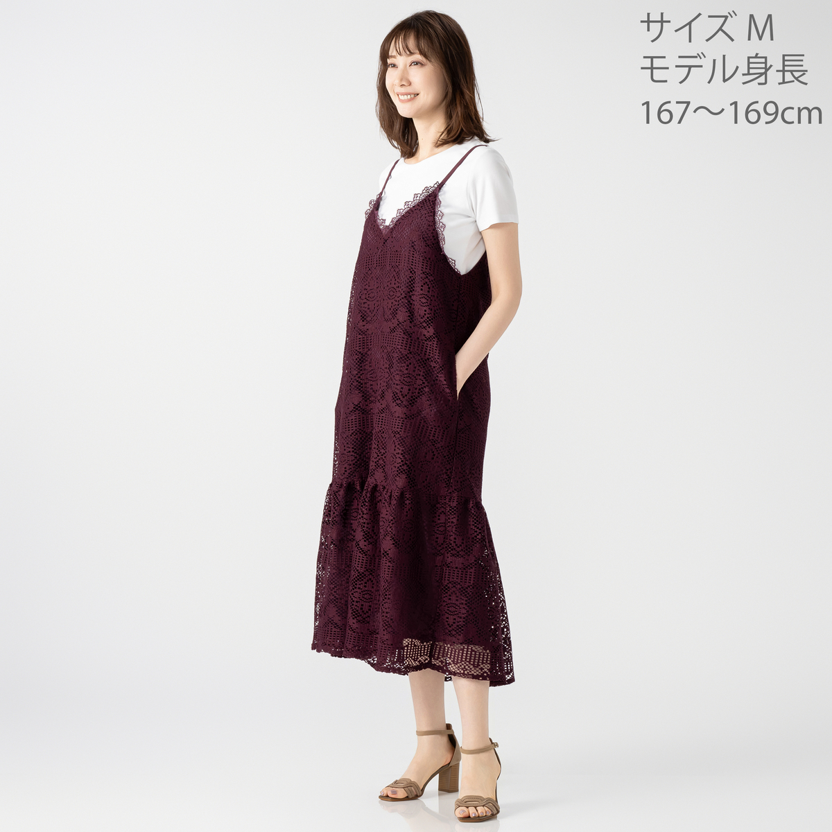 [商品寸法(ヌード)cm] サイズ バスト 着丈 ウエスト ヒップ S:96.5(72〜80) 95 (58〜64)(82〜90) M:101.5(79〜87) 95 (64〜70)(87〜95) L:106.5(86〜94) 95 (69〜77)(92〜100) LL:111.5(93〜101) 95 (77〜85)(97〜105) 3L:120.5(100〜108) 95 (85〜93)(102〜110) [素材] レース部分:ポリエステル100% 裏地:ポリエステル100% [お手入れ] 洗濯機洗い可 [注意事項] ※商品寸法の誤差は多少発生します。ご了承下さい ※洗濯後はすぐに脱水し、形を整えて干して下さい。長時間水につけたままにしないで下さい ※洗濯の際は裏返しにし、洗濯ネットを必ず使用して下さい。ドライクリーニングの際は洗濯ネットを必ず使用して下さい ※生地組織の特性から糸の浮いている部分があります。引っ掛かりにはご注意下さい ※繊細なレースを使用していますので着用・着脱の際、爪・ボタン・ヘアピン・アクセサリー・時計・指輪等が引っかからぬ様にご注意下さい ※デリケートな素材を使用していますので、爪やアクセサリーなどの引っ掛かりによりキズがつきやすくなっております ※縫目や生地を強く引っ張らないよう注意して下さい ※アイロンの際は、あて布をご使用下さい ※濃色商品は、染色の性質上、洗濯すると色落ちする事があります。淡色や白物と組み合わせての着用や洗濯はお避け下さい ※濃色商品は着用中の摩擦により他の衣料やバッグ、椅子等に色移りすることがあります ※淡色・白の製品と組み合わせての着用や洗濯はお避け下さい。また、雨や汗等で濡れた状態で着用すると色移りすることがあります。その際はお早めに洗濯をして下さい ※肩紐のアジャスター部分(マルカンやエイトカン)にアイロンを当てないで下さい ※レース部分は糸端が飛び出ている箇所があります。着用、洗濯・クリーニングにより多少ほつれが生じることがありますのでご了承下さい ※着用時にベルトやバッグ、周囲の壁など、表面の粗いものとの摩擦や引っかかりに注意して下さい ※洗濯後は重ね置きしないで下さい ※ゴム部分へのアイロンはお避け下さい ※フリル部分はスチームアイロンを浮かしながら掛け、形を整えて下さい ※製品によっては、柄の出方が異なることがありますのでご了承下さい ※商品寸法の誤差は多少発生します。ご了承下さい 【中国製】