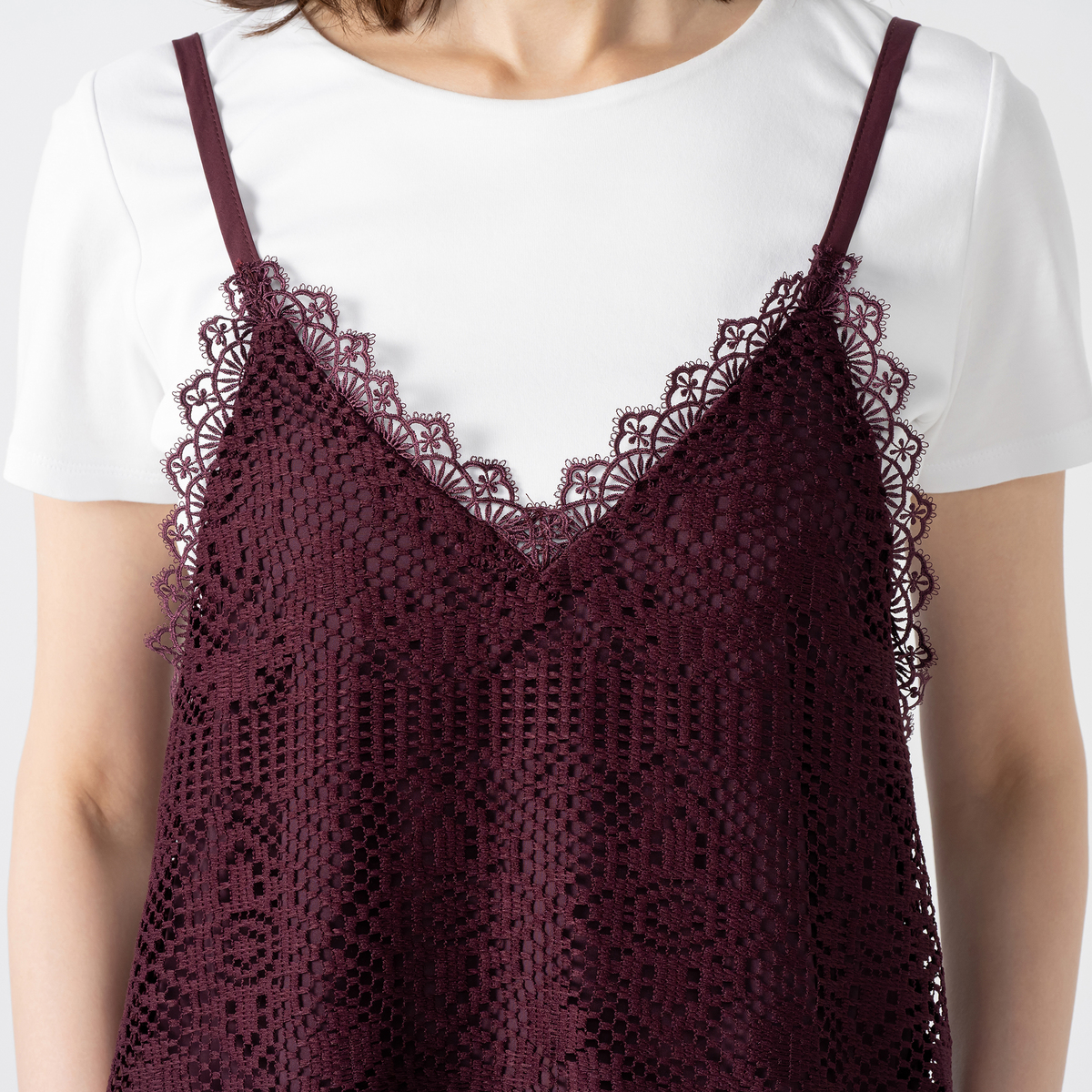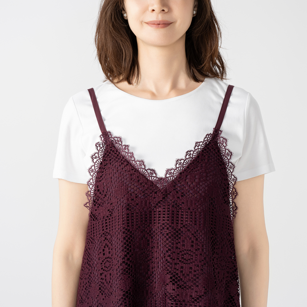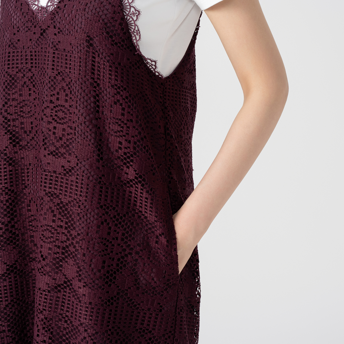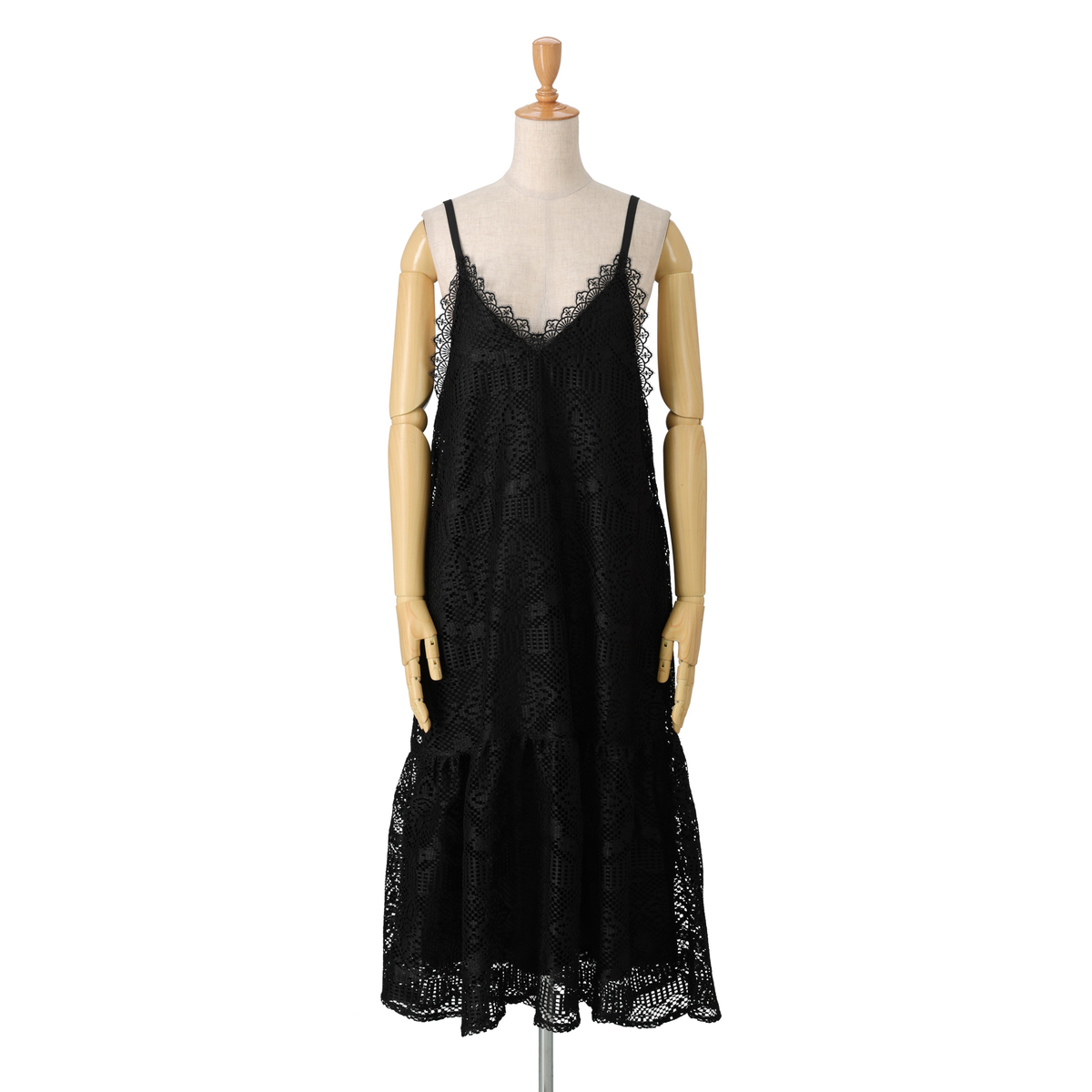 繊細なフラワー柄とスカラップが調和したカギ針風ラッセルレースのキャミドレスです。立体感のある編地と程よいハリ感で、体のラインを拾いにくくきれいなシルエットをキープ。裏地付きでしっかりとした素材感が大人の魅力を引き立てます