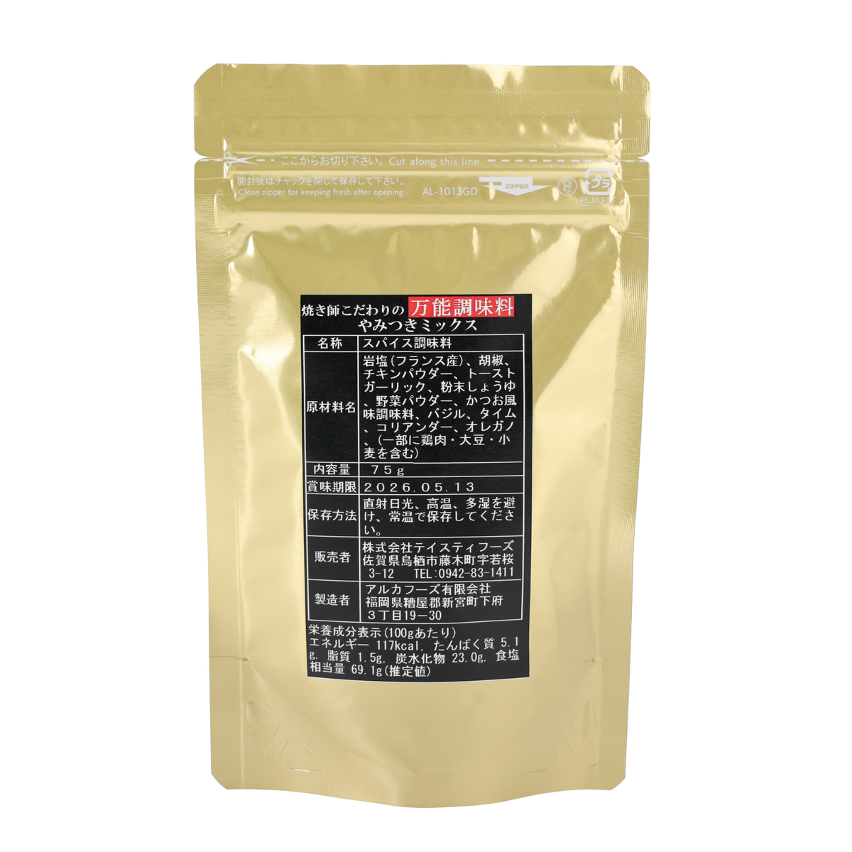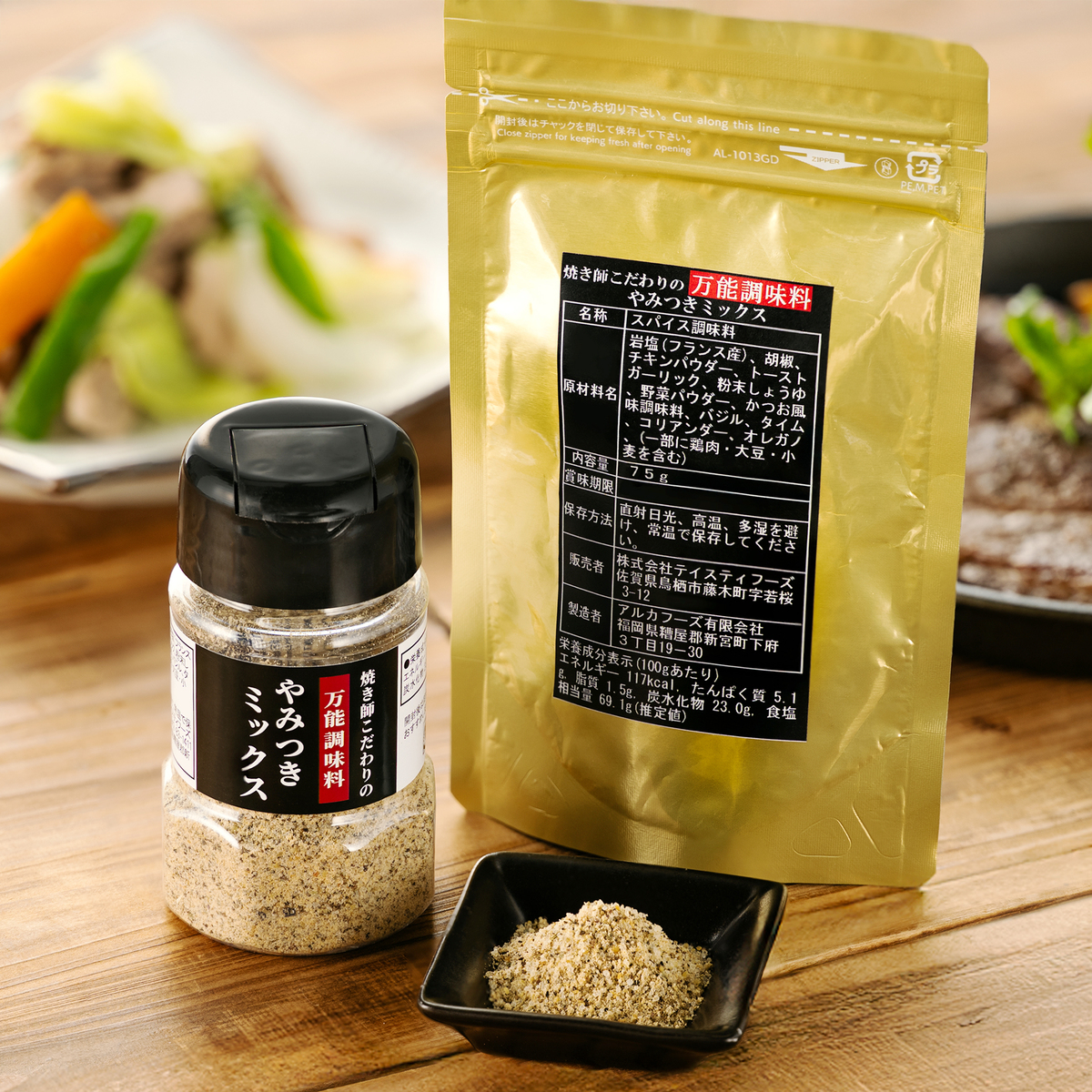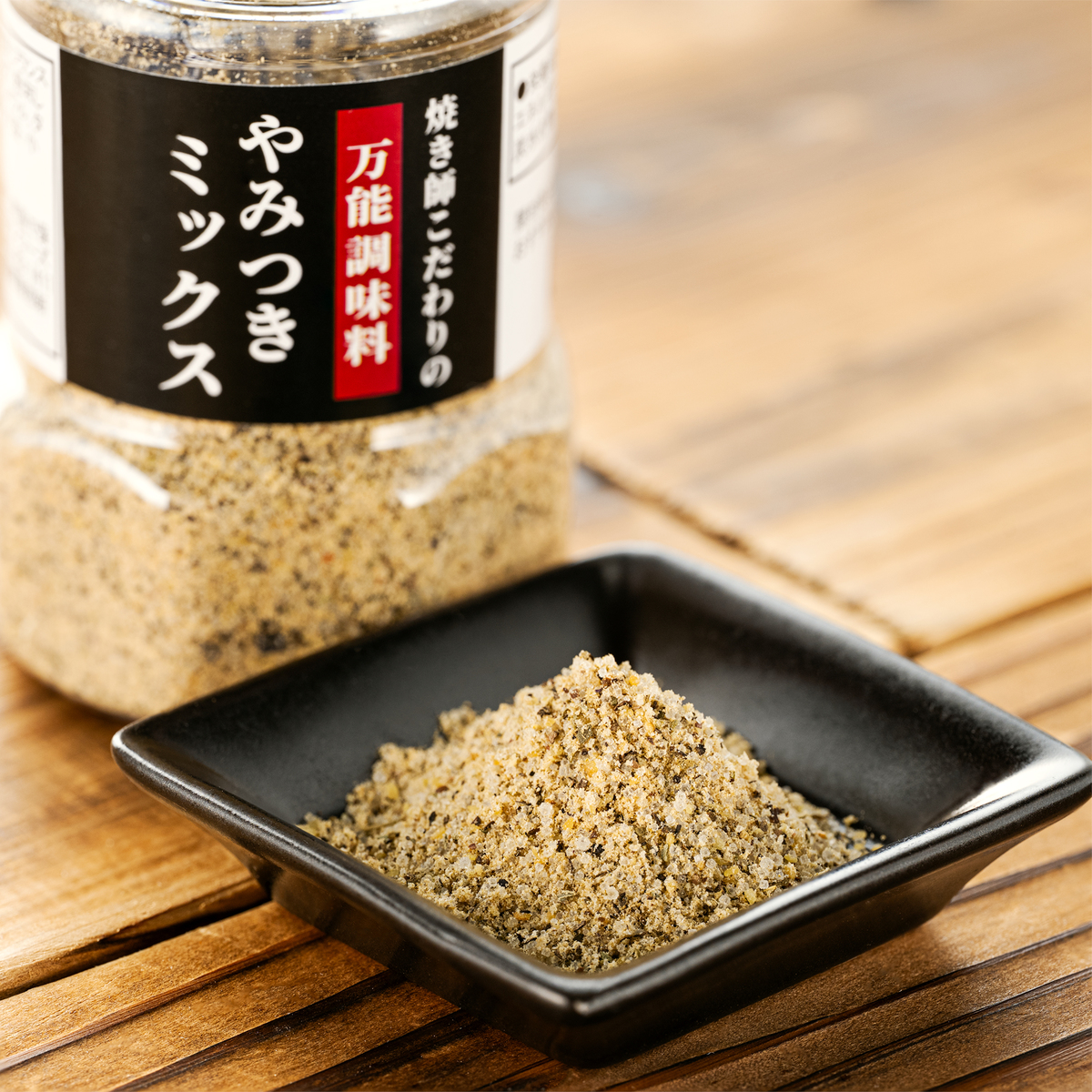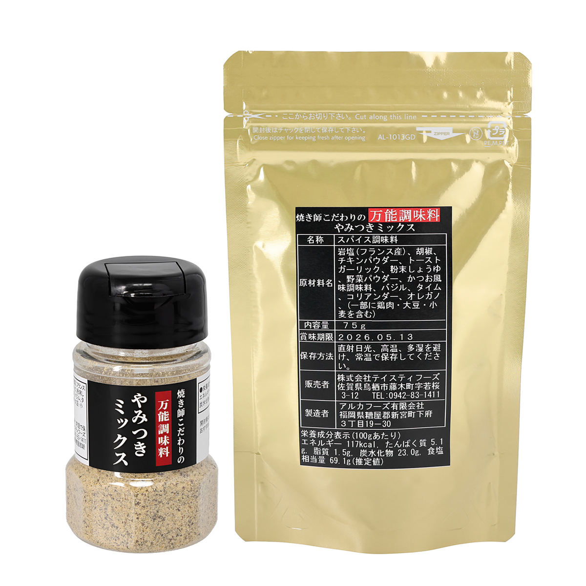 [アレルギー物質特定原材料8品目] 小麦 [商品内容] ・焼き師こだわりの万能調味料 やみつきミックス ボトル75g ・詰替え用75g [保存方法] 開封前:直射日光、高温、多湿を避け、常温で保存してください 開封後:開封後は固まりやすい為、冷蔵庫での保管をおすすめします [お召し上がり方] 使用方法はお客様のお好みで、お肉にかけたり野菜炒め等にも使用できます [原料原産地] 岩塩(フランス産) [原産国] 日本 [原材料] 岩塩(フランス産)、胡椒、チキンパウダー、トーストガーリック、粉末しょうゆ、野菜パウダー、かつお風味調味料、バジル、タイム、コリアンダー、オレガノ、(一部に鶏肉・大豆・小麦を含む)