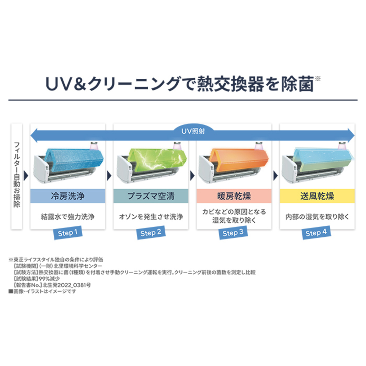 リモコンでUV照射を「ON」にすることでエアコン内の熱交換器に集めた汚れにUV照射を行い、菌(1種類)を抑制(*1)。吸着した汚れは結露水と共に屋外に排出します