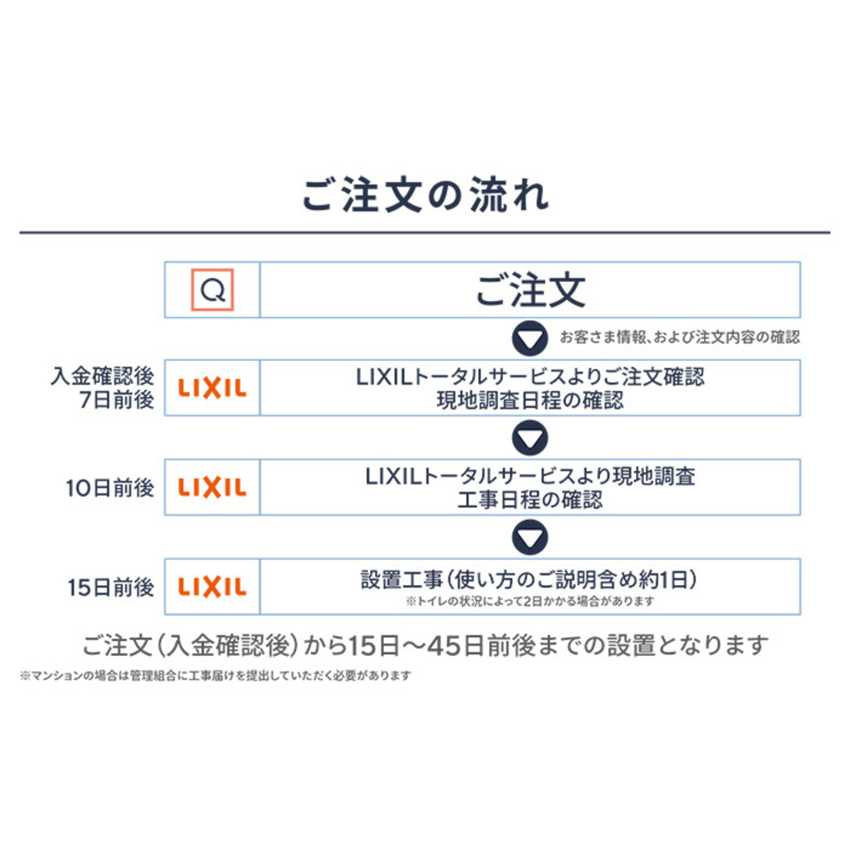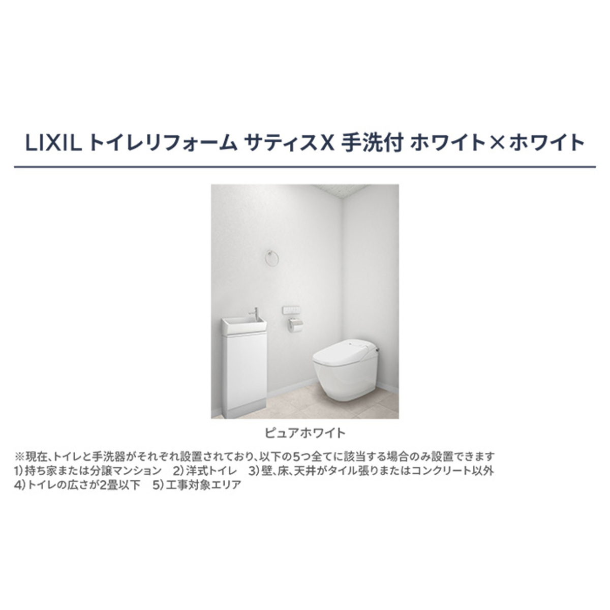 [商品内容] ・サティストイレ ・ペーパーホルダー ・リモコン ・床材・壁紙・天井クロス張替え ・手洗いキャビネット ・タオルリング ・トイレおよび手洗いキャビネット設置工事 ・旧トイレ廃棄処分 <サティストイレ> [サイズ] 幅40×奥行77.5×高さ54cm [重量] 51.5Kg [材質] 本体:陶器製(アクアセラミック) 紙巻器:亜鉛ダイキャスト 紙きり板:ステンレス [消費電力] 1300W 【日本製】 <手洗いキャビネット> [サイズ] 奥行16×カウンター36.5×高さ75.2cm [材質] 手洗い器:陶器製 カウンター:木質材料(表面材:メラミン化粧板) 【陶器:日本製】 [注意事項] <リフォーム対象外トイレ> ・壁、床がタイル張り、またはコンクリート ・和式トイレ ・壁、天井が板張り等、クロス張り以外 ・トイレの広さが2畳以上 ハウスメーカー新築10年以内、または2×4住宅も保証がついている場合はご確認下さい ※化学療法を受けている方、免疫不全症の方など、極度に免疫力が低下して医師の治療を受けている方は、使用に際し医師に相談する ※水道水および飲用可能な井戸水に接続する <サティストイレ> ※ご使用の前に、商品に同梱される取扱説明書の「安全上のご注意」をよくお読みの上、正しくお使い下さい。安全に関する重要な内容を記載していますので、必ずお守り下さい <故障したとき(故障とは「異音/ 異臭/ 発煙/ 高温/ 割れ/ 漏水)> ※コンセントから電源プラグを抜く ※止水栓を閉める ※修理・交換を依頼する? 故障したまま使用しない <全体> ※直射日光を当てないで下さい(変色・作動不良の原因) ※暖房機器を近づけないで下さい(変色・故障の原因) ※スプレーなどを使用する場合は換気して下さい(光沢の消失・故障の原因) <プラスチック部> (便フタ/便座/カバー類/リモコン/ノズルシャッター) ※乾いた布やトイレットペーパーによる拭き取り、およびメラミンスポンジを使用しないで下さい(光沢の消失・キズの原因) ※トイレ用消臭剤をかけないで下さい(光沢の消失・故障の原因) <プラスチック部(スプレッダ)> ※便器鉢内のスプレッダにブラシの柄など、硬いものを当てないで下さい(破損・故障の原因) <便器部(鉢内)> ※便器鉢内にジェル状の洗浄剤を使用しないで下さい(飛沫・故障の原因) <便フタ・便座> ※便フタ/便座の開閉は乱暴に行わないで下さい(故障・破損・漏電の原因) ※便フタカバー・便座カバーは取り付けないで下さい(故障・破損の原因、便フタが倒れるおそれ) <リモコン> ※水や洗剤・薬品( 消毒薬・除菌薬) をかけないで下さい ※濡れた手で操作しないで下さい(故障の原因) <電源プラグ/コンセント> ※電源プラグをコンセントに差し直したり、電源を「入」にした場合は、10秒程度時間をあけて下さい ※便座に触れたまま電源プラグをコンセントに差し込まないで下さい。シャワーが出ない場合があります <便器の詰まりを防ぐ> ※トイレットペーパーを使用して下さい ※1回の洗浄で流れきらないことがあります ※バリウムなど水に溶けにくく、重いものはトイレブラシで細かくしてから、数回水を流して下さい ※大洗浄で一度に流すトイレットペーパーの量は5mを目安にして下さい(JIS 規格を参考にした量) ※配管が詰まるような異物を流さないで下さい ※小用でも使用後は必ず水を流して下さい(洗浄不良や詰まりの原因) <便器が詰まったとき> ※詰まった場合は水を流さず、市販の吸引器(商品名 :ラバーカップ)で異物を取り除いて下さい(汚水があふれて床を汚すおそれ) <泡クリーン・泡クッション> ※補充液は、泡クリーン専用洗剤、泡クッション専用補充液、または台所用中性洗剤を使用して下さい ※次の洗剤を使用しないで下さい(トイレ用洗剤・酸性洗剤・アルカリ性洗剤・塩素系洗剤・柑橘系洗剤・天然由来成分を材料としている洗剤・ジェルタイプの洗剤・食洗機用洗剤 ※種類の異なる洗剤を混ぜないで下さい(故障の原因) ※皮膚に刺激を受ける可能性があるため、補充液が手に付いた際は十分洗い流して下さい(皮膚の炎症のおそれ) ※補充液が垂れた場合は、すぐにやわらかい布でふき取って下さい(変色・くもりの原因) <溜水面が低下した場合> ※バケツなどで少しずつ水を入れ、数回水を流しても溜水面が低下する場合は、LIXIL 修理受付センターまでご連絡下さい(取り扱い説明素の裏表紙) ※溜水面が正常な状態は、溜水の縦幅がトラップ入り口の縦幅の3 倍以上です※これより溜水の縦幅が小さい場合は溜水が低下していると判断して下さい