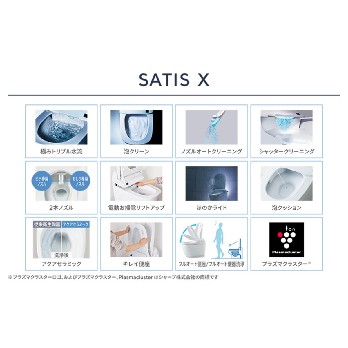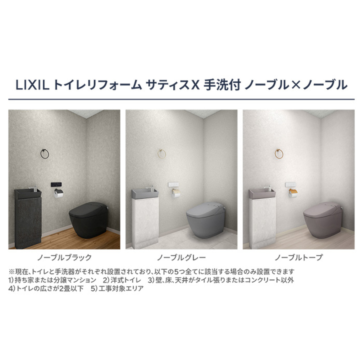 [商品内容] ・サティストイレ ・ペーパーホルダー ・リモコン ・床材・壁紙・天井クロス張替え ・手洗いキャビネット ・タオルリング ・トイレおよび手洗いキャビネット設置工事 ・旧トイレ廃棄処分 <サティストイレ> [サイズ] 幅40×奥行77.5×高さ54cm [重量] 51.5Kg [材質] 本体:陶器製(アクアセラミック) 紙巻器:亜鉛ダイキャスト 紙きり板:ステンレス [消費電力] 1300W 【日本製】 <手洗いキャビネット> [サイズ] 36.5×18(カウンター奥行16)×96.5cm [材質] <手洗器>陶器製 <キャビネット本体・扉> 表面材:DAP化粧板、低圧メラミン化粧板、ウレタン化粧紙 <底板> 表面材:ポリエステル化粧板、コート紙 <カウンター> 表面材:メラミン化粧板 [消費電力] 自動水洗:2.0W 【陶器:日本製】 [注意事項] <リフォーム対象外トイレ> ・壁、床がタイル張り、またはコンクリート ・和式トイレ ・壁、天井が板張り等、クロス張り以外 ・トイレの広さが2畳以上 ハウスメーカー新築10年以内、または2×4住宅も保証がついている場合はご確認下さい ※化学療法を受けている方、免疫不全症の方など、極度に免疫力が低下して医師の治療を受けている方は、使用に際し医師に相談する ※水道水および飲用可能な井戸水に接続する <サティストイレ> ※ご使用の前に、商品に同梱される取扱説明書の「安全上のご注意」をよくお読みの上、正しくお使い下さい。安全に関する重要な内容を記載していますので、必ずお守り下さい <故障したとき(故障とは「異音/ 異臭/ 発煙/ 高温/ 割れ/ 漏水)> ※コンセントから電源プラグを抜く ※止水栓を閉める ※修理・交換を依頼する ※故障したまま使用しない <全体> ※直射日光を当てないで下さい(変色・作動不良の原因) ※暖房機器を近づけないで下さい(変色・故障の原因) ※スプレーなどを使用する場合は換気して下さい(光沢の消失・故障の原因) <プラスチック部> (便フタ/ 便座/カバー類/リモコン/ノズルシャッター) ※乾いた布やトイレットペーパーによる拭き取り、およびメラミンスポンジを使用しないで下さい (光沢の消失・キズの原因) ※トイレ用消臭剤をかけないで下さい(光沢の消失・故障の原因) <プラスチック部(スプレッダ)> ※便器鉢内のスプレッダにブラシの柄など、硬いものを当てないで下さい(破損・故障の原因) <便器部(鉢内)> ※便器鉢内にジェル状の洗浄剤を使用しないで下さい(飛沫・故障の原因) <便フタ・便座> ※便フタ/ 便座の開閉は乱暴に行わないで下さい(故障・破損・漏電の原因) ※便フタカバー・便座カバーは取り付けないで下さい(故障・破損の原因、便フタが倒れるおそれ) <リモコン> ※水や洗剤・薬品( 消毒薬・除菌薬) をかけないで下さい ※濡れた手で操作しないで下さい(故障の原因) <電源プラグ/コンセント> ※電源プラグをコンセントに差し直したり、電源を「入」にした場合は、10秒程度時間をあけて下さい ※便座に触れたまま電源プラグをコンセントに差し込まないで下さい。シャワーが出ない場合があります <便器の詰まりを防ぐ> ※トイレットペーパーを使用して下さい ※1回の洗浄で流れきらないことがあります ※バリウムなど水に溶けにくく、重いものはトイレブラシで細かくしてから、数回水を流して下さい ※大洗浄で一度に流すトイレットペーパーの量は5mを目安にして下さい(JIS規格を参考にした量) ※配管が詰まるような異物を流さないで下さい ※小用でも使用後は必ず水を流して下さい(洗浄不良や詰まりの原因) <便器が詰まったとき> ※詰まった場合は水を流さず、市販の吸引器(商品名:ラバーカップ)で異物を取り除いて下さい(汚水があふれて床を汚すおそれ) <泡クリーン・泡クッション> ※補充液は、泡クリーン専用洗剤、泡クッション専用補充液、または台所用中性洗剤を使用して下さい ※次の洗剤を使用しないで下さい(トイレ用洗剤・酸性洗剤・アルカリ性洗剤・塩素系洗剤・柑橘系洗剤・天然由来成分を材料としている洗剤・ジェルタイプの洗剤・食洗機用洗剤 ※種類の異なる洗剤を混ぜないで下さい(故障の原因) ※皮膚に刺激を受ける可能性があるため、補充液が手に付いた際は十分洗い流して下さい(皮膚の炎症のおそれ) ※補充液が垂れた場合は、すぐにやわらかい布でふき取って下さい(変色・くもりの原因) <溜水面が低下した場合> ※バケツなどで少しずつ水を入れ、数回水を流しても溜水面が低下する場合は、LIXIL 修理受付センターまでご連絡下さい