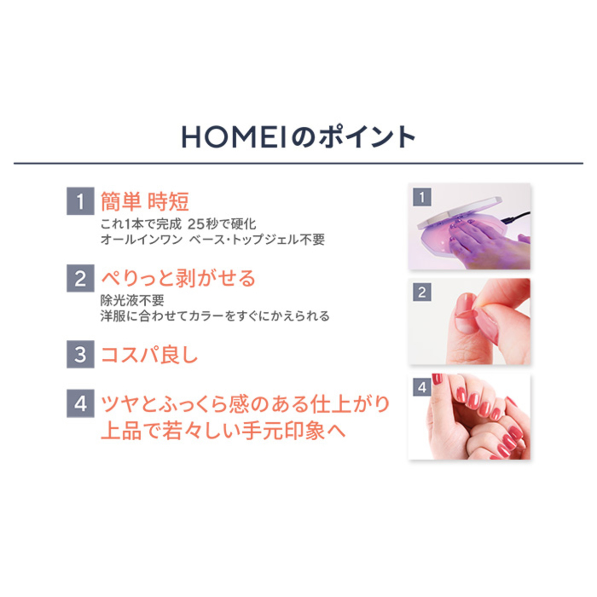 ジェルネイルは1度サロンで使いましたが、お手入れ、剥がす時も大変です。 普通のネイルでさえ、自分で塗っても乾くまで大変。失敗が多いです。 このHOMEIのジェルネイルは、25秒で濡れること。(仕上がる)また、撮りたい時に剥がせる。 これはとても便利。忙しい時間でもネイルお手入れまで完了できます。 助かります。