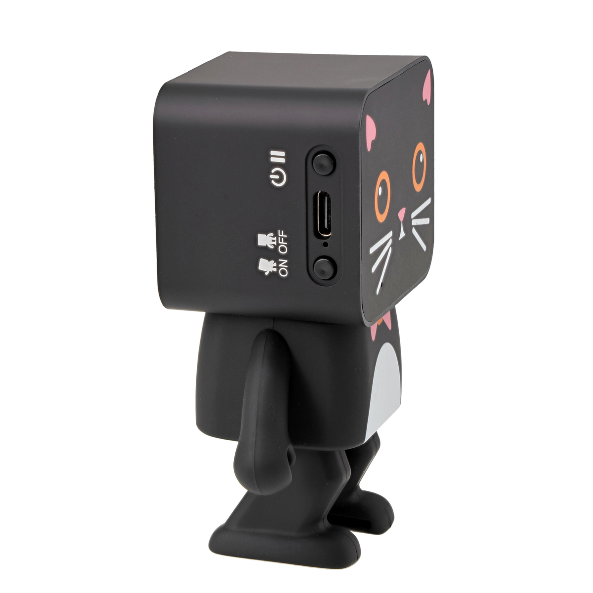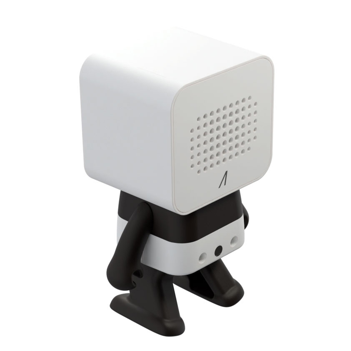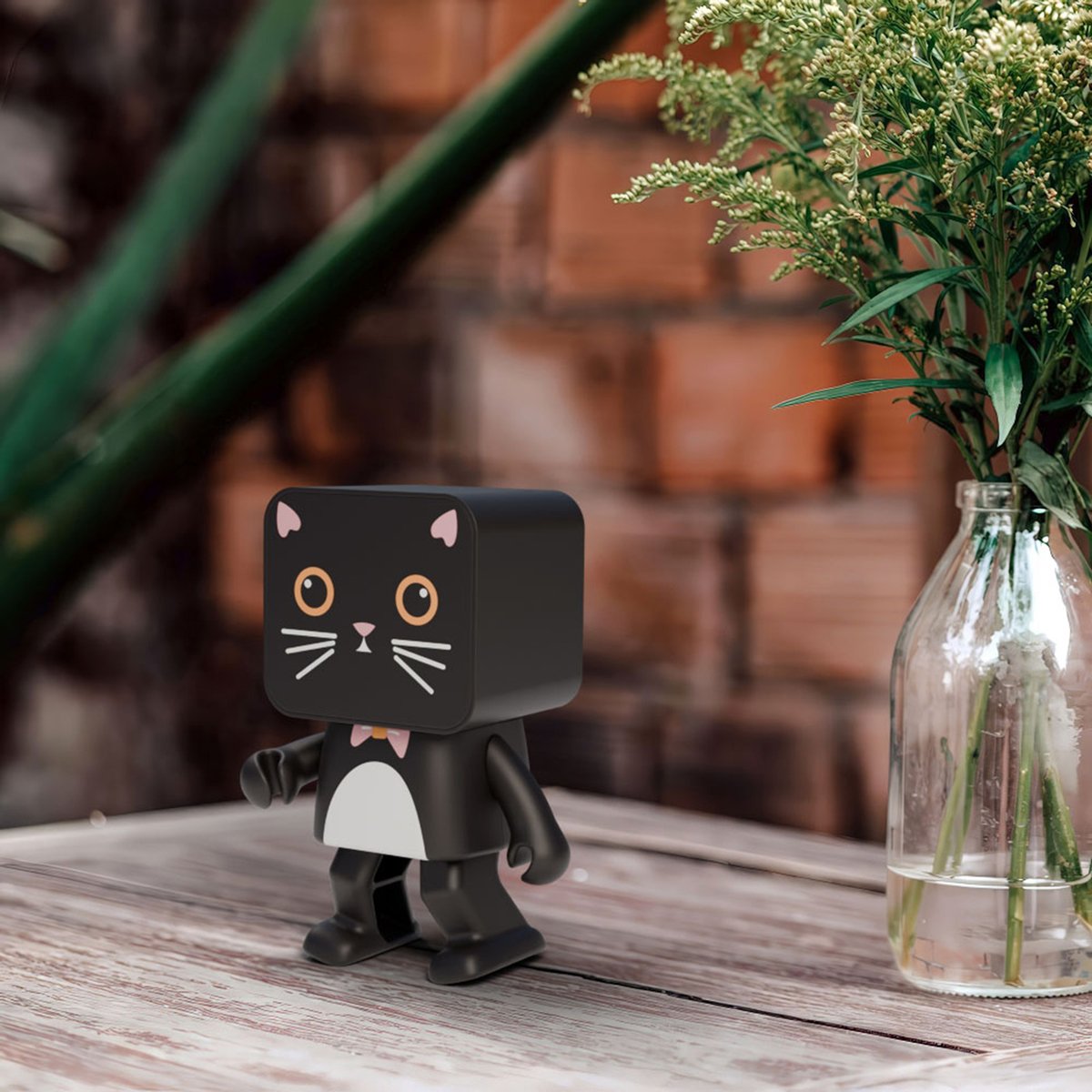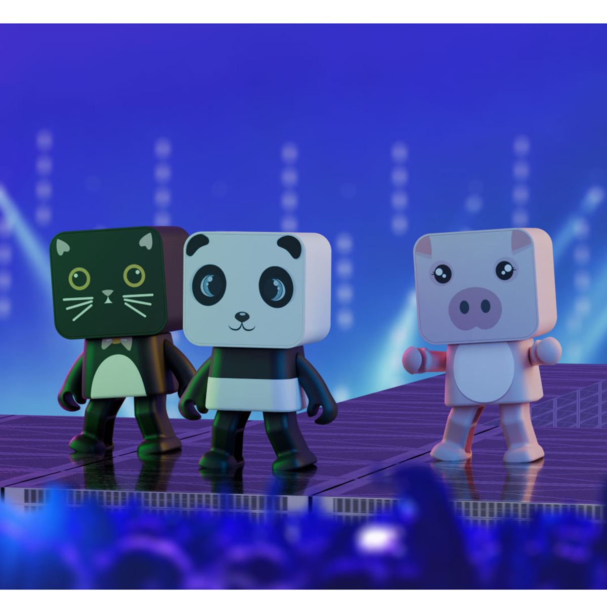 再生音(音楽等)に合わせてダンスするスピーカー。ダンスのスピードは「通常スイング」「少し早いスイング」の2パターンで、「ON OFFボタン」を押すごとに、通常スイング→少し早いスイング→停止の順で切り替わります。スマートフォンとはブルートゥースで接続します(スマートフォンがBluetooth対応機種であること)