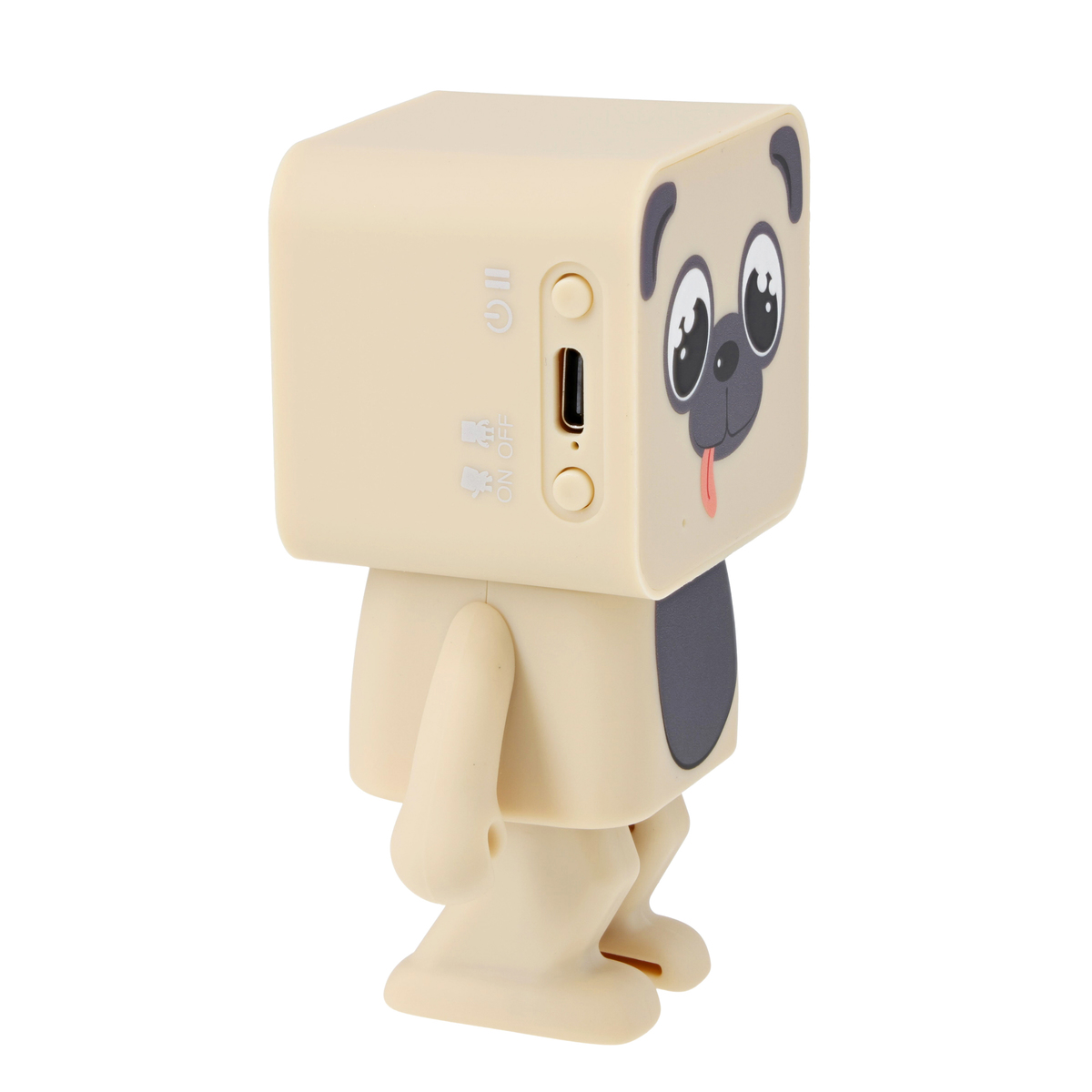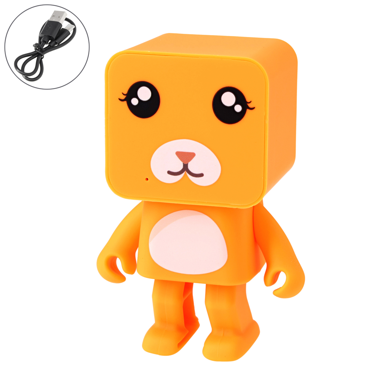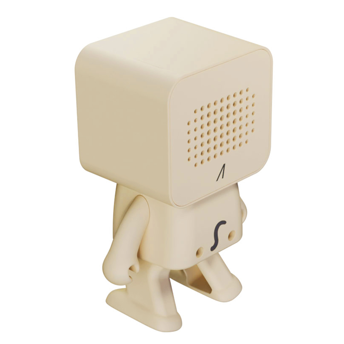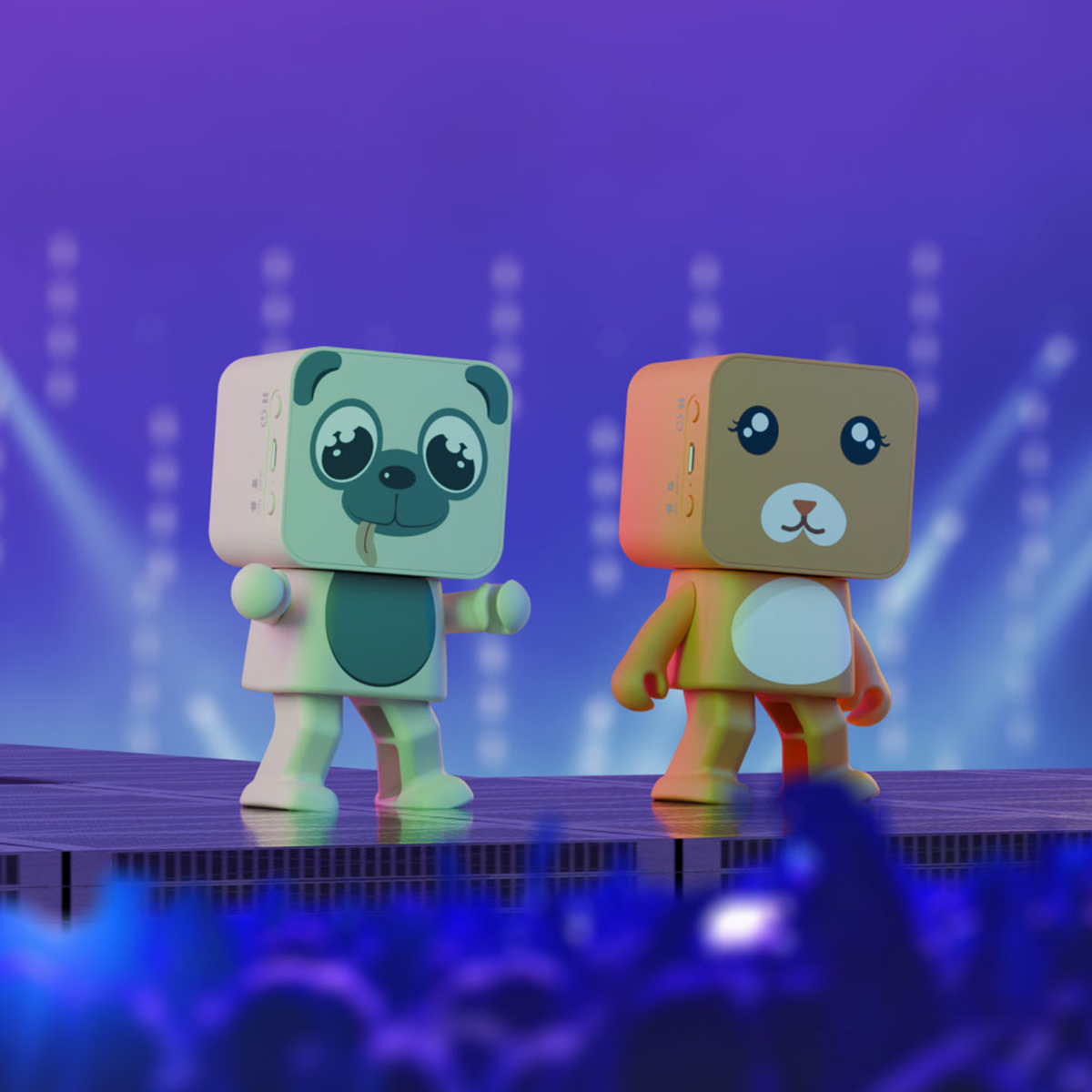 再生音(音楽等)に合わせてダンスするスピーカー。ダンスのスピードは「通常スイング」「少し早いスイング」の2パターンで、「ON OFFボタン」を押すごとに、通常スイング→少し早いスイング→停止の順で切り替わります。スマートフォンとはブルートゥースで接続します(スマートフォンがBluetooth対応機種であること)
