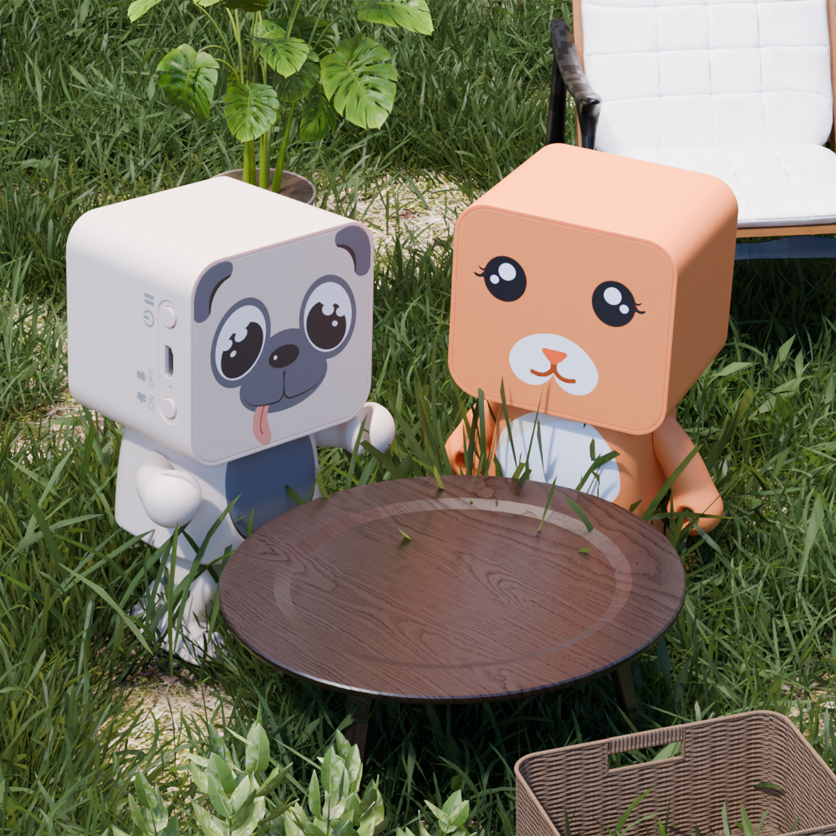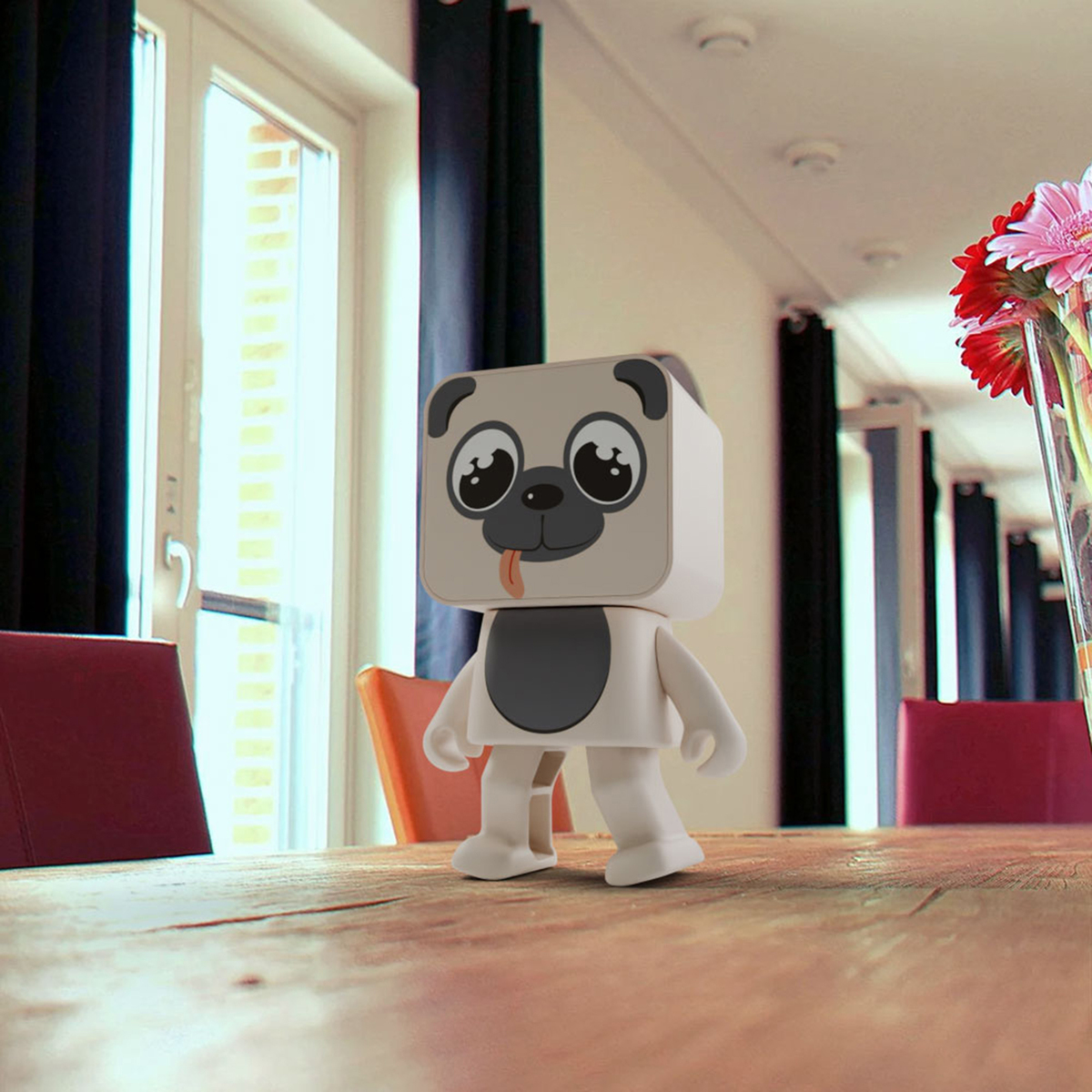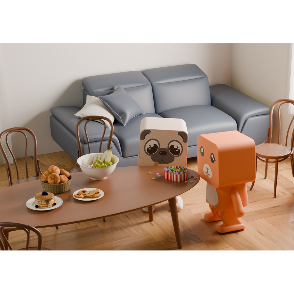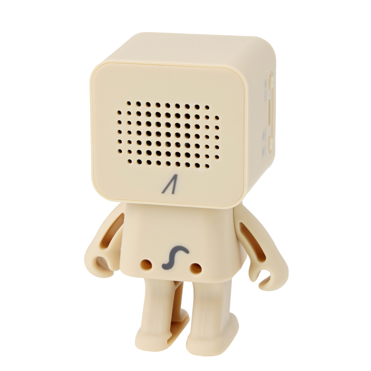 再生音(音楽等)に合わせてダンスするスピーカー。ダンスのスピードは「通常スイング」「少し早いスイング」の2パターンで、「ON OFFボタン」を押すごとに、通常スイング→少し早いスイング→停止の順で切り替わります。スマートフォンとはブルートゥースで接続します(スマートフォンがBluetooth対応機種であること)
