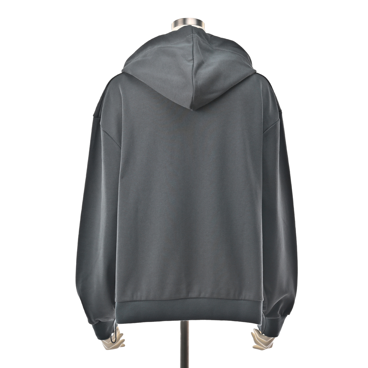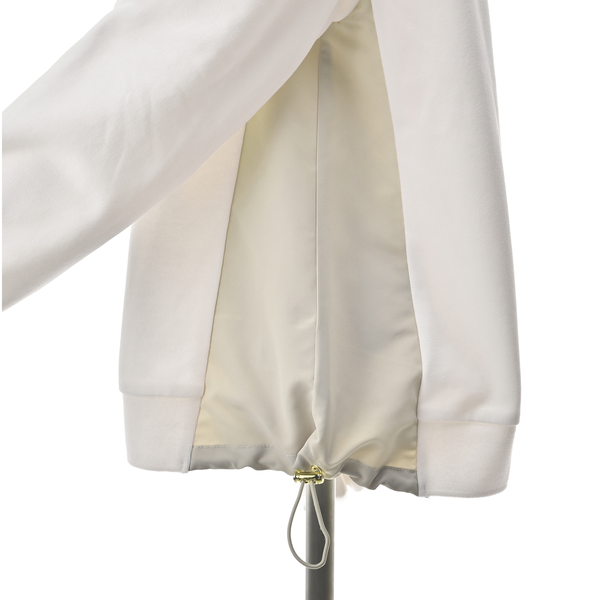 綿混の裏毛素材とハリ感のある布帛素材を組合せたロゴパーカー。異素材を使用しながらも、それぞれのカラーが上手くなじむような配色感に。ポリエステル混の裏毛素材が軽やかで、打ち込みの細かい布帛生地をが上品な雰囲気をプラスしています