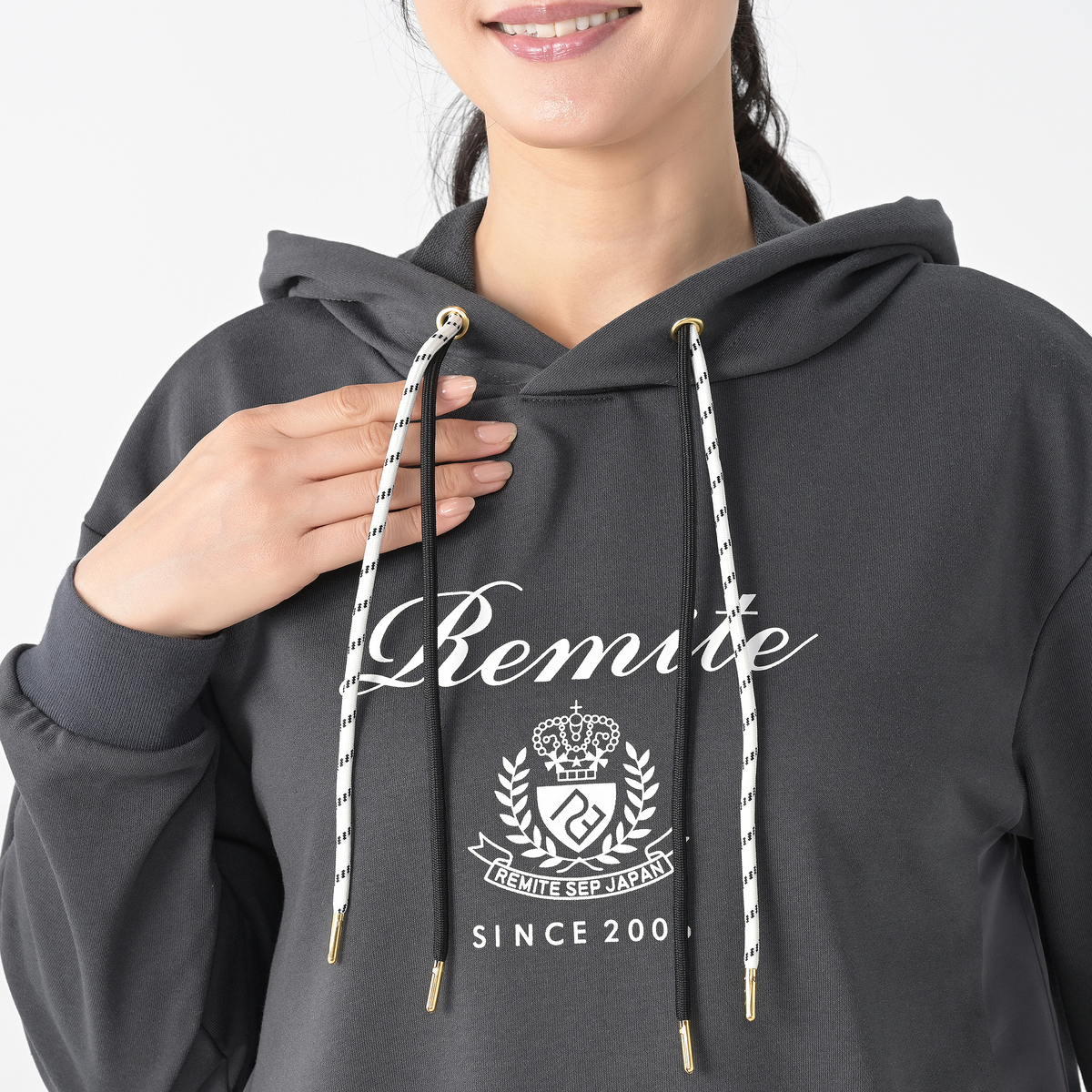 お気に入りブランドremiteのロゴいりパーカーなので、即決、パーカーの厚さも今の時期にピッタリ、寒くなってきたら、インナーとして厚すぎずちょうどいい肉感、色も黒ではないカラー選びが、良いです、丈感もウエストあたりにダブつかないのが、パンツにもスカートにもOKでした!