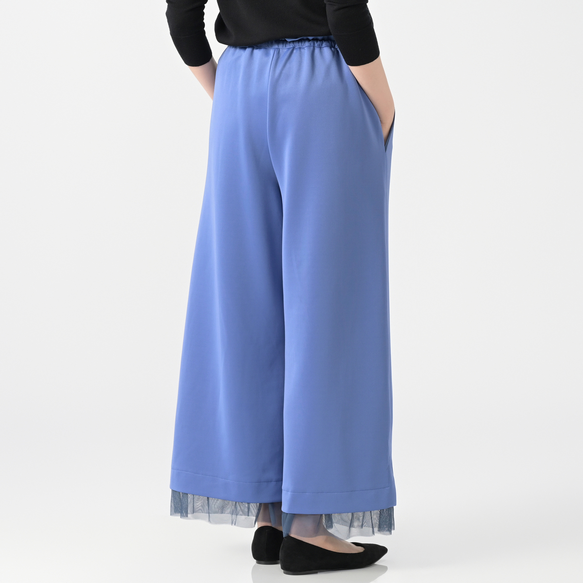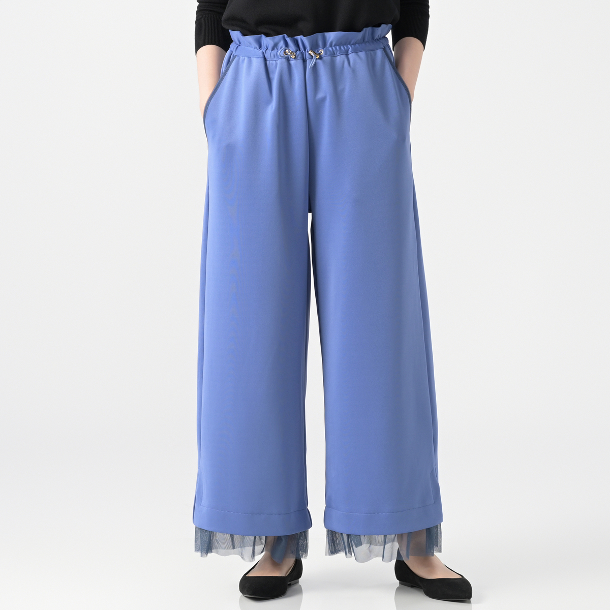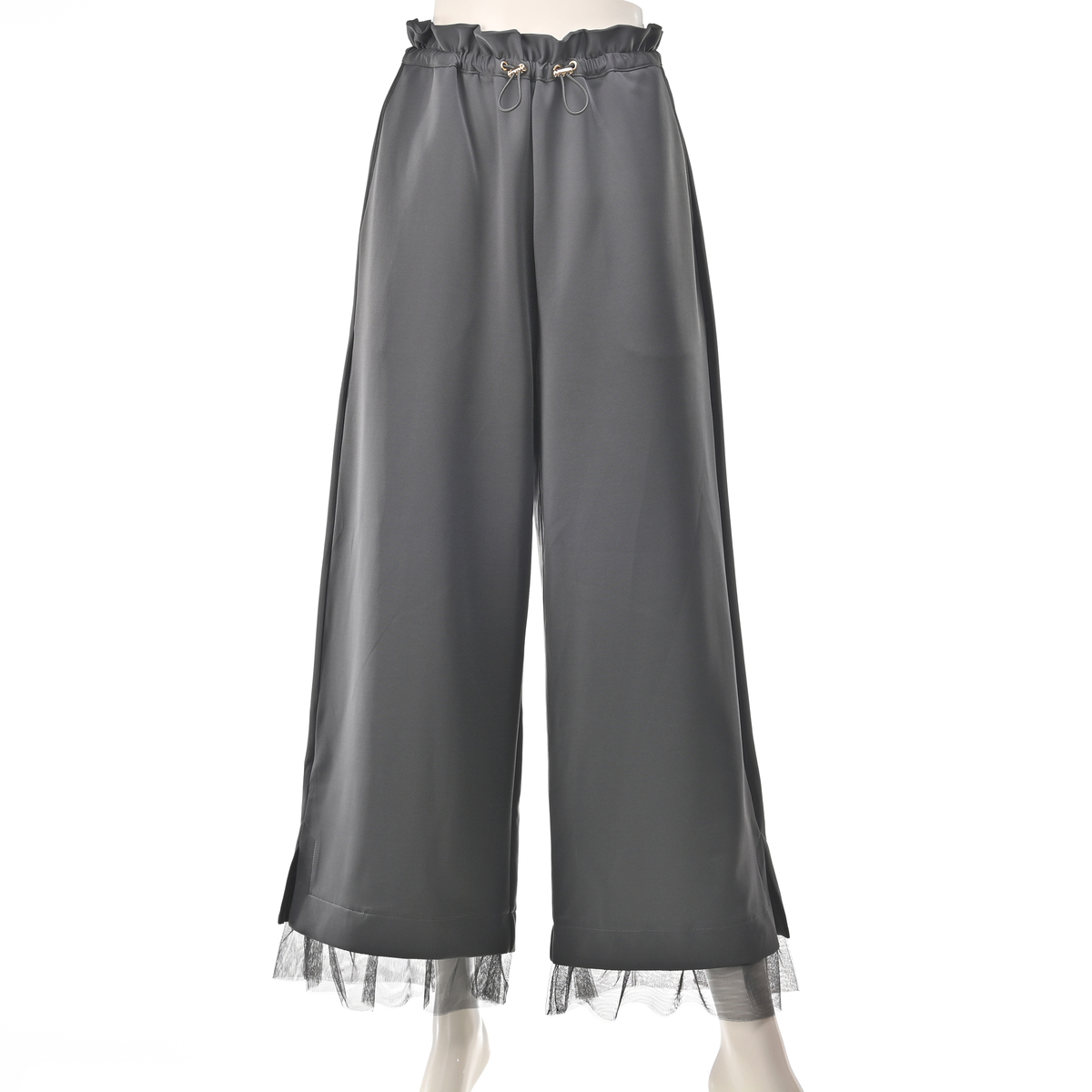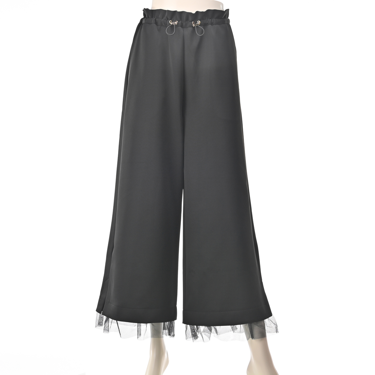 裾にあしらったチュールがポイントのワイドパンツ。チュールの透け感が全体を軽やかに見せてくれます。ウエストはラクに穿ける総ゴム仕様です