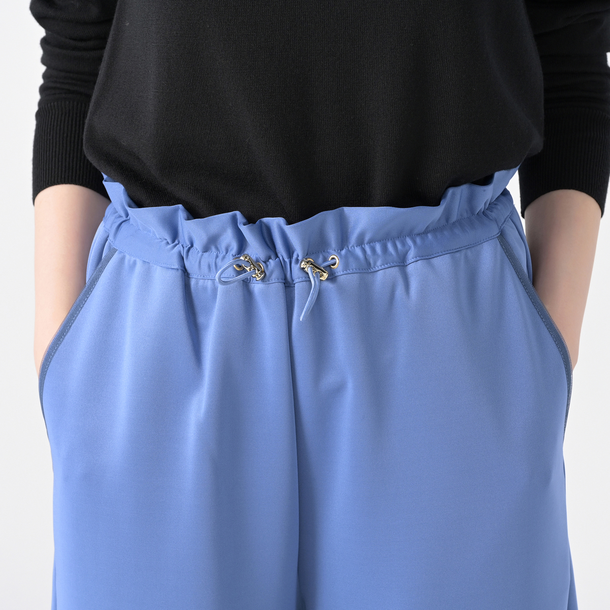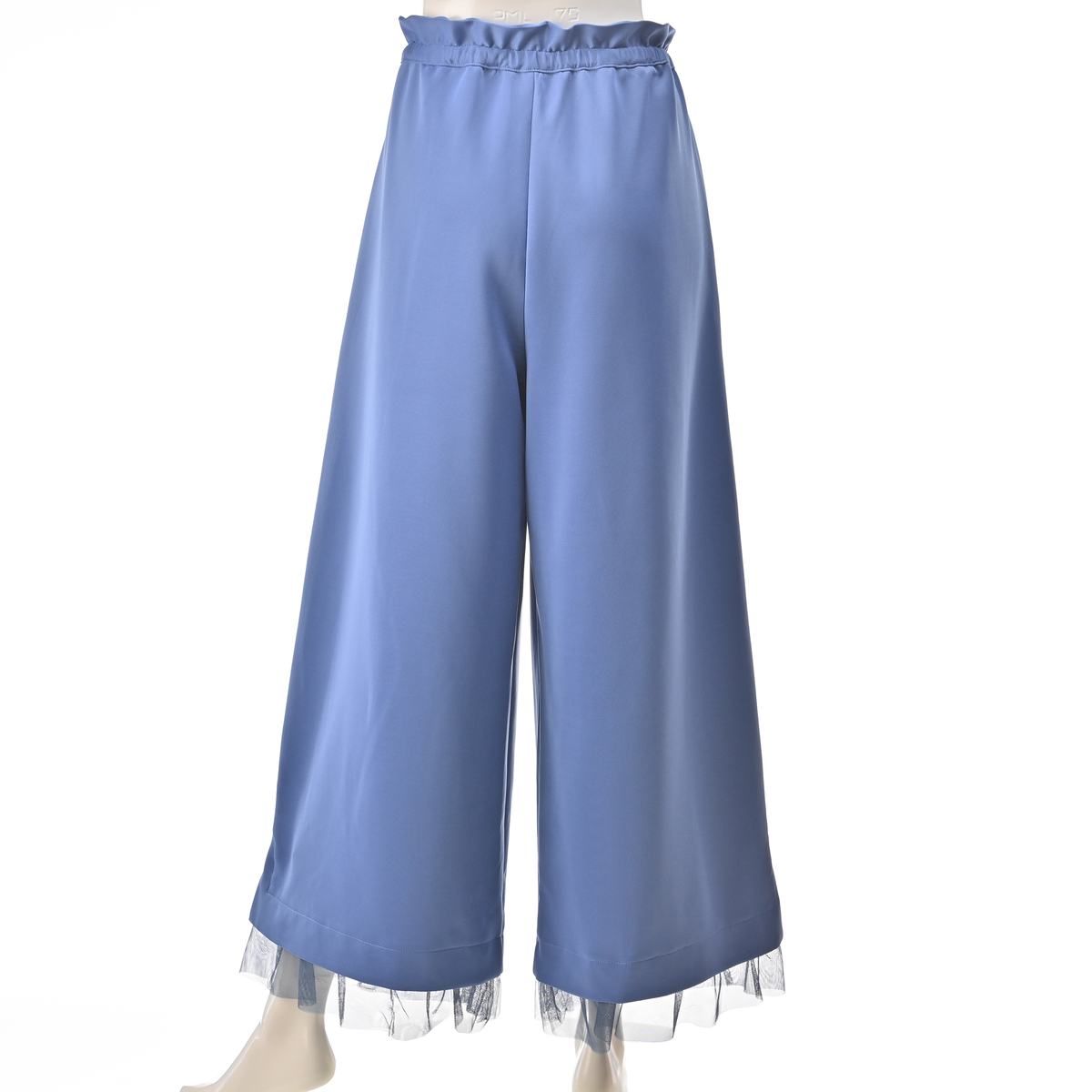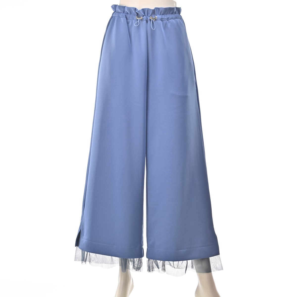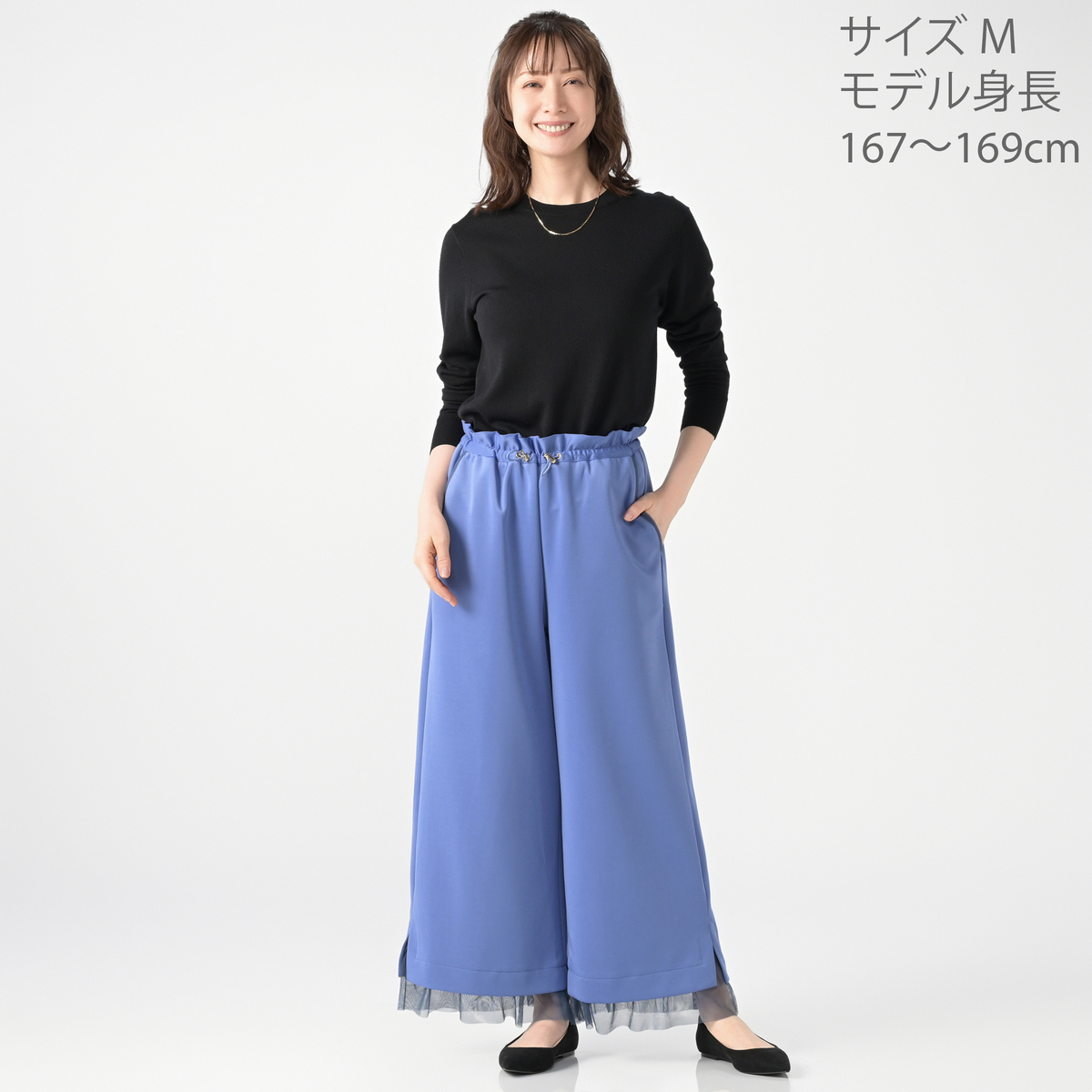 裾にあしらったチュールがポイントのワイドパンツ。チュールの透け感が全体を軽やかに見せてくれます。ウエストはラクに穿ける総ゴム仕様です