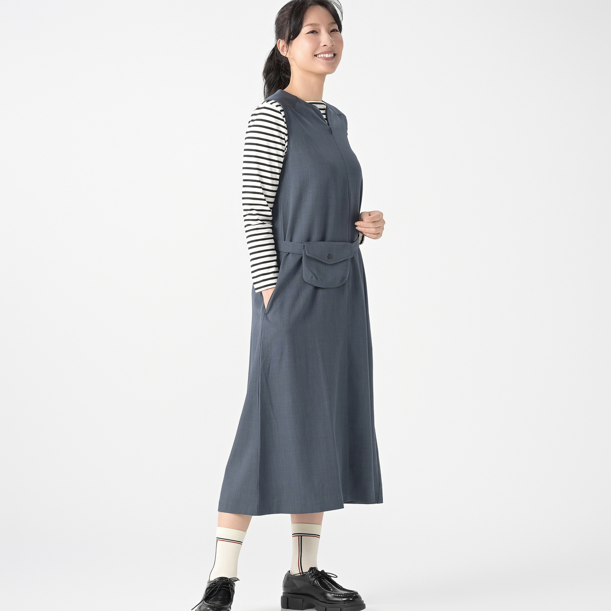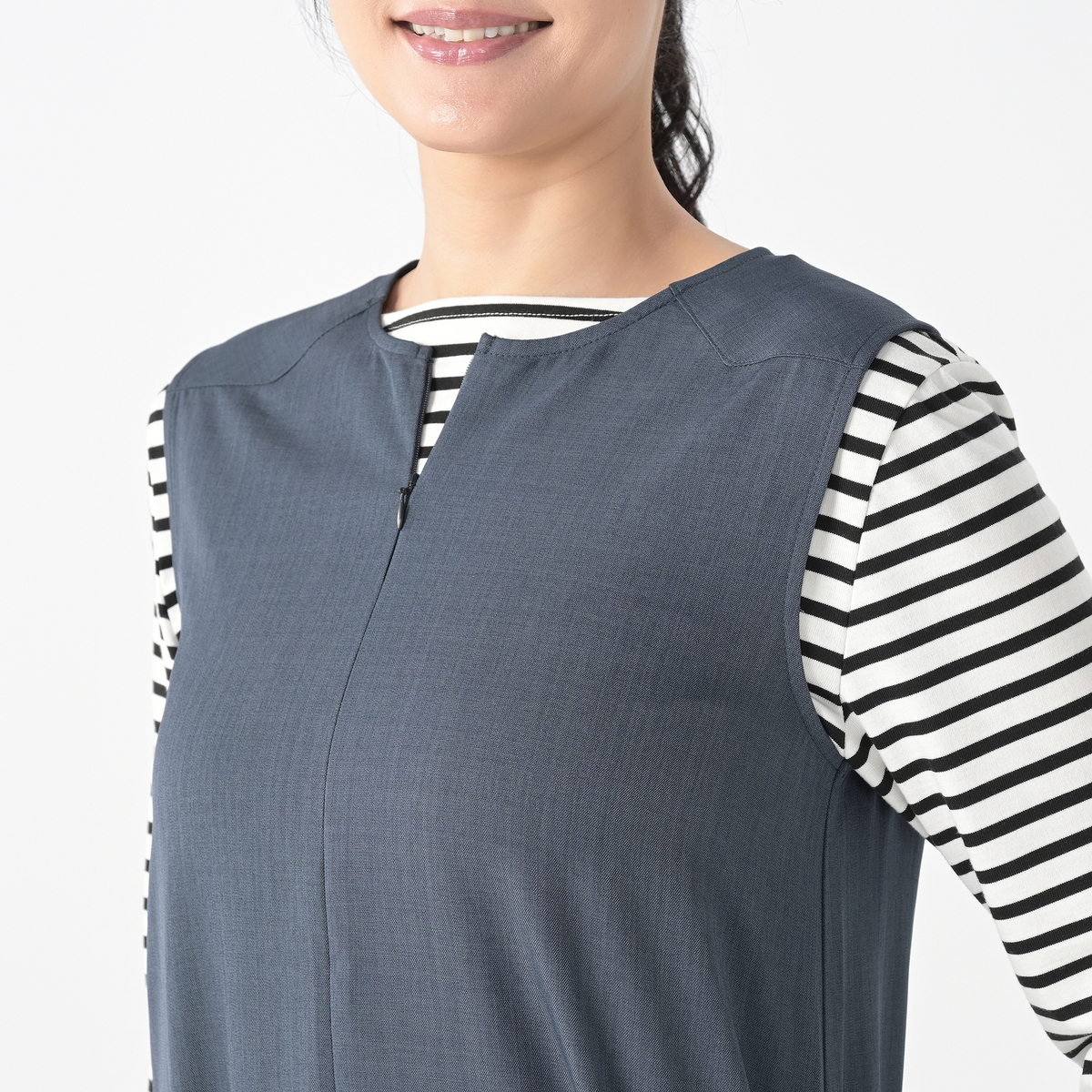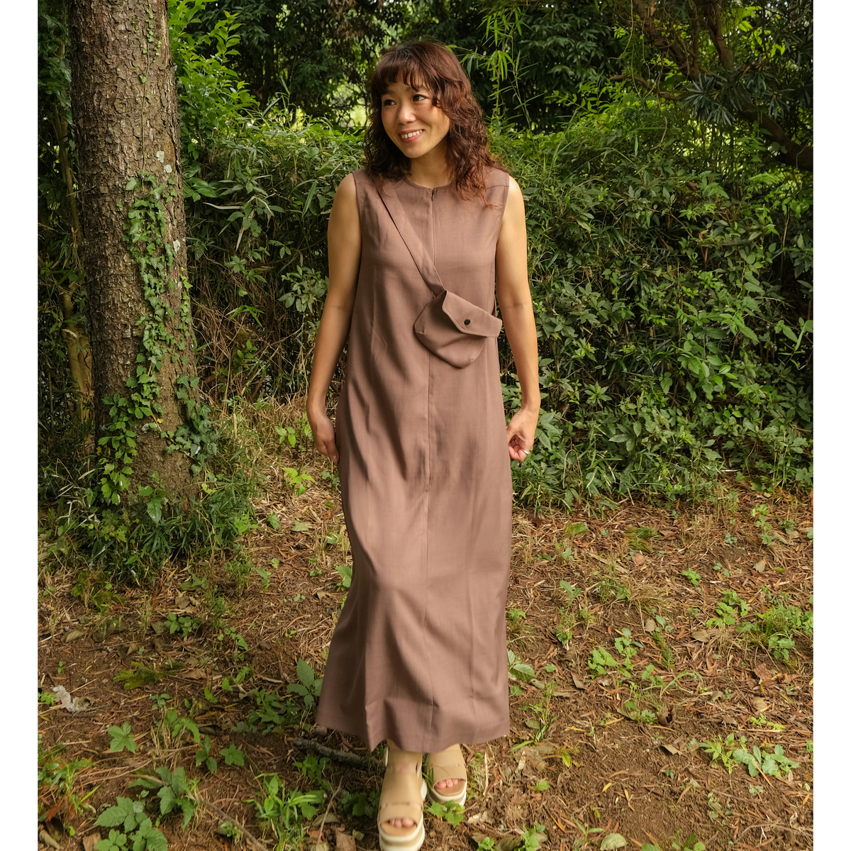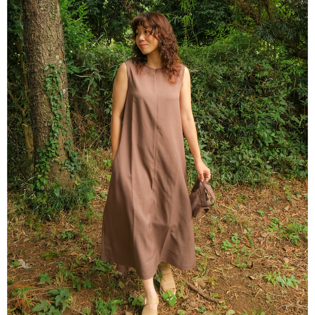 シンプルなノースリーブのワンピース。裾に向け少し開いたIラインで、ラウンドネック、前中心のコンシール開き、肩ヨークの切り替えをアクセントとしたデザインです。後ろベンツで脚さばきが良く、中にTシャツを着ても様になります。左右にはポケット付きです