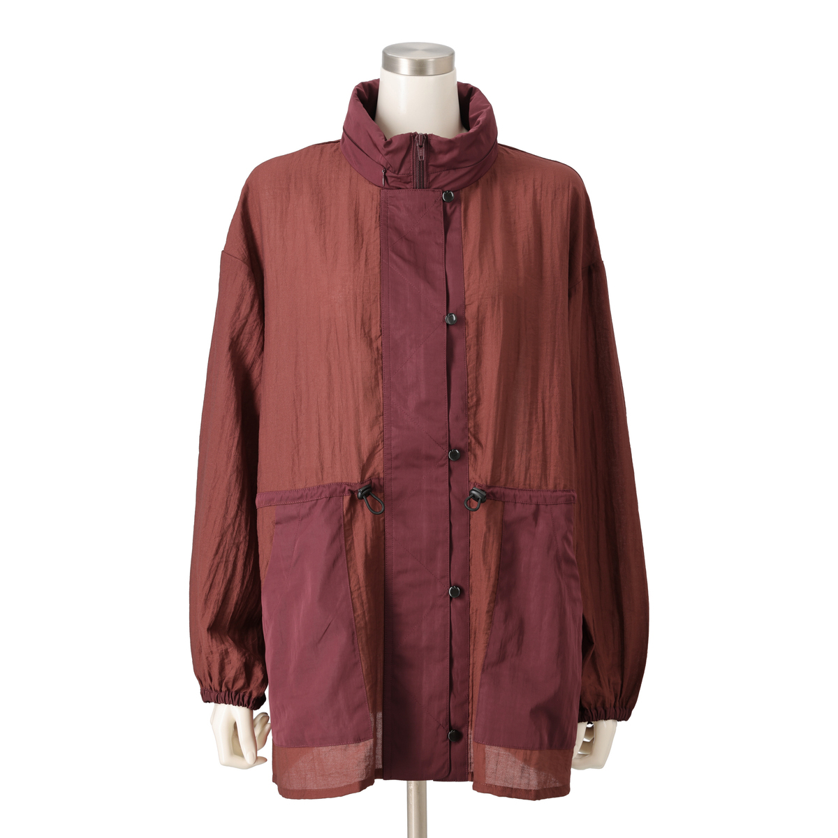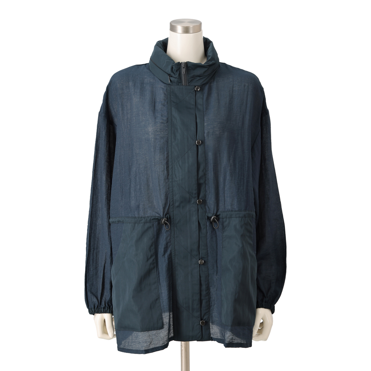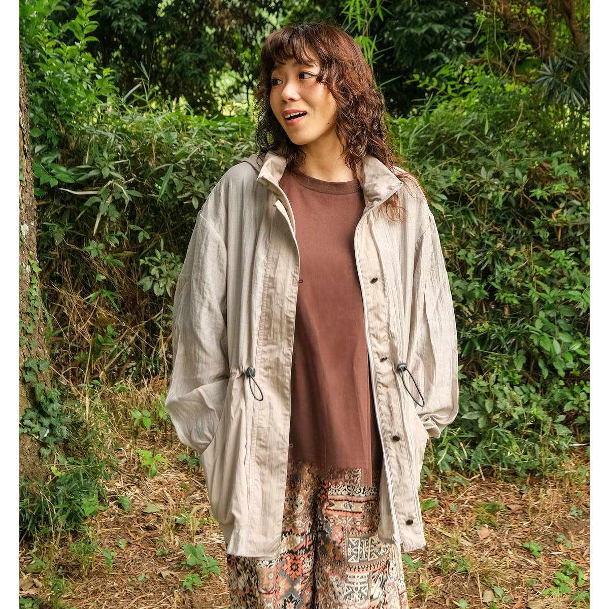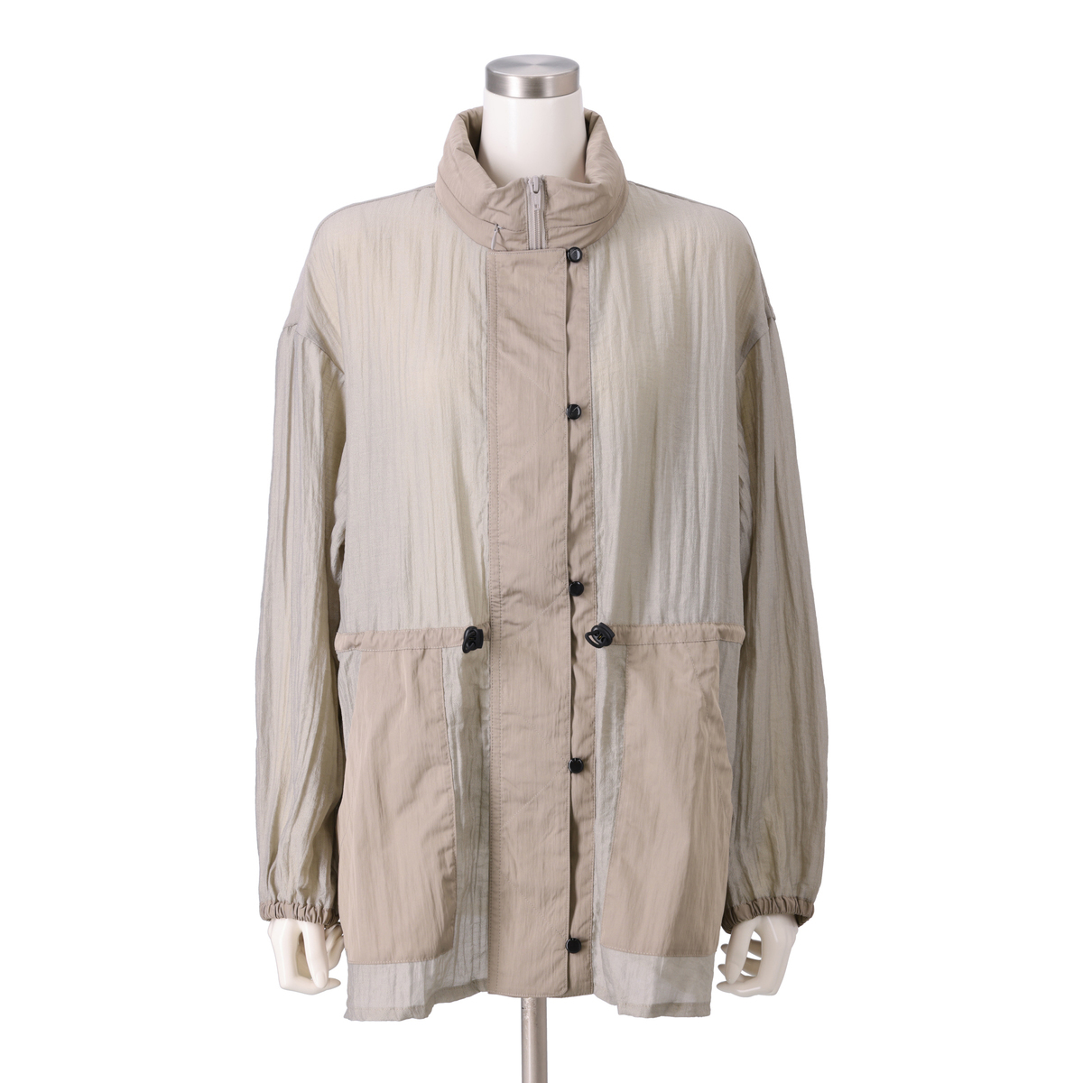 やや透け感のあるクレープ素材を使用。ナチュラルなシボ感で、通気性もある素材です。同系色のポリエステルナイロン混のタフタを組合せたライトジャケットです