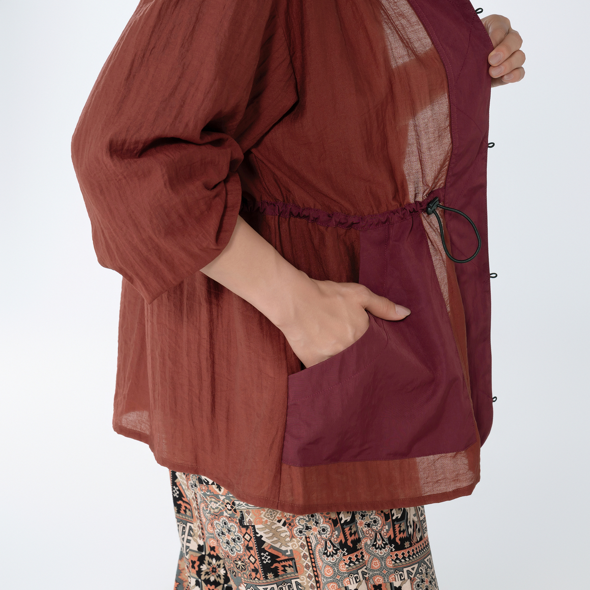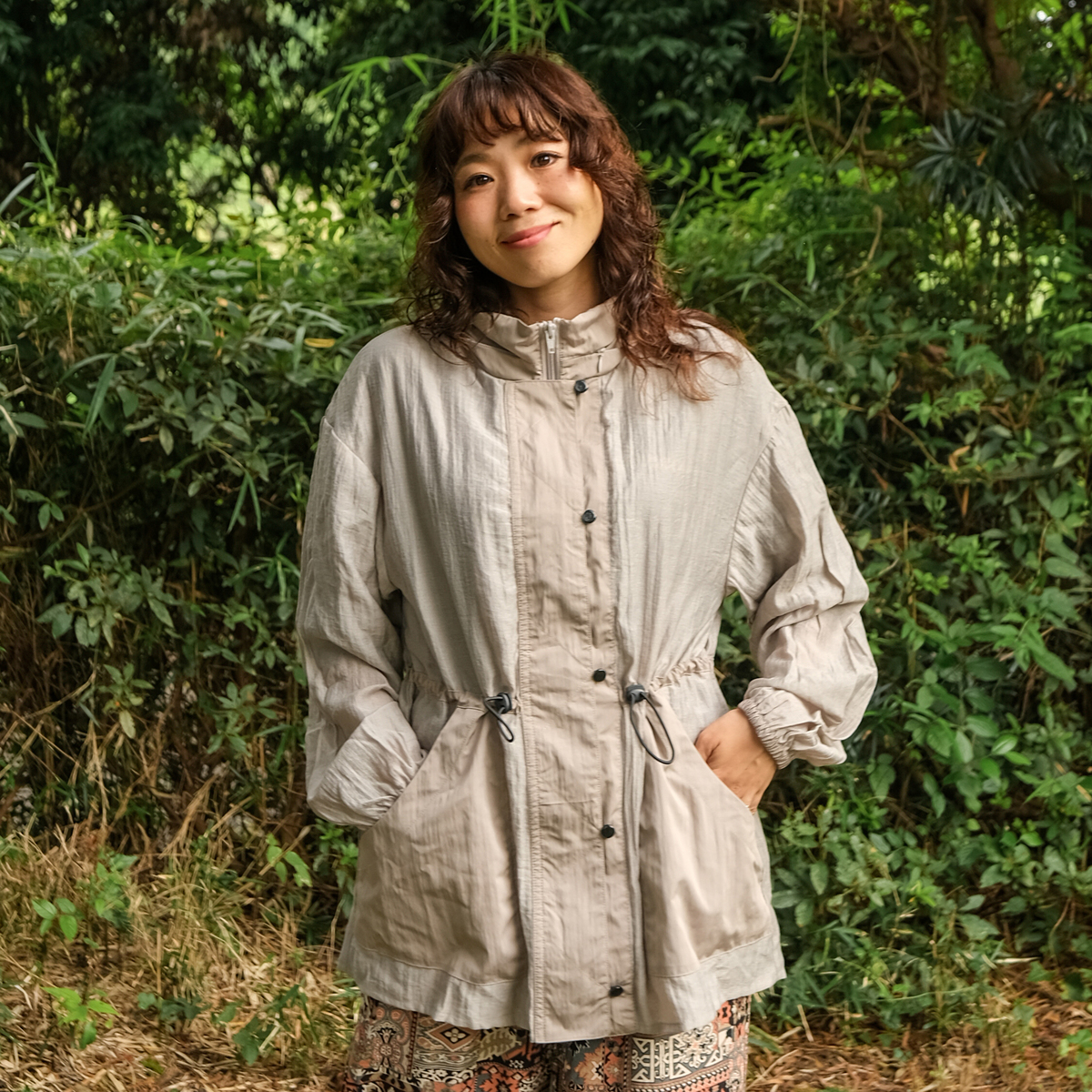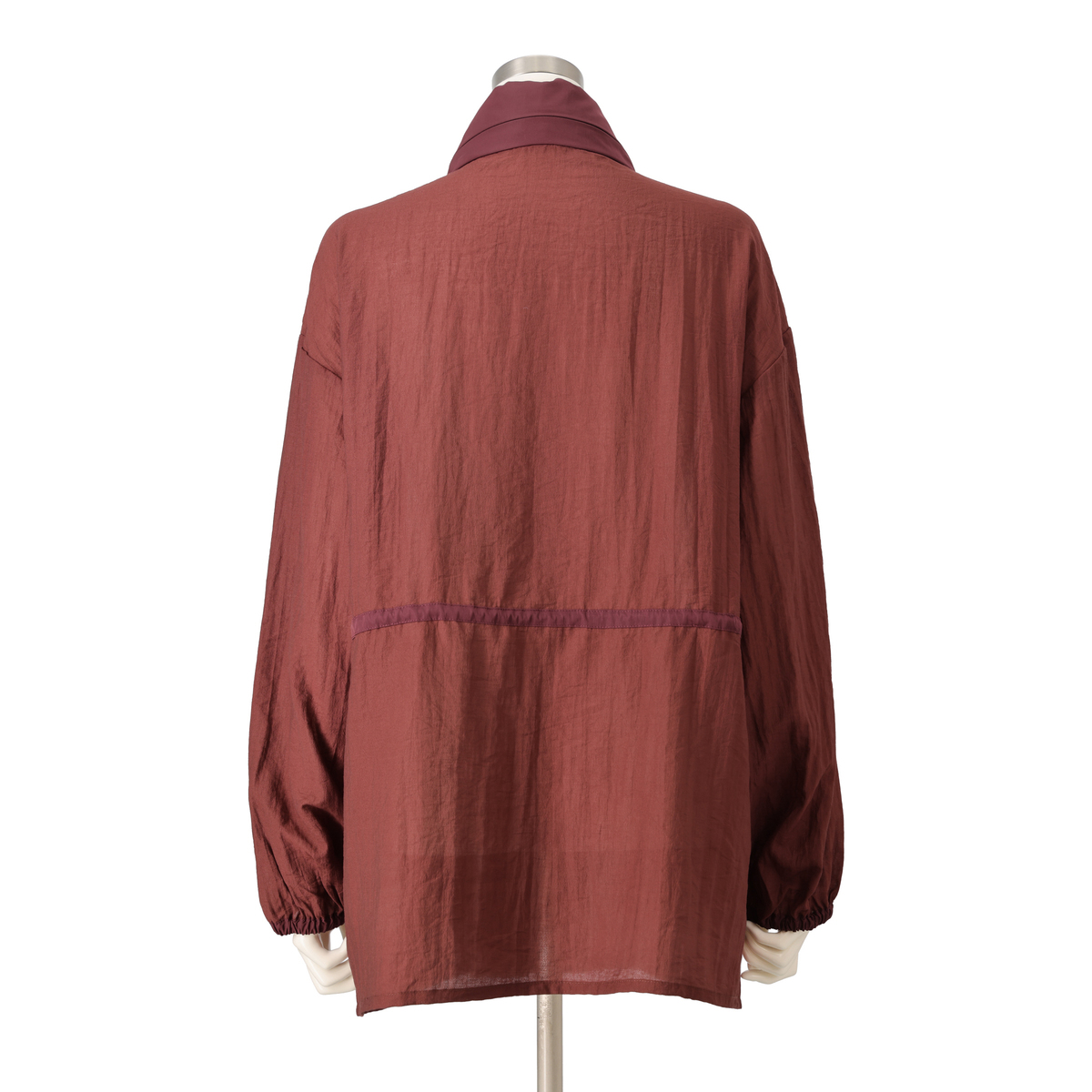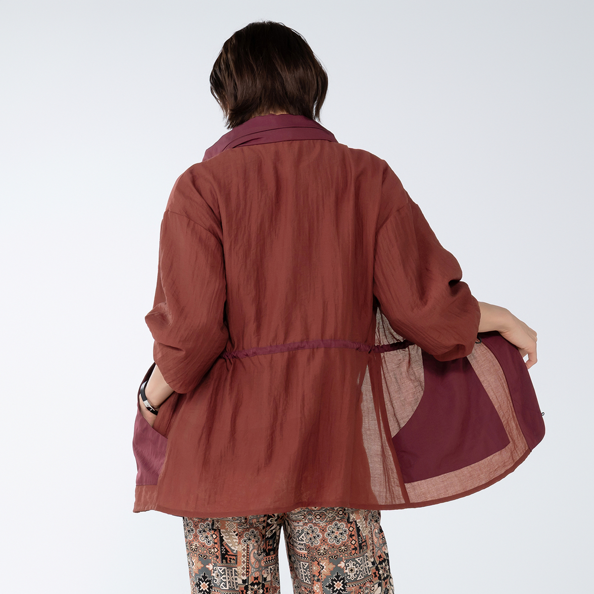 やや透け感のあるクレープ素材を使用。ナチュラルなシボ感で、通気性もある素材です。同系色のポリエステルナイロン混のタフタを組合せたライトジャケットです