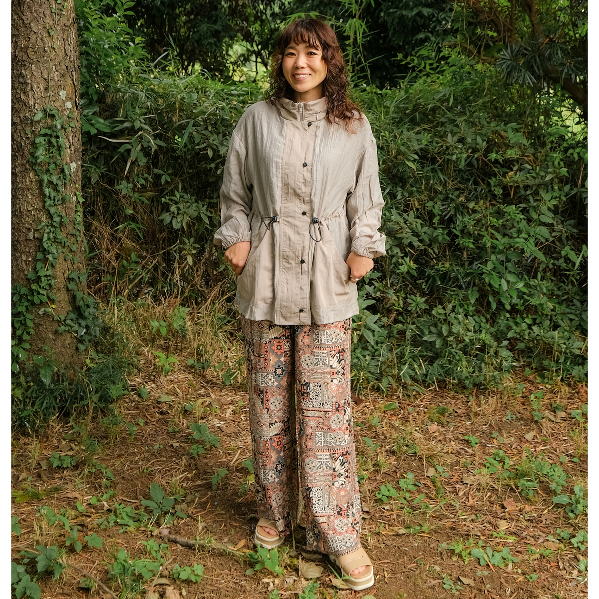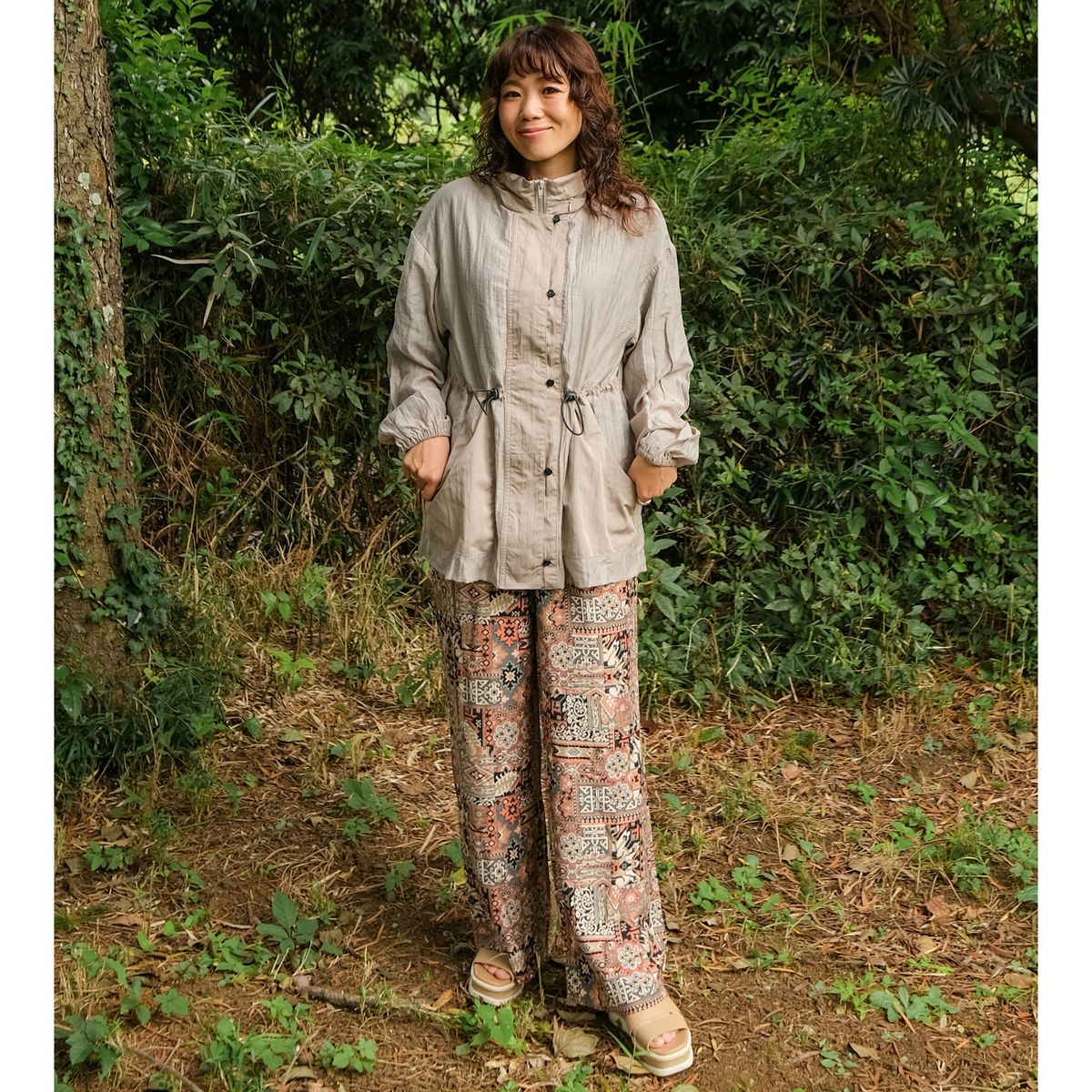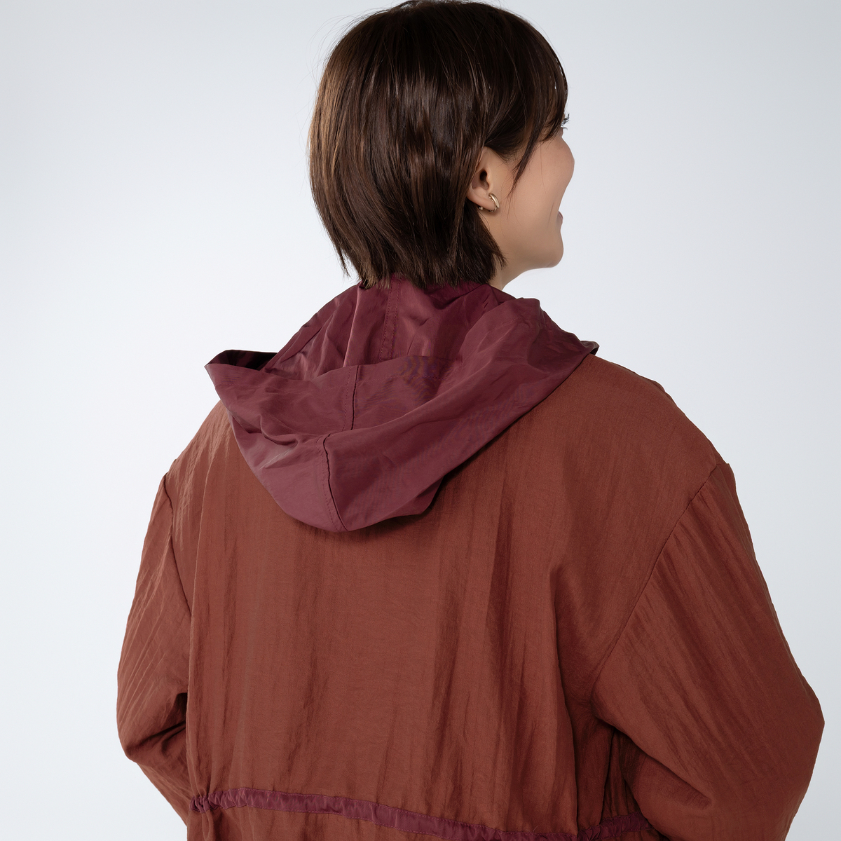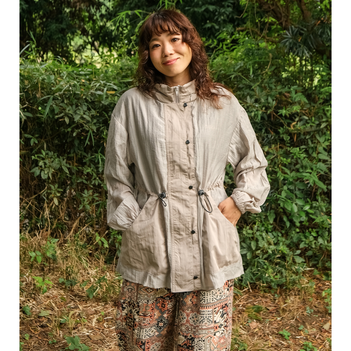 スタンドカラーのファスナーを開くとフードが内蔵されたジャケット。フロントはオープンファスナー開きで、広めの前立てを付け、前立てのジグザグステッチに合わせてループボタンを付けてアクセントにしています。ウエストには丸ゴムを通し、アジャスターでシルエットを変えられるデザインです