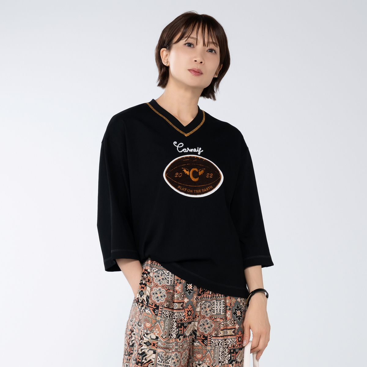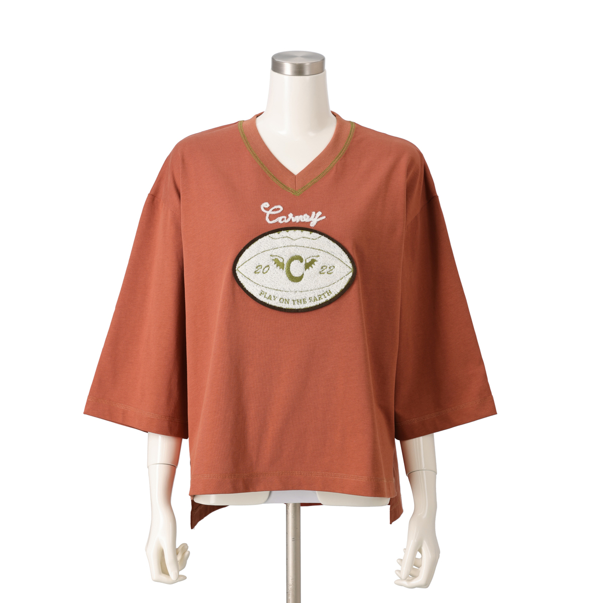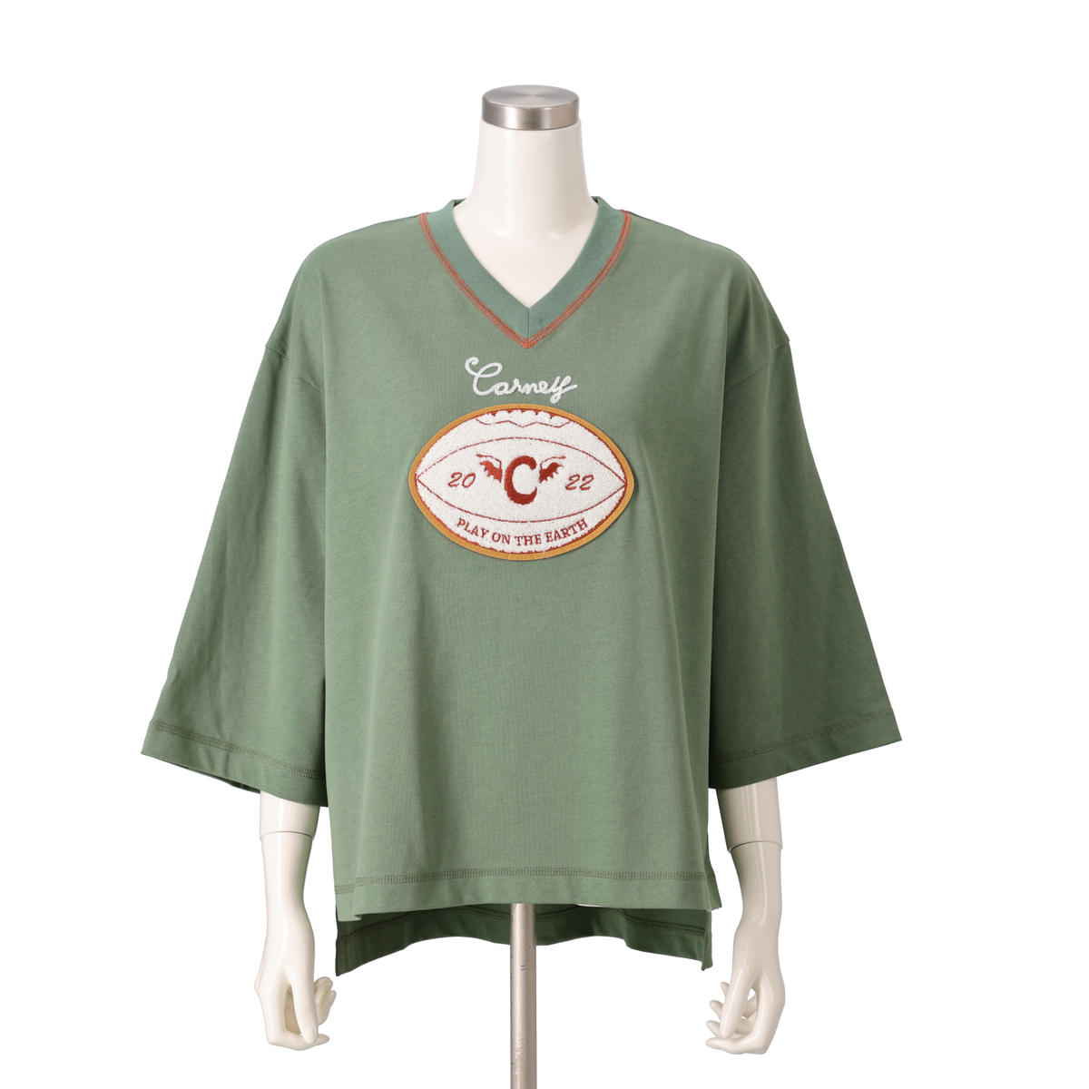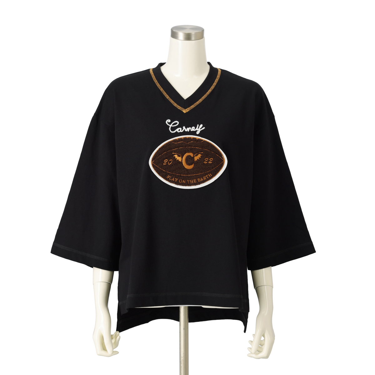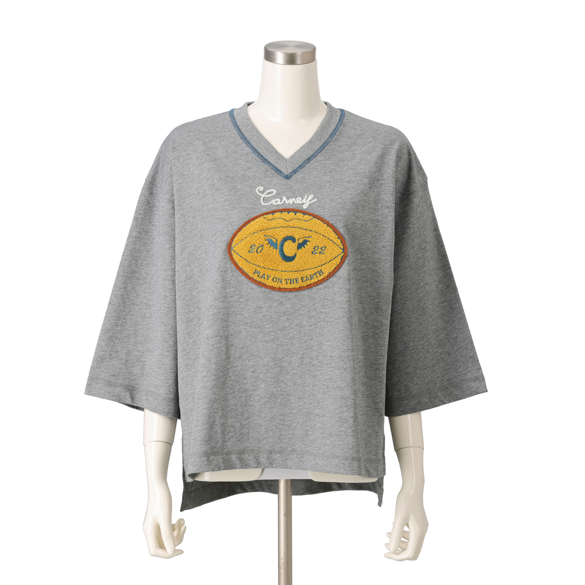 オーバーサイズで浅めのVネック、太めの七分袖プルオーバー。80年代に流行したようなラグビーボールを立体感のあるサガラで刺繍しました。衿ぐりには刺繍に合わせたカラーで、三本針ステッチが入っています