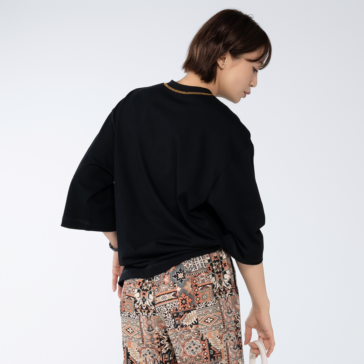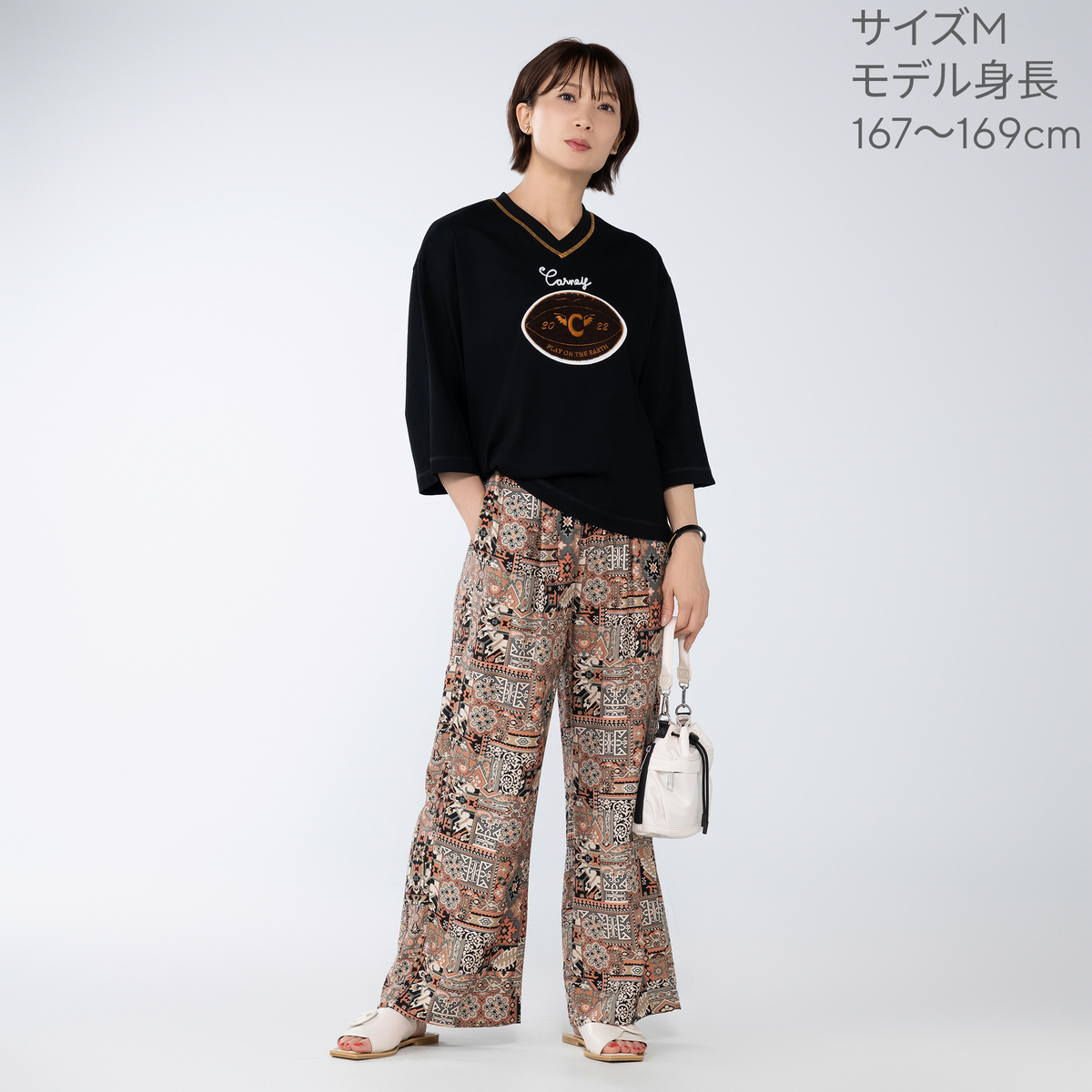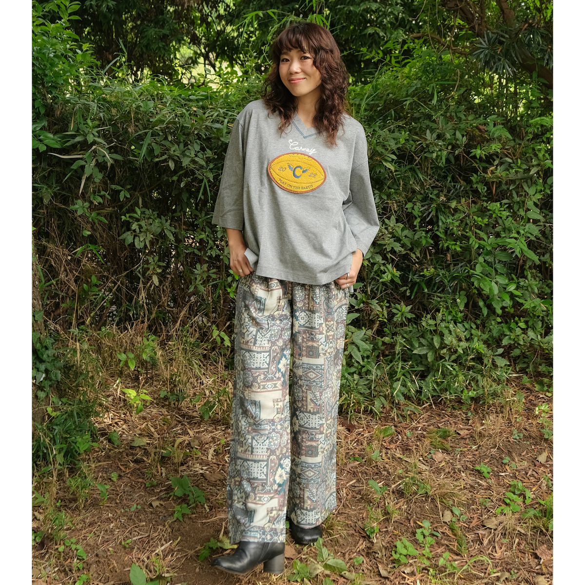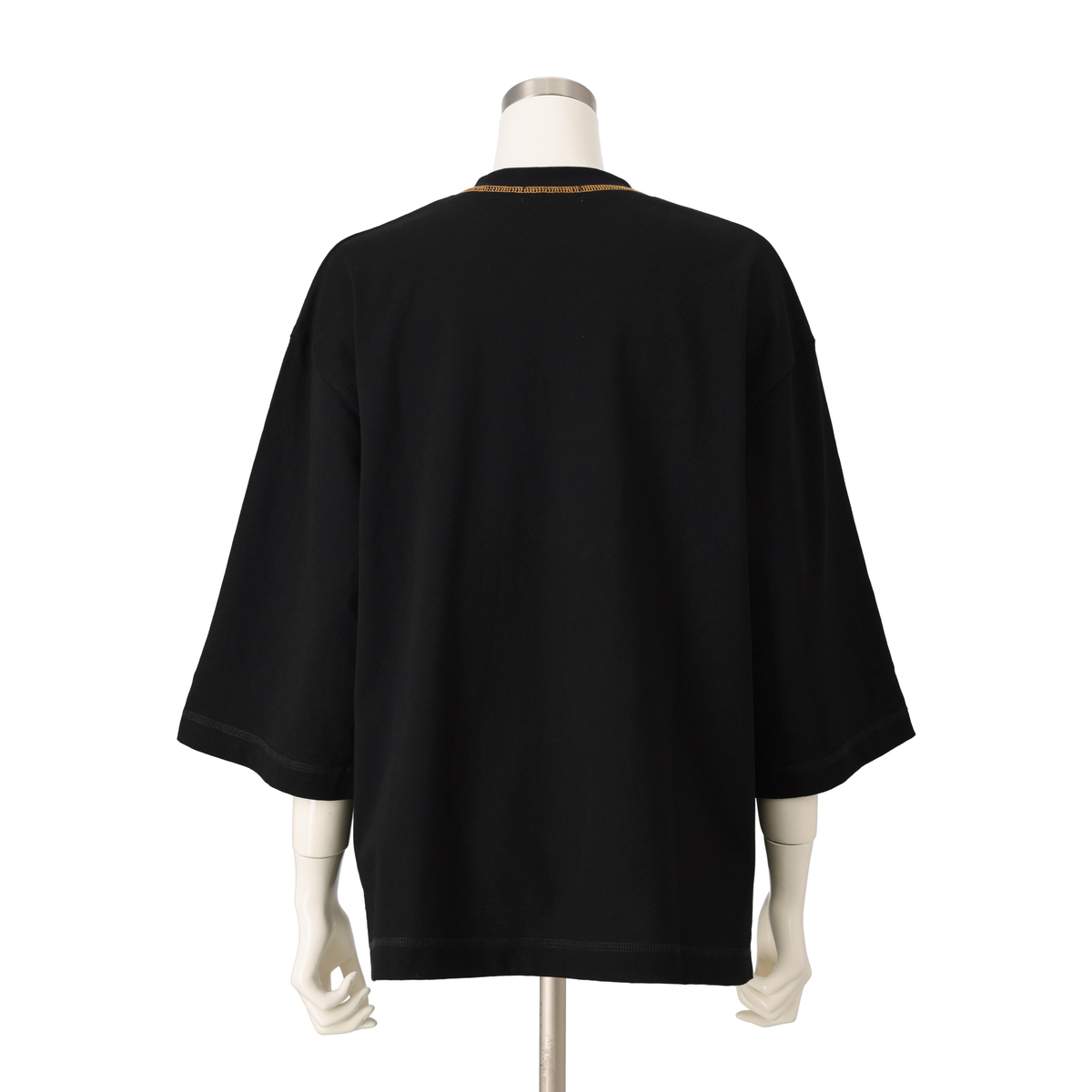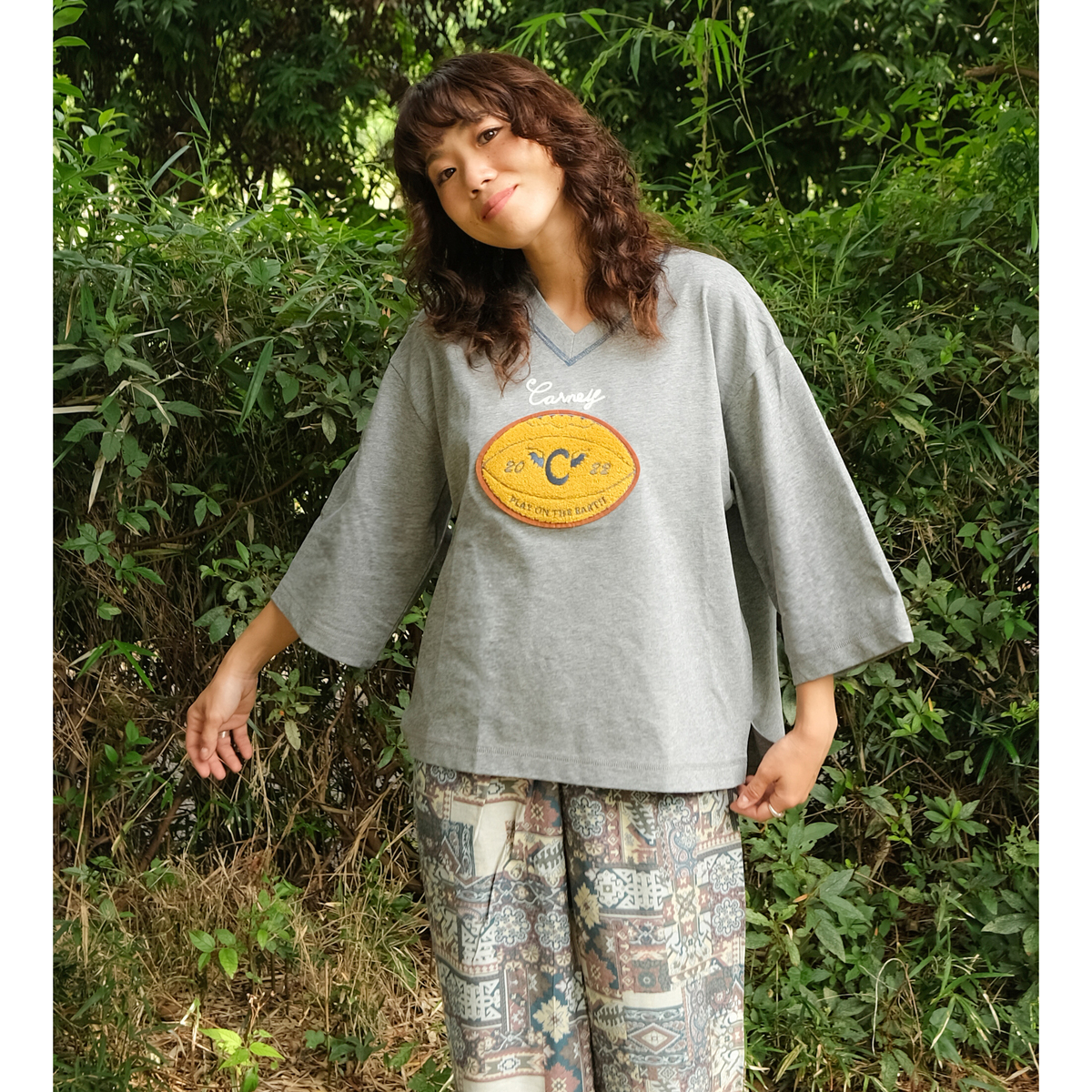 オーバーサイズで浅めのVネック、太めの七分袖プルオーバー。80年代に流行したようなラグビーボールを立体感のあるサガラで刺繍しました。衿ぐりには刺繍に合わせたカラーで、三本針ステッチが入っています