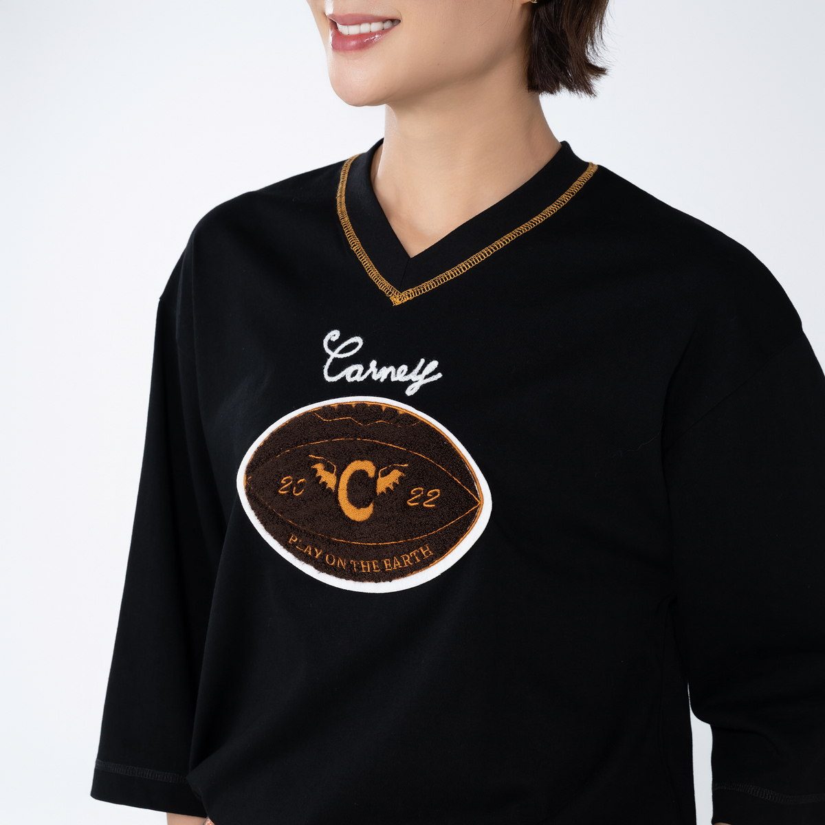 土台のフェルトの上にモコモコとしたサガラ刺繍、その上には光沢のあるポリエステル糸でロゴ刺繍を施しました。ラグビーボールの上にはチェーンステッチでCarneyの文字が入っています