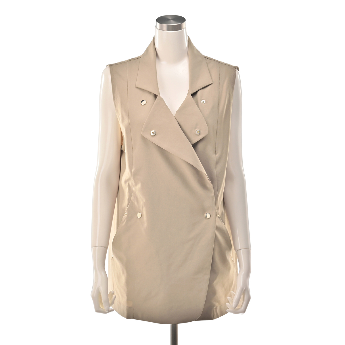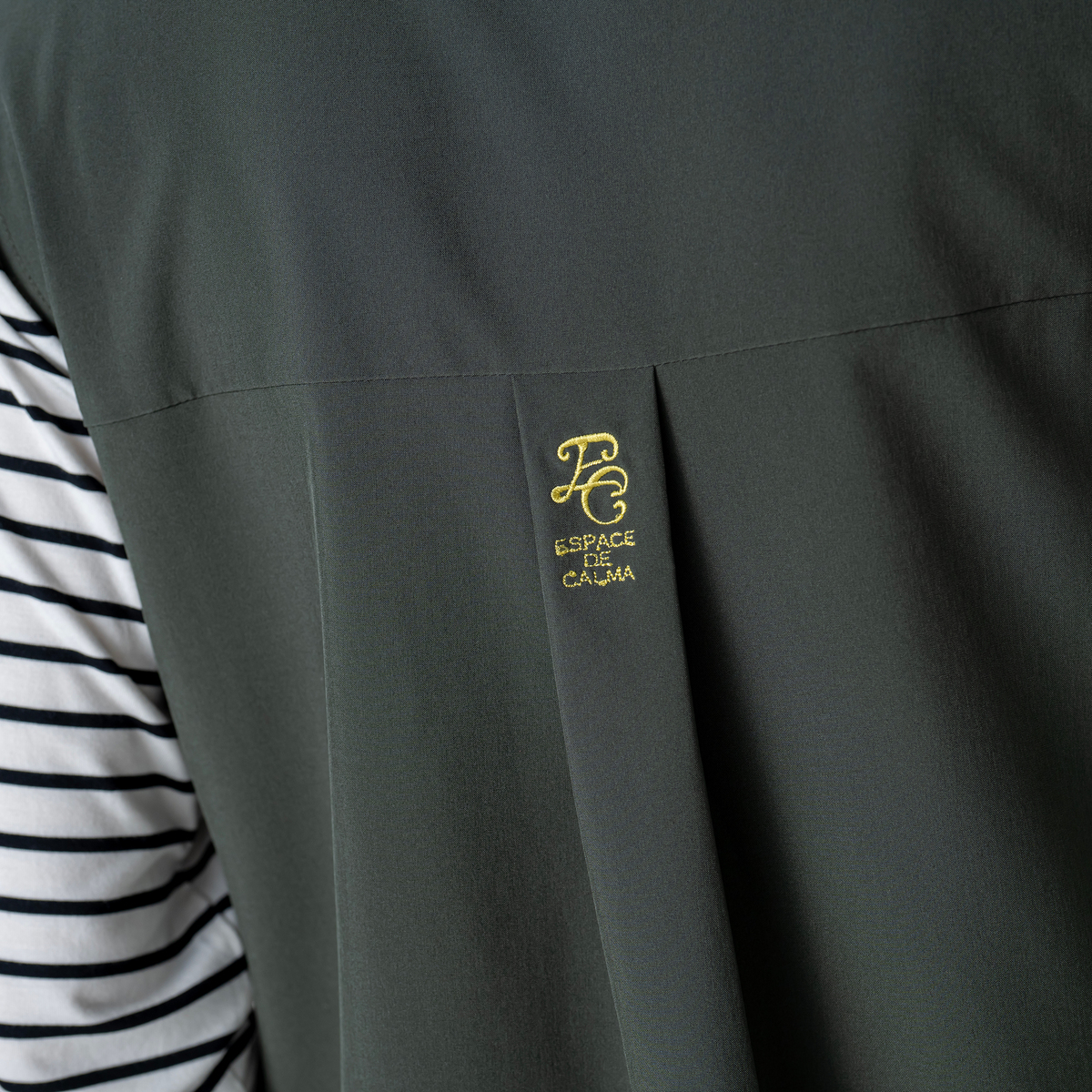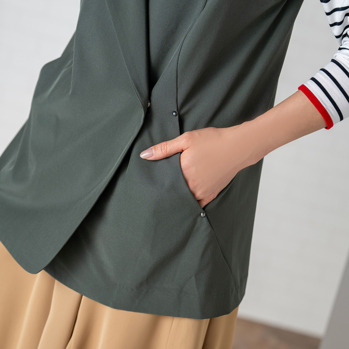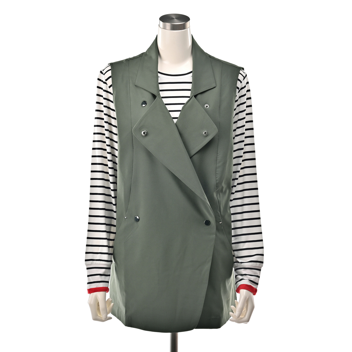 コートやブルゾンはカルマが好きで購入してたけどなかなか来ない秋にジレが活躍しそうでとりあえず定番のブラックを購入 154センチと小柄なので丈もSでもお尻が隠れていい感じですが前は開けて着るのでスナップボタンの裏側が見えて少しオシャレ感が損なうかな それからインナーの色は袖口に使っているグリーンにしてくれてたら良かったかな 手触りも良くハンガーに掛けてたら配送シワも殆ど目立たなくなってた 私はジレにポケットがあるので決めたんですよ 7000円代の価格という事で満足します