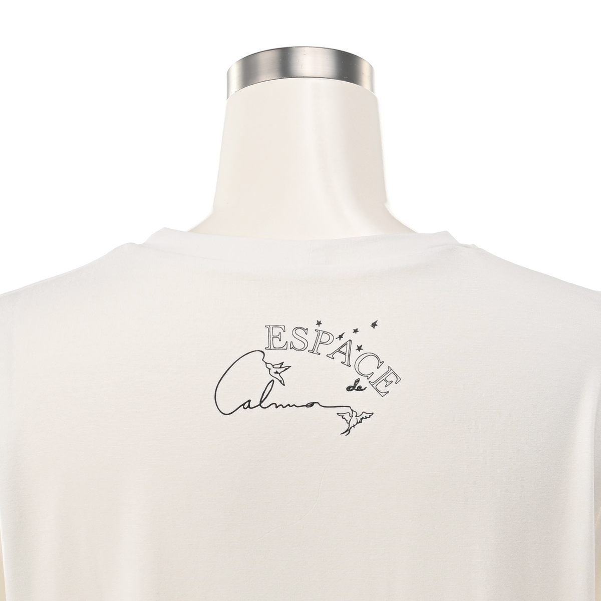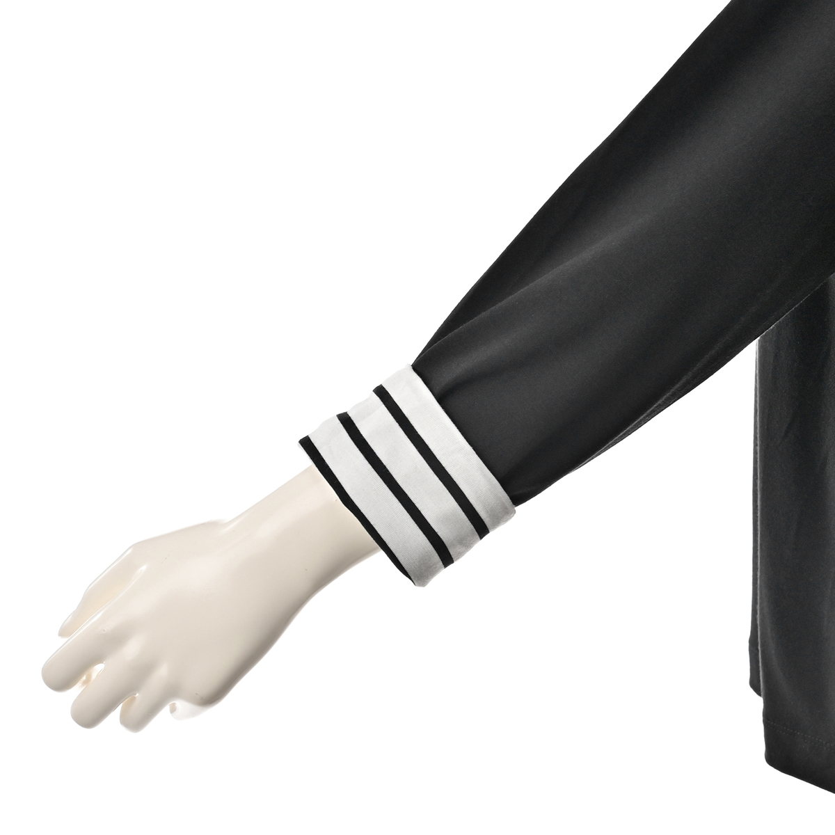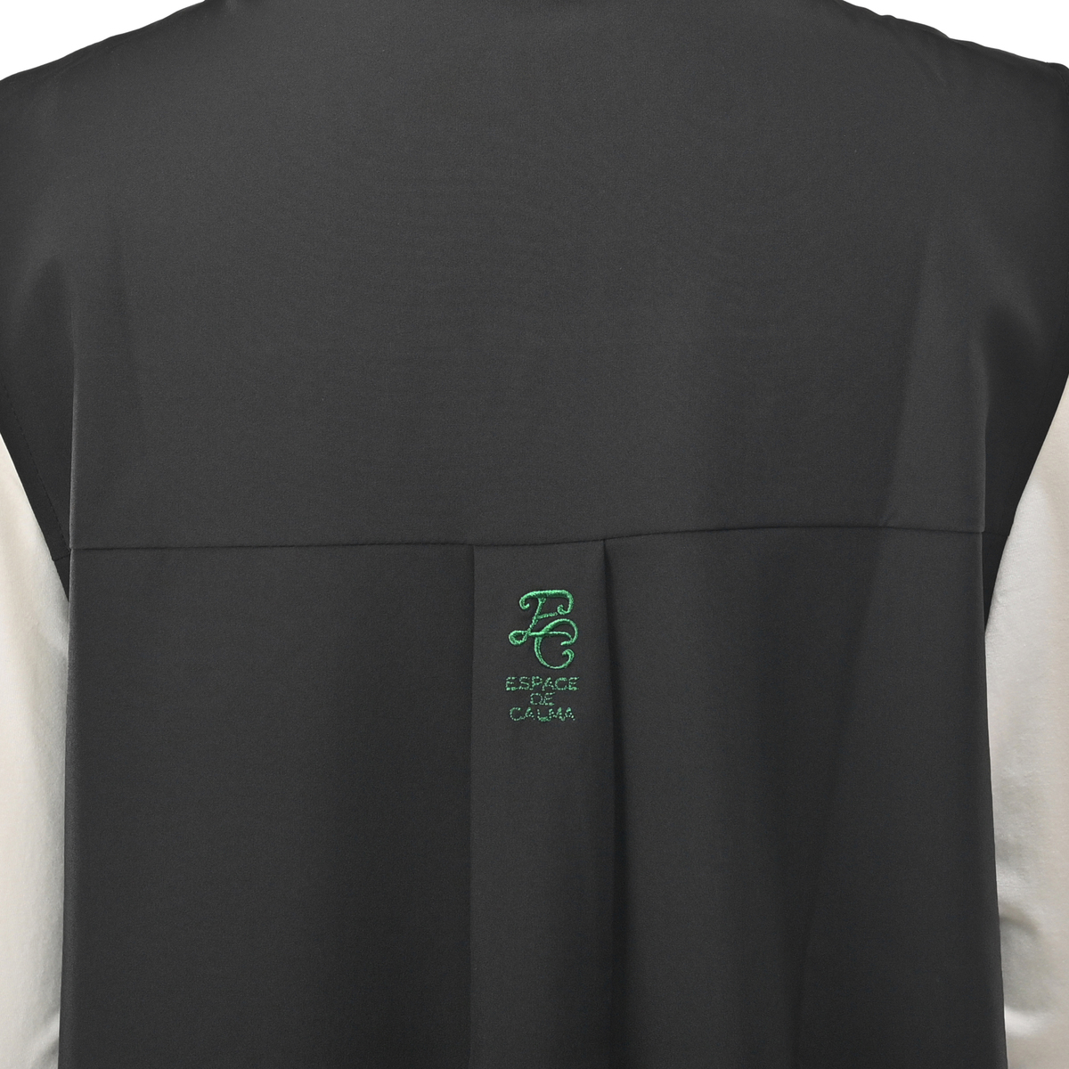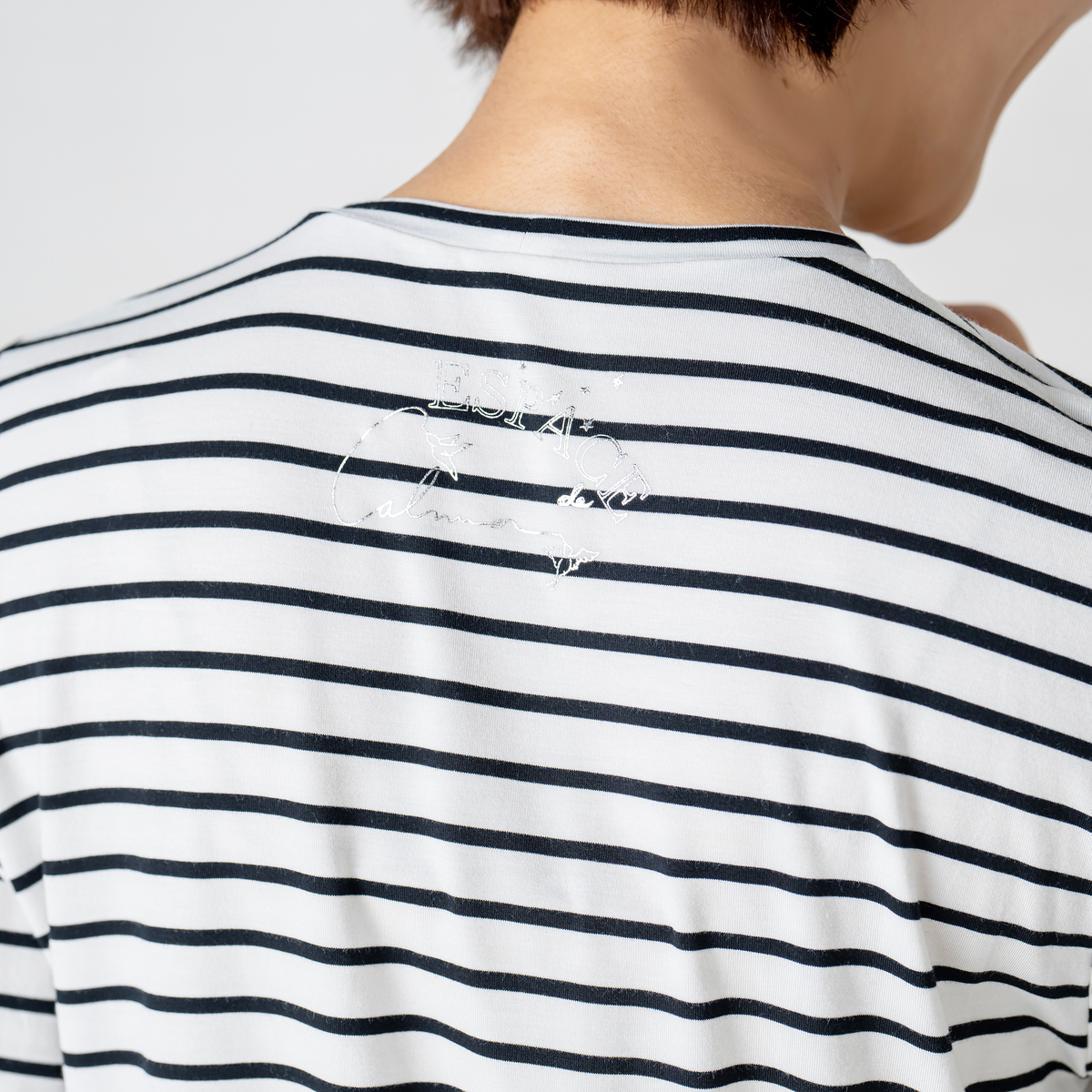 袖口はカフス状に切り替え、袖口から1cmほど見返しに隠した配色生地が見える様にデザイン。後ろ襟ぐりには、箔を使用したブランドロゴのオリジナルのプリントを施しました