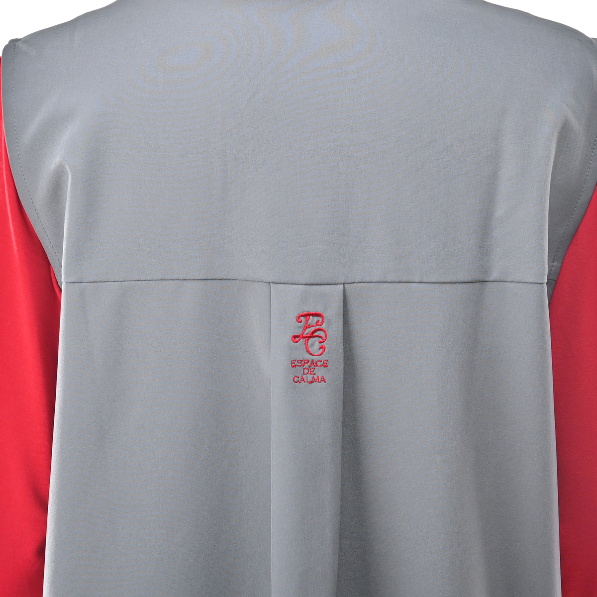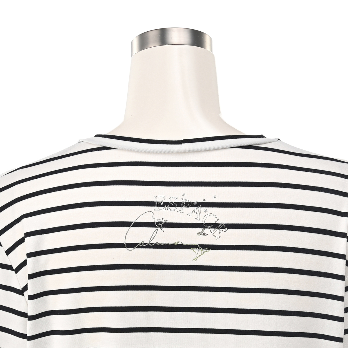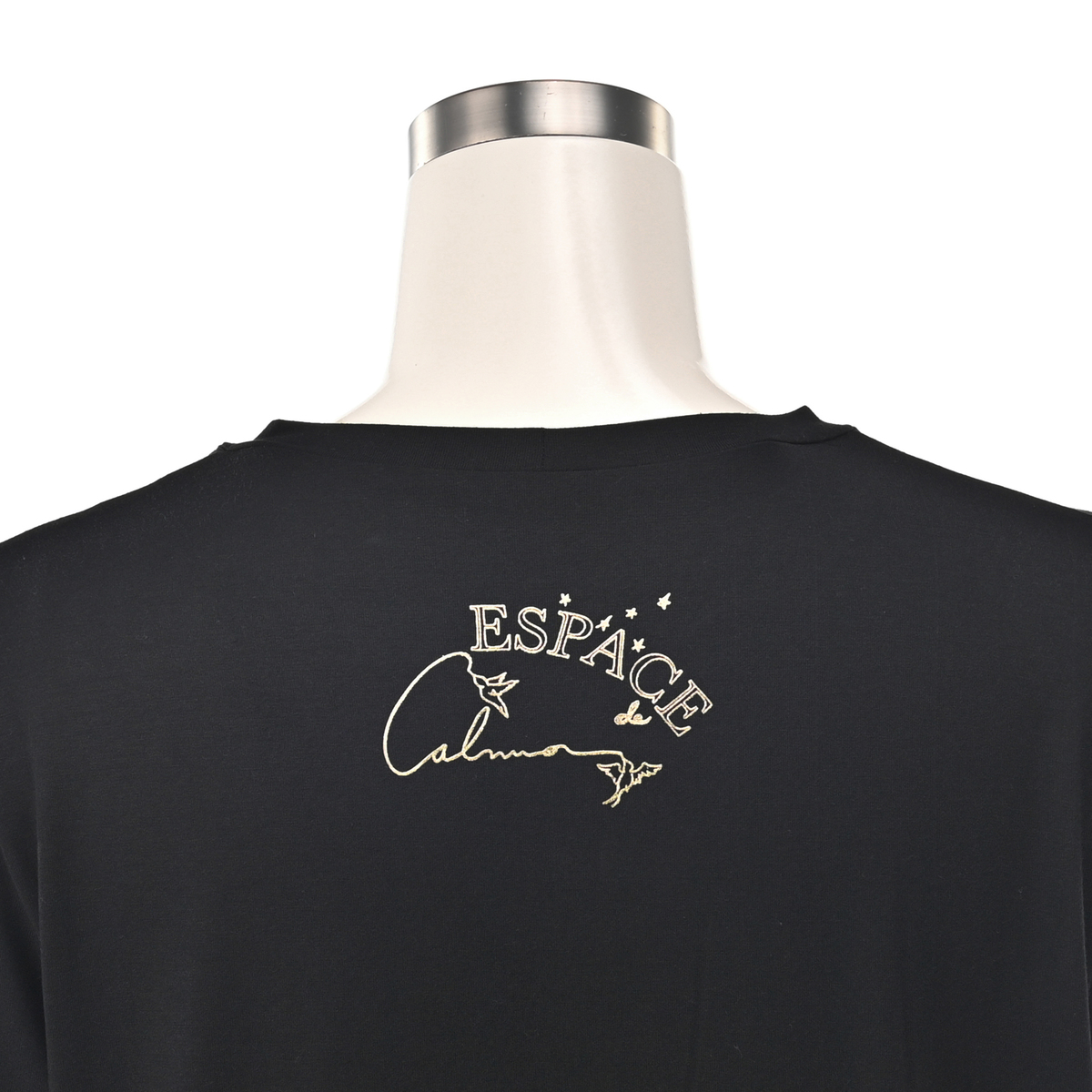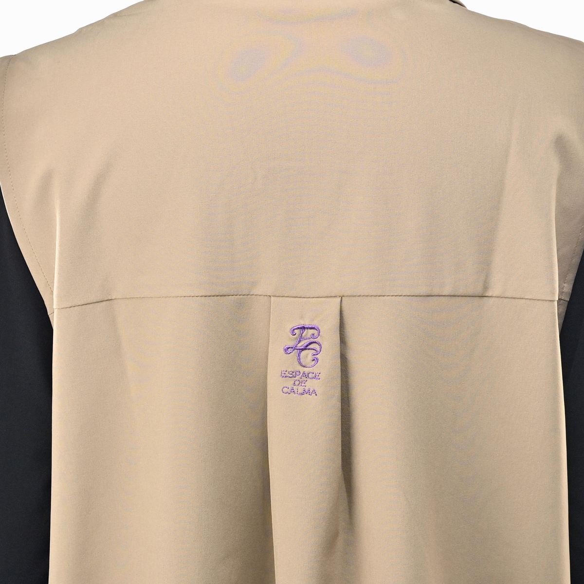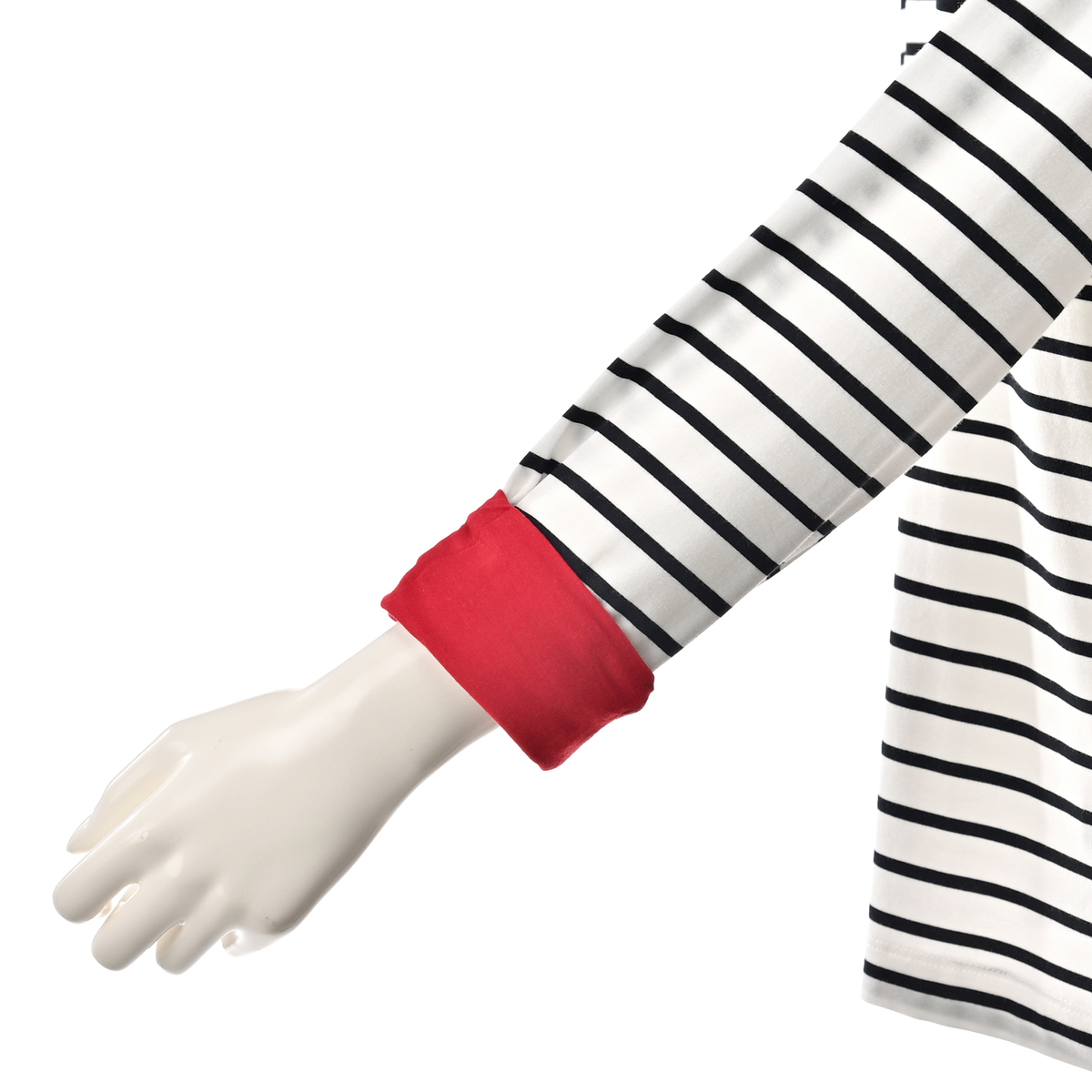 袖口はカフス状に切り替え、袖口から1cmほど見返しに隠した配色生地が見える様にデザイン。後ろ襟ぐりには、箔を使用したブランドロゴのオリジナルのプリントを施しました