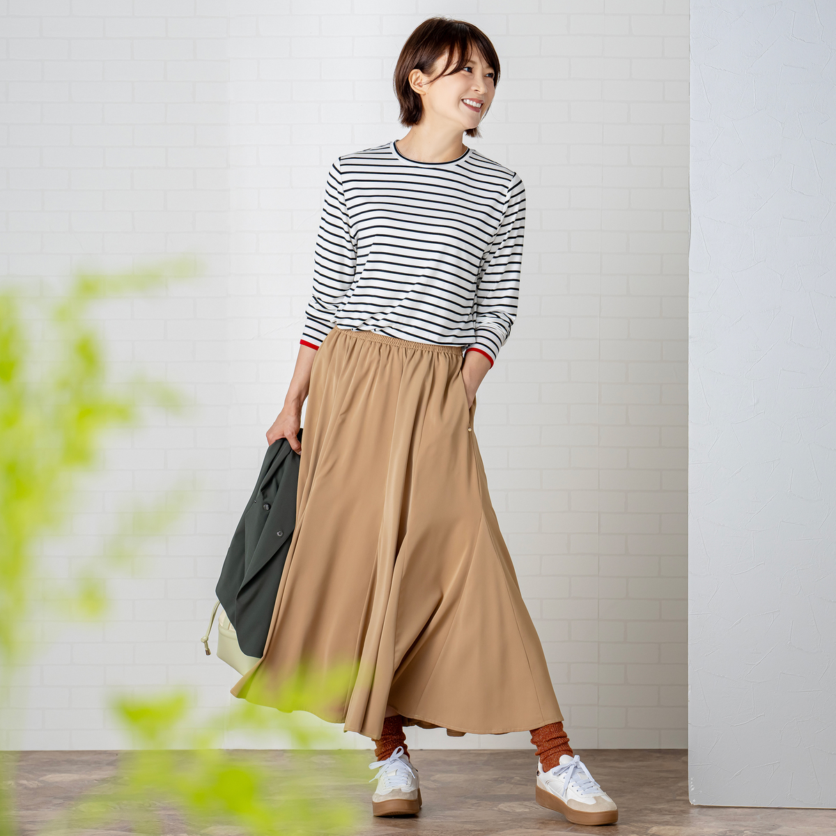 やや裾広がりのボックス型シルエットです。前身頃の脇線は真っ直ぐで、後ろ身頃の裾幅を広げてゆとりを出すパターンに。気になる腰周りもカバーします