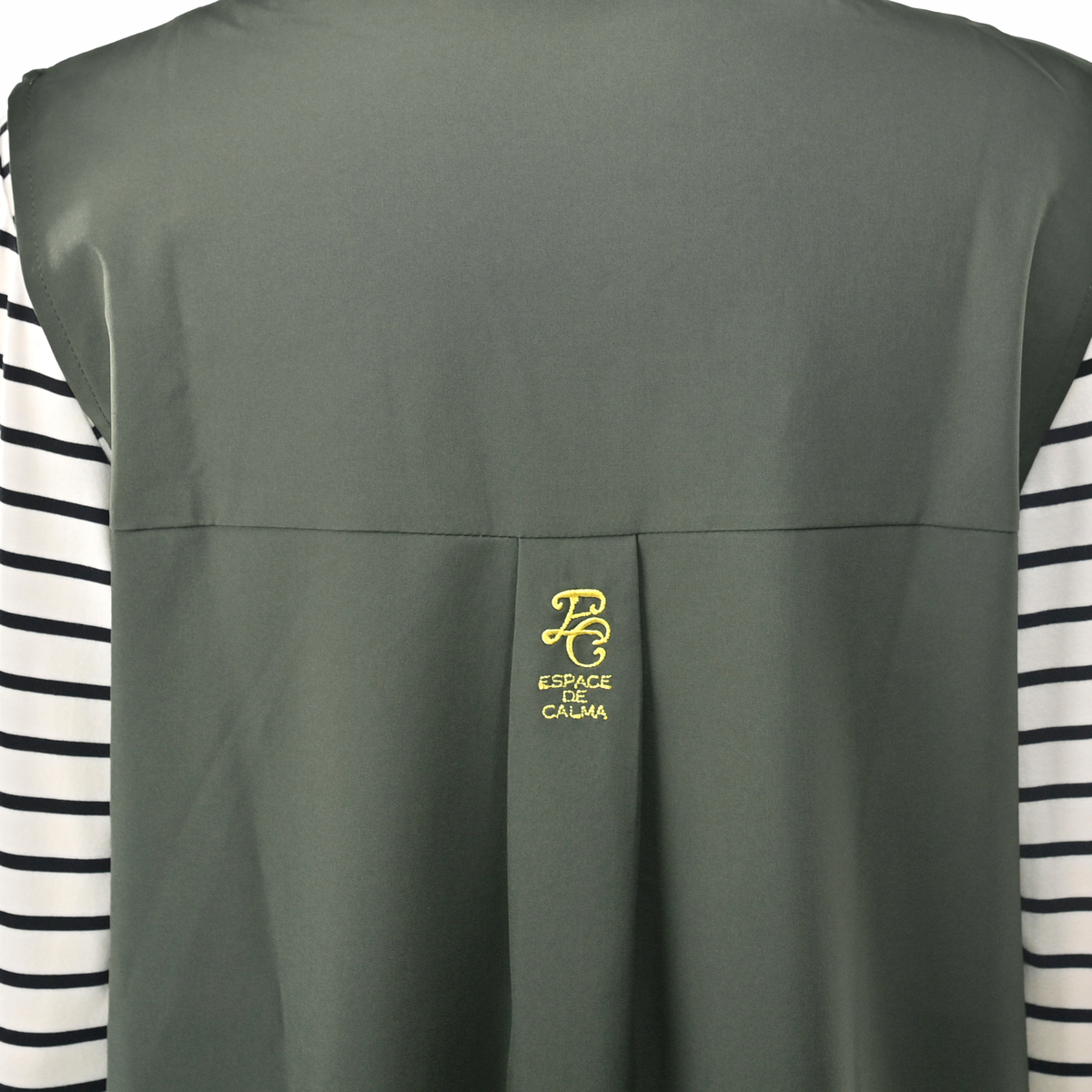 calmaは好きなブランドで何度も購入していますが、サイズはデザインによって大きめだったり小さめだったりで、毎回悩んでしまいます。今回はジレなので袖丈が関係なかったので身長163cmでМのグリーン系/ストライプを頂きました。サイズは丁度いい感じで正解でした。私は前を留めずにラフに着流す感じが好きです。トレンチ風の襟のボタンがアクセントになって、何もないTシャツの上に一枚着るだけでも、カッコ良くとても締まりますし装いが格上げします。ニットは少し体型をひらう感じですが、柔らかく伸び感もあるので、体型的に融通が利きます。暑かったのでまだ着用していませんが、洗濯後の風合いがどうかな!?と思うところですが、このお値段でジレの後ろに刺繍まで入り、着回し出来る2枚セットはお買得だと思います。グリーン系は色んな色に合わせやすくいいですよ!