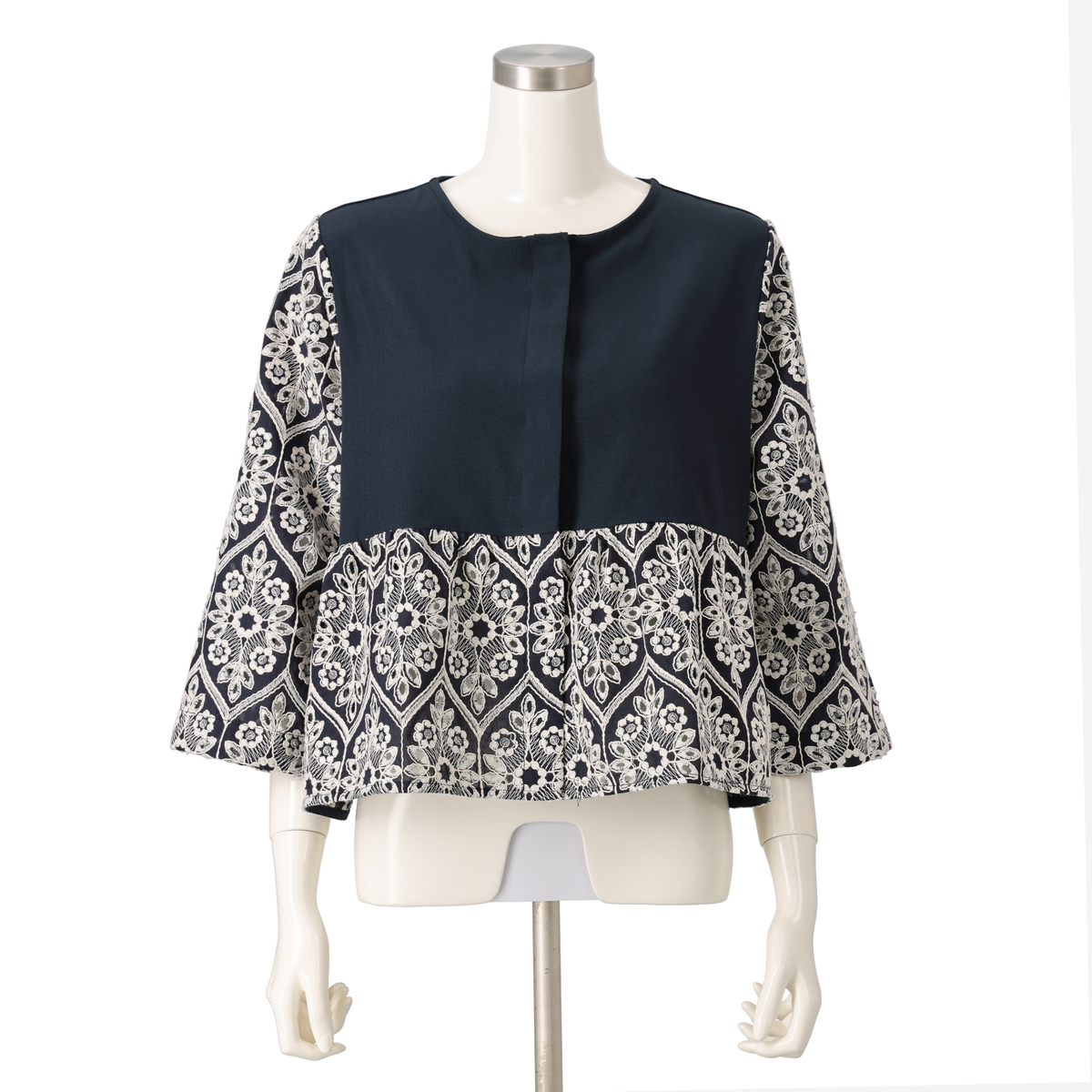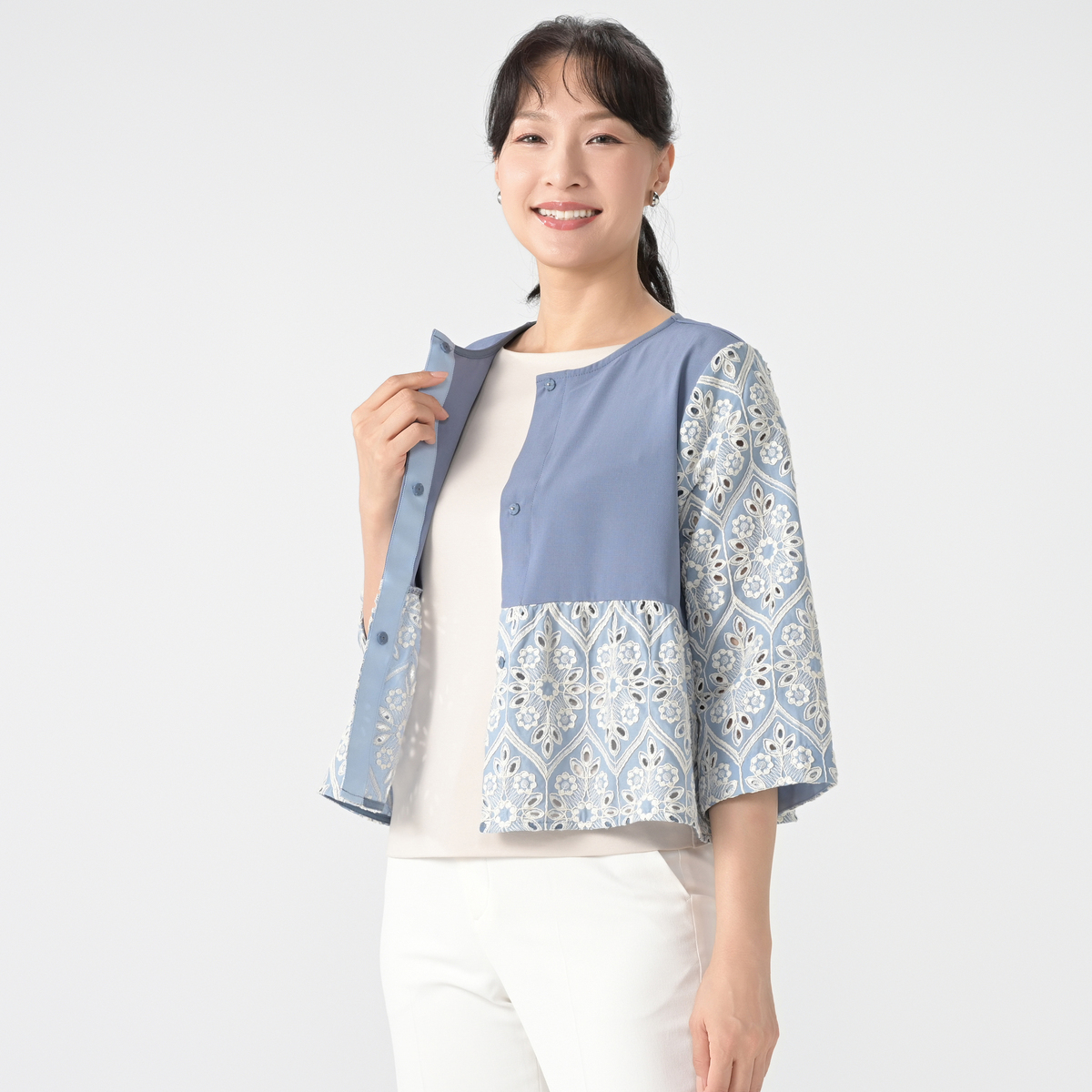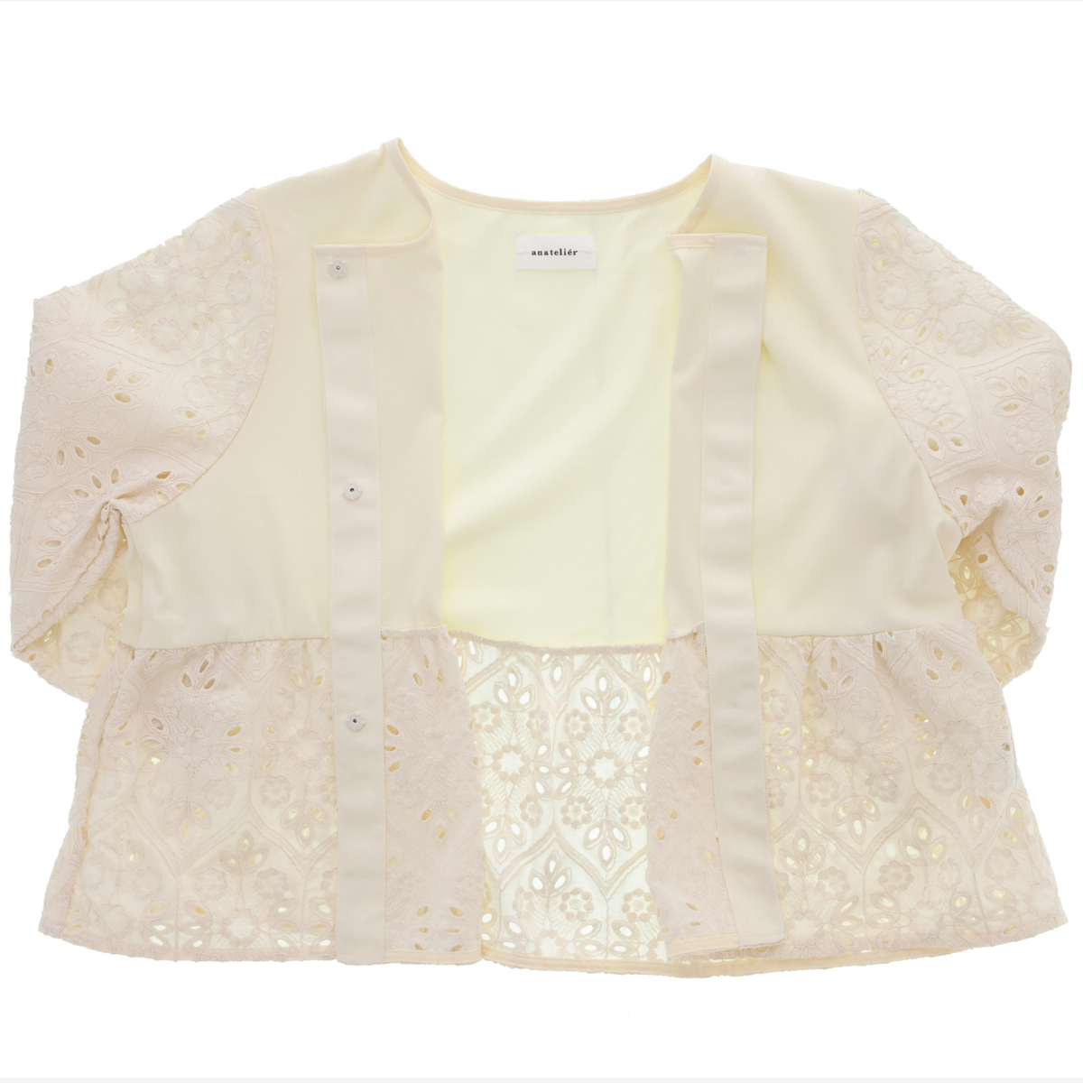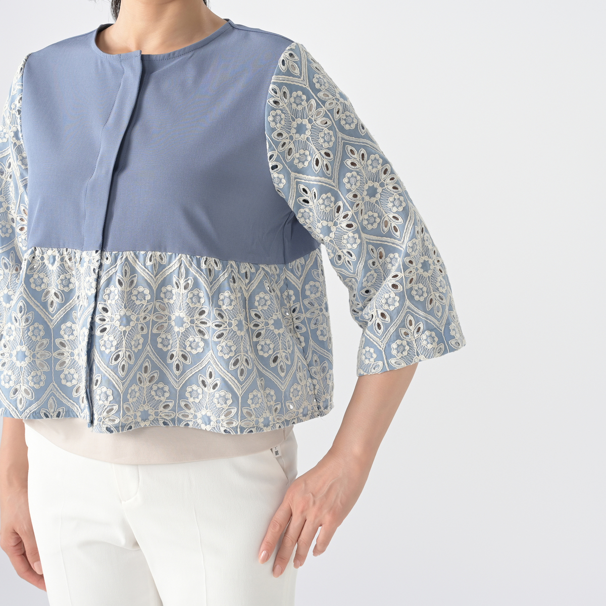 リネンライクな布帛生地を使用したカーディガンです。上品でクラシカルな印象を与えるカットワーク刺繍生地を組合せて、軽やかさとフェミニンさをプラス。気温の変化に柔軟に対応し、季節の変わり目にも活躍します