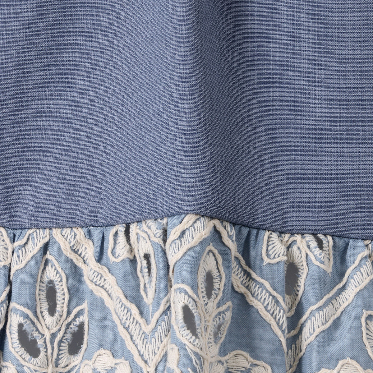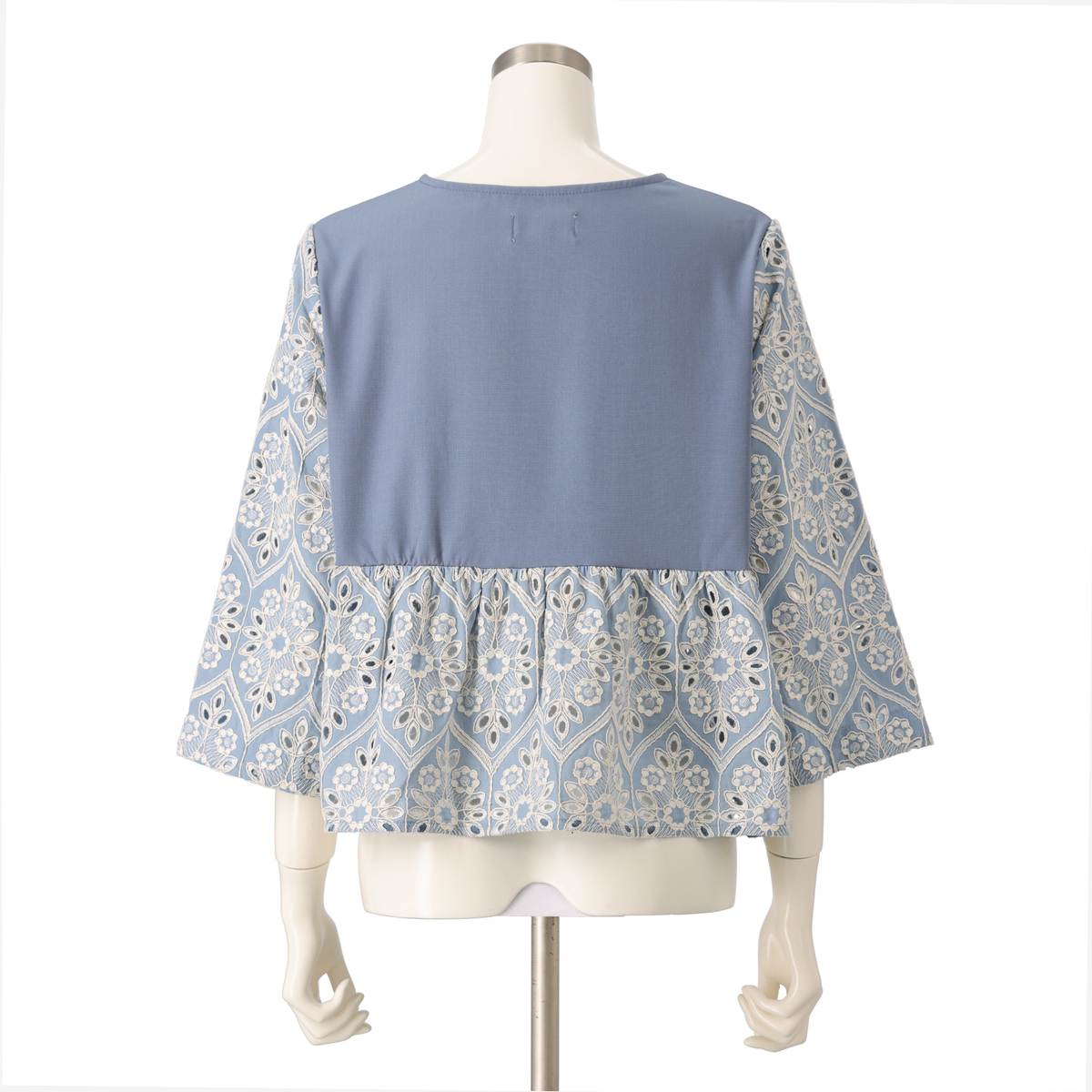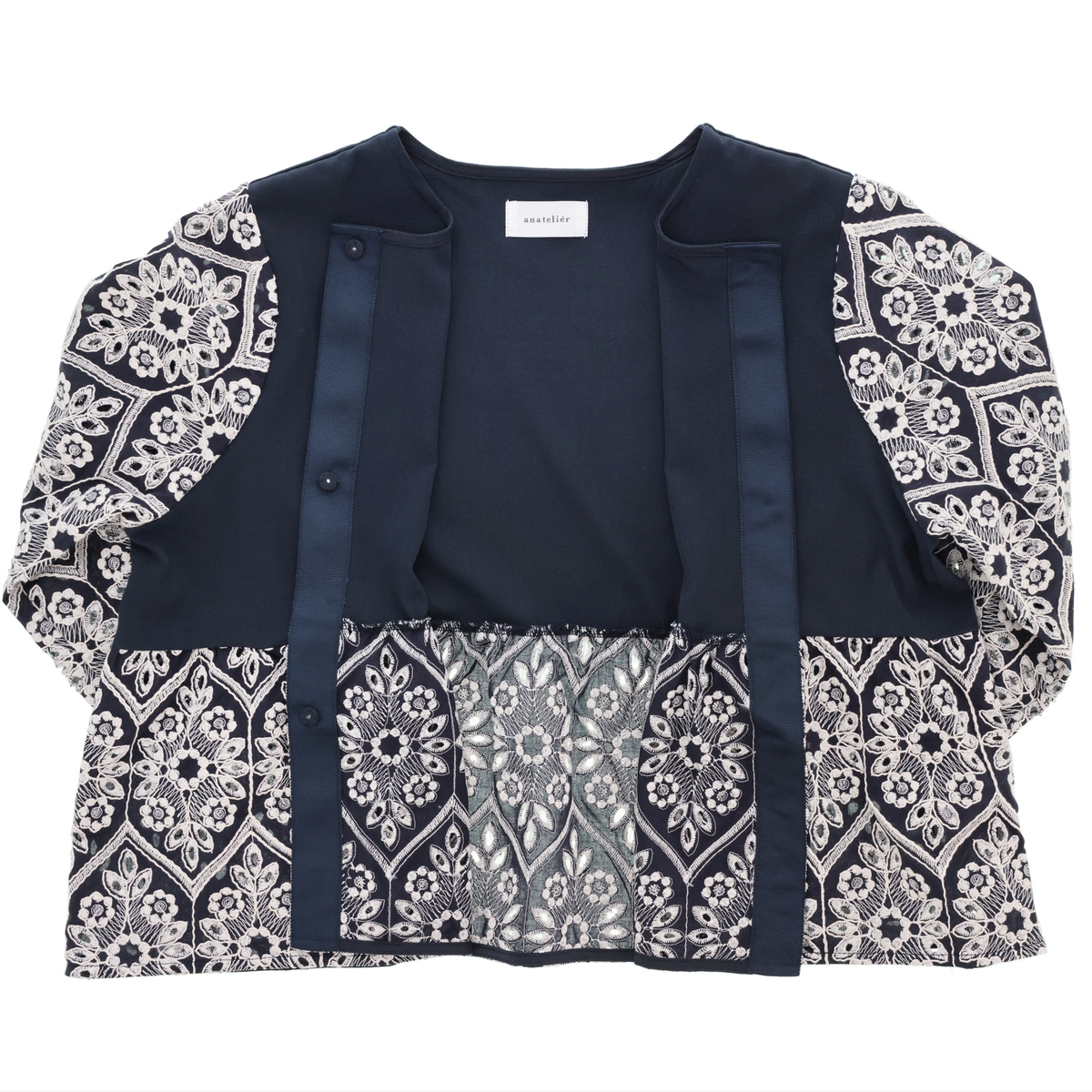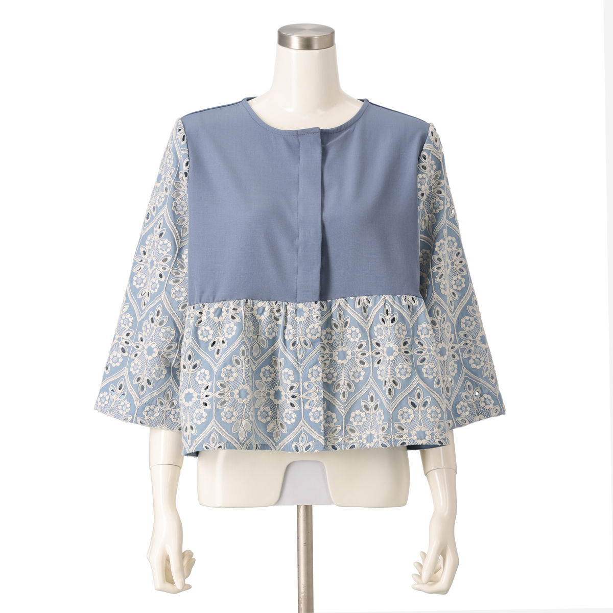 リネンライクな布帛生地を使用したカーディガンです。上品でクラシカルな印象を与えるカットワーク刺繍生地を組合せて、軽やかさとフェミニンさをプラス。気温の変化に柔軟に対応し、季節の変わり目にも活躍します