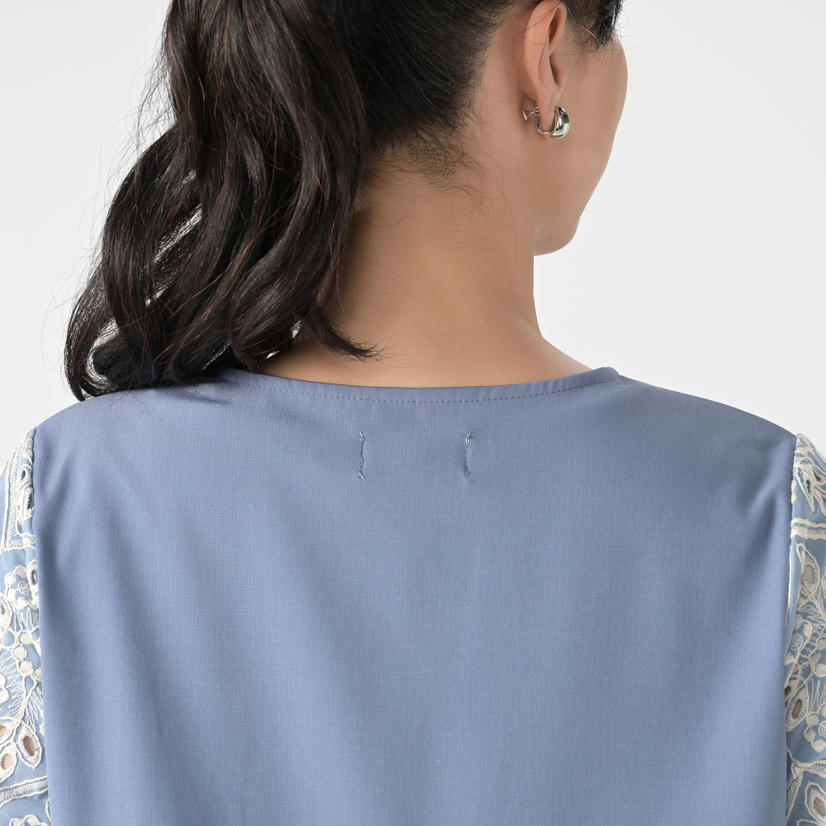 五分丈の袖で二の腕をカバーし、ウエスト切り替え位置を少し高めに設定することでスタイルアップ効果も期待できます。たっぷりと使ったレース生地が腰まわりも自然にカバー。前開き見返し部分のグログランテープやスナップボタンがデザインのアクセントになり、着こなしに遊び心を添えます