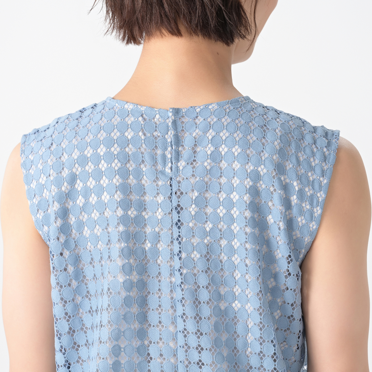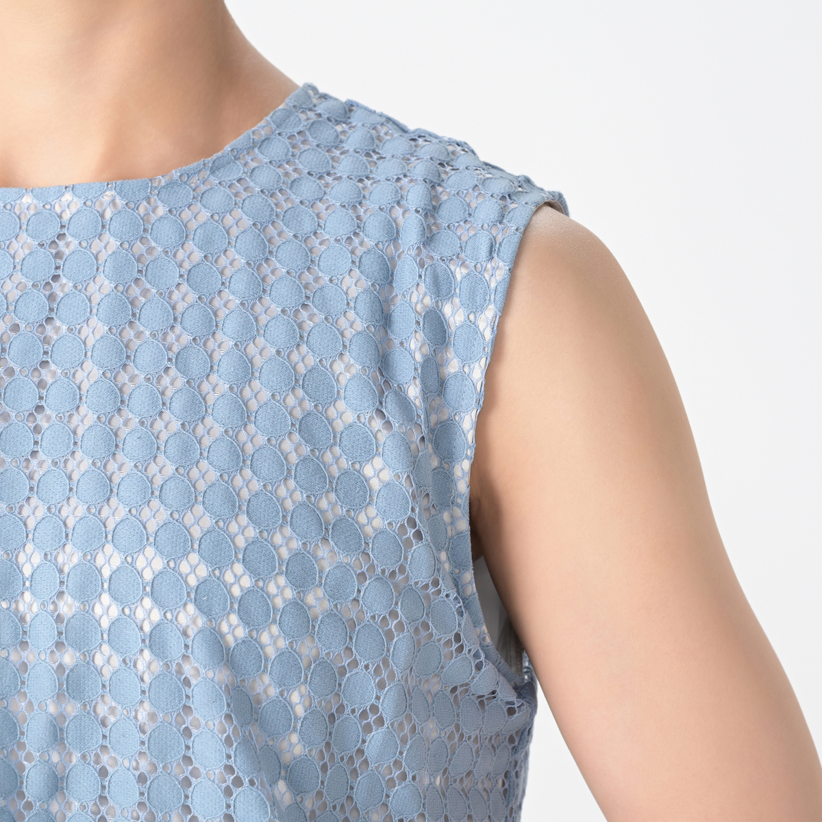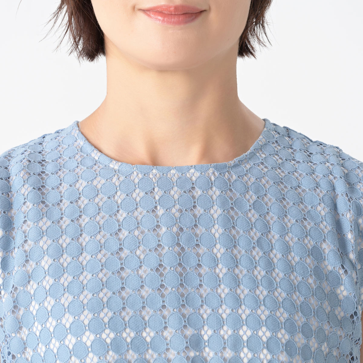 ドット柄のコードレースをあしらったサマーワンピース。ボックスシルエットのトップスとランダムプリーツのスカートを組合せることで動きのあるデザインに仕上げました