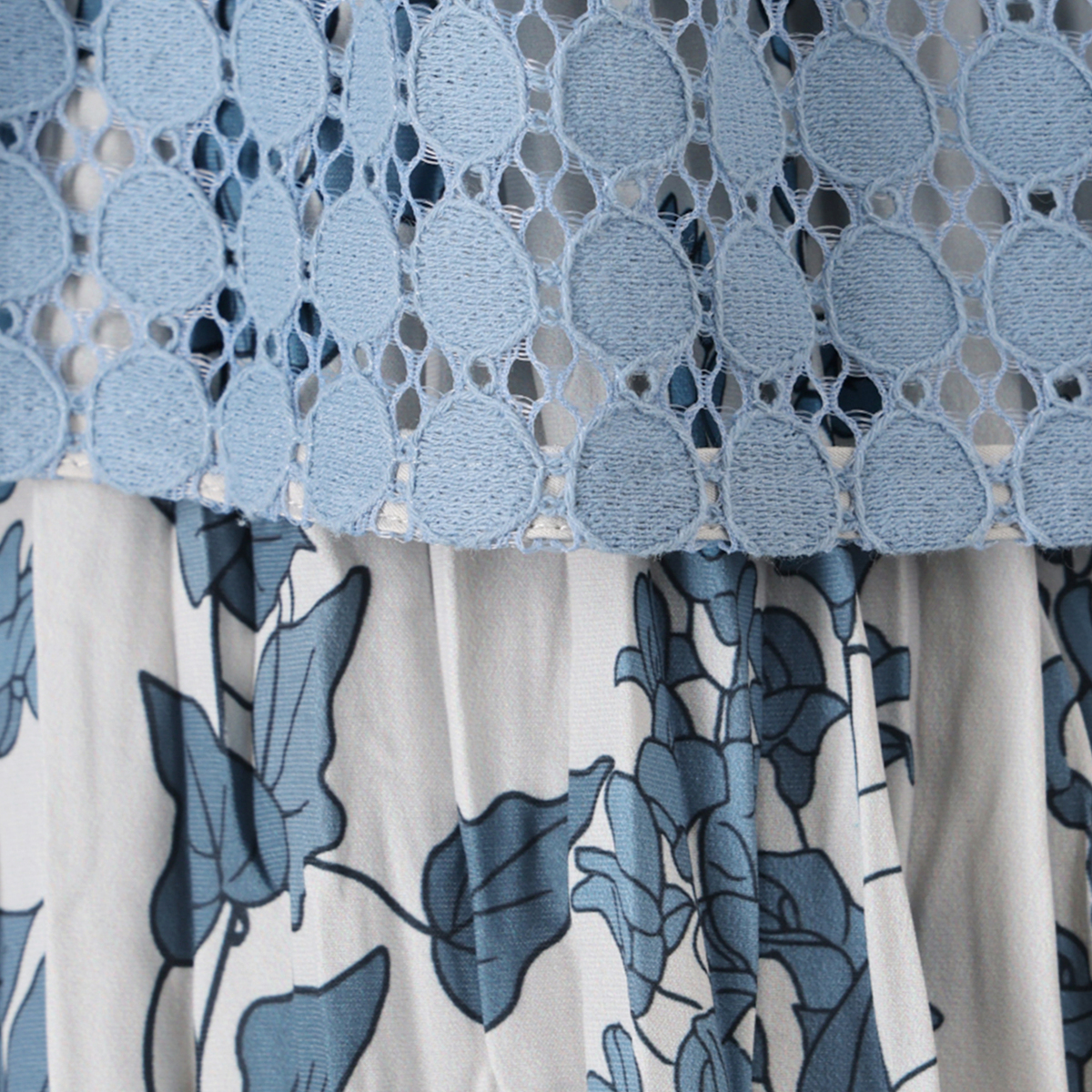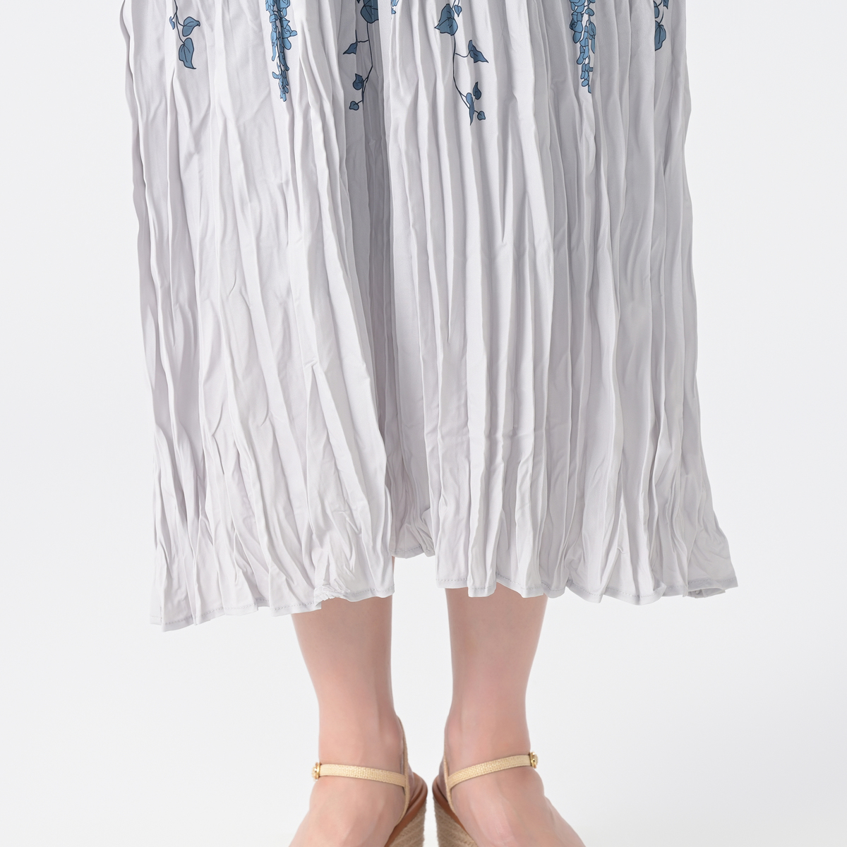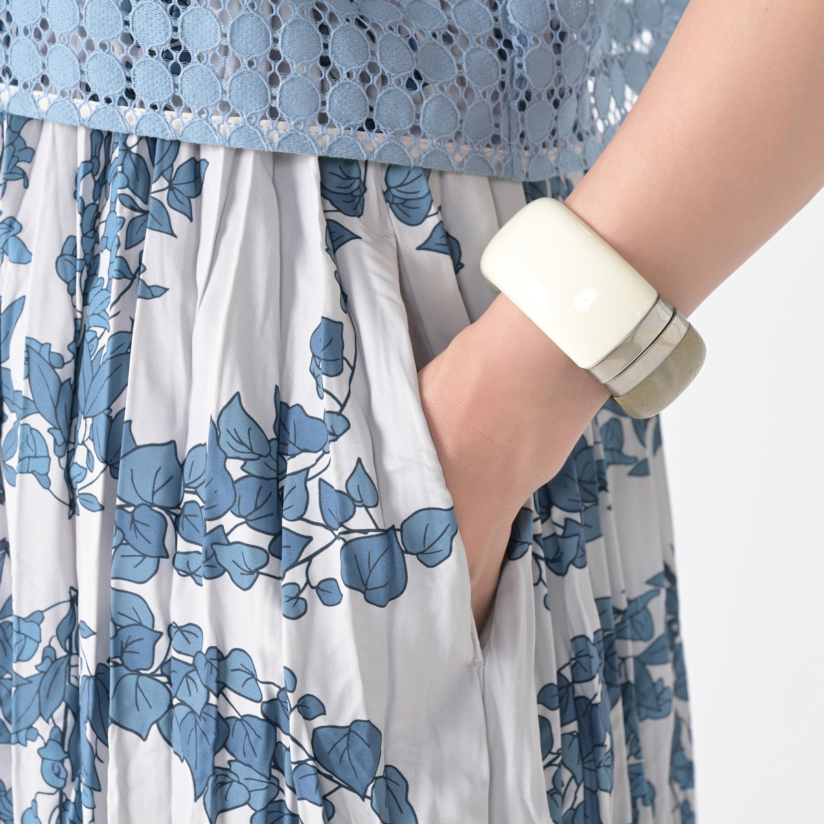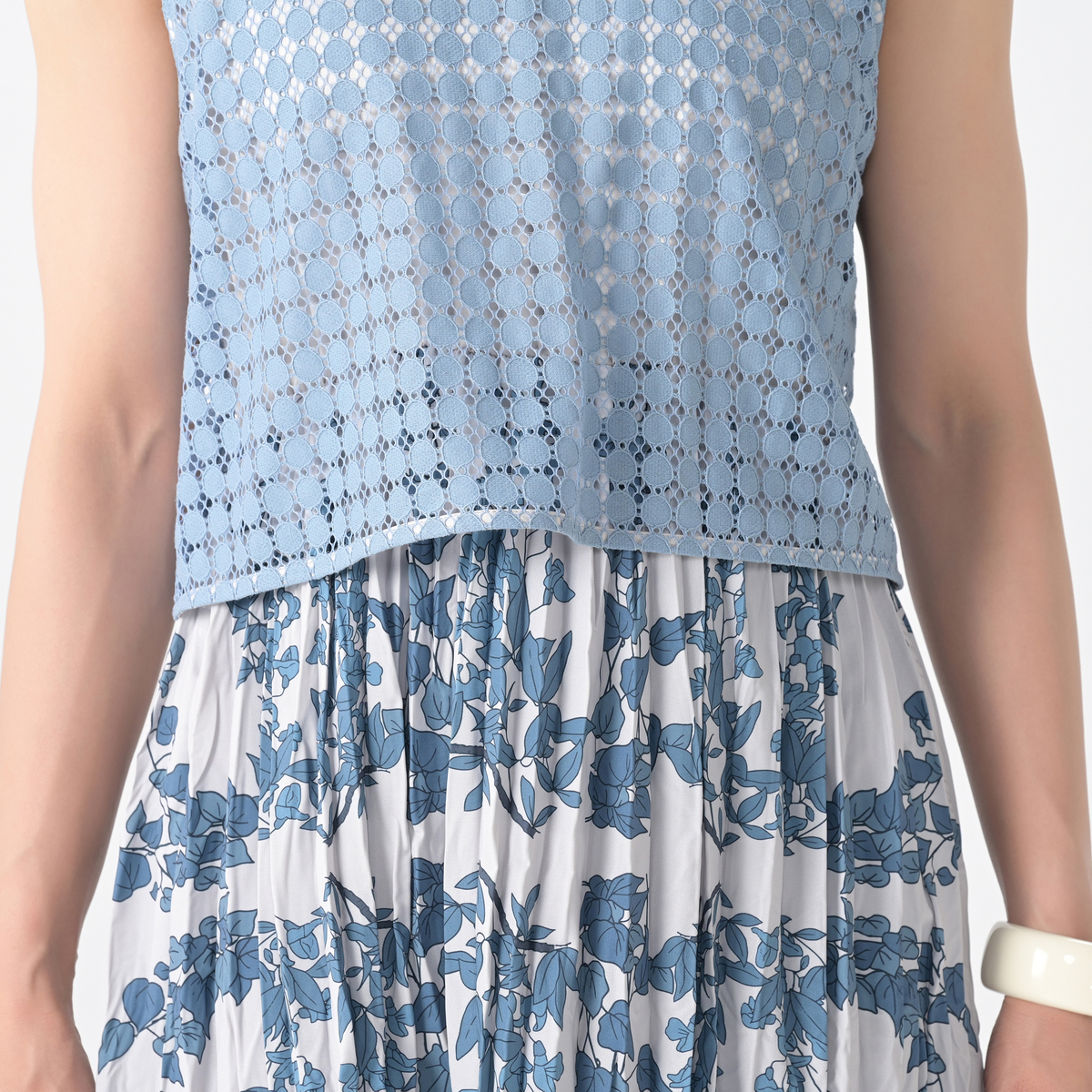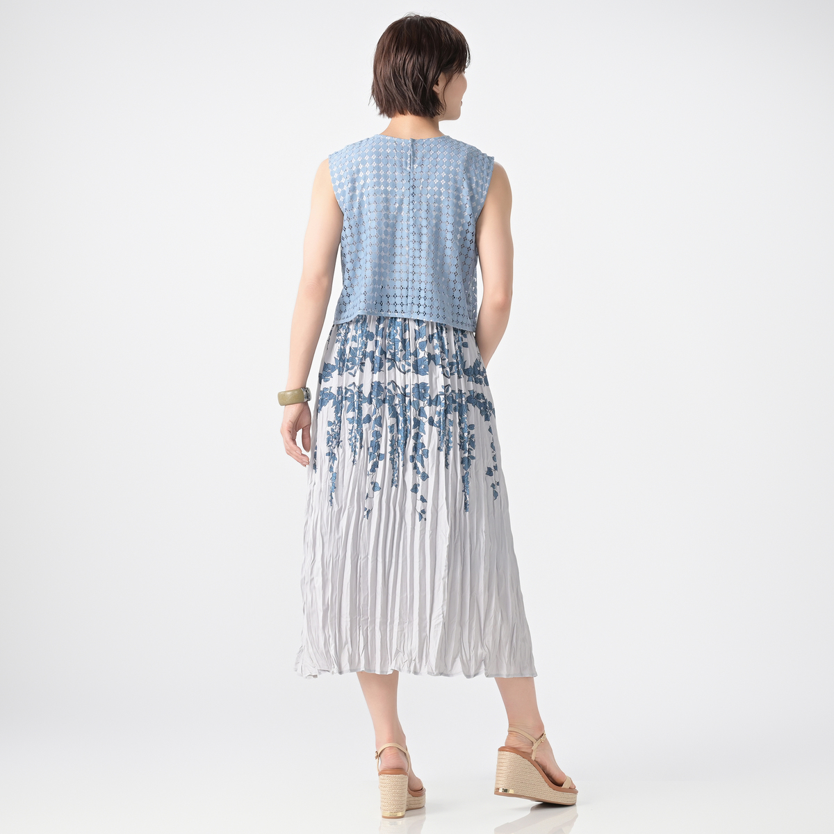 トップスには太めの糸で刺繍を施したコードレース、スカートはランダムなプリーツ加工を施したプリント生地を使用した異素材ミックスのアイテムです