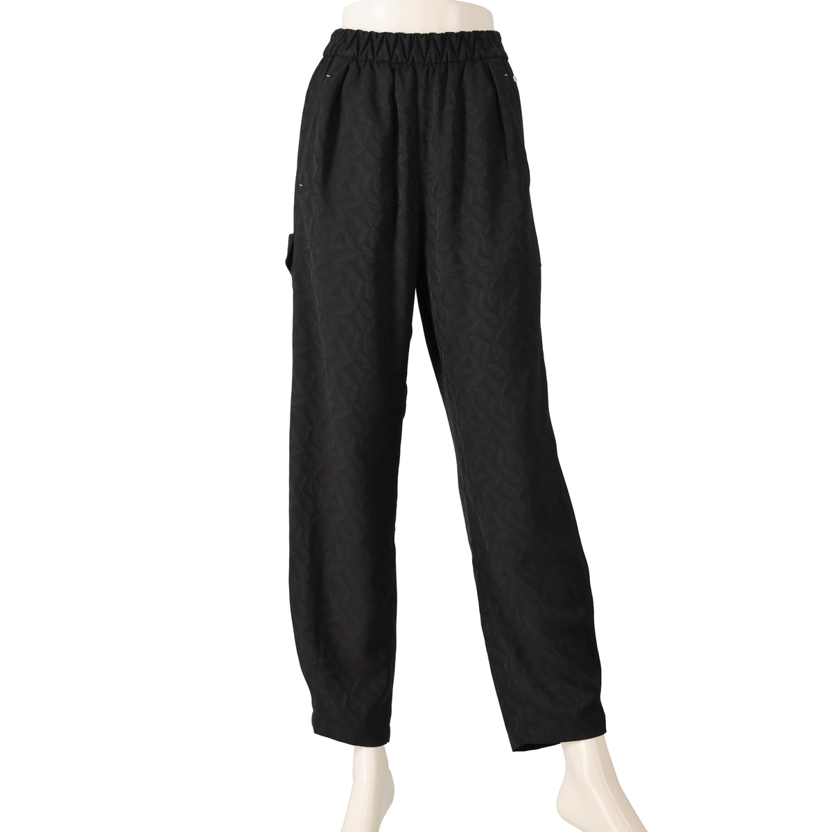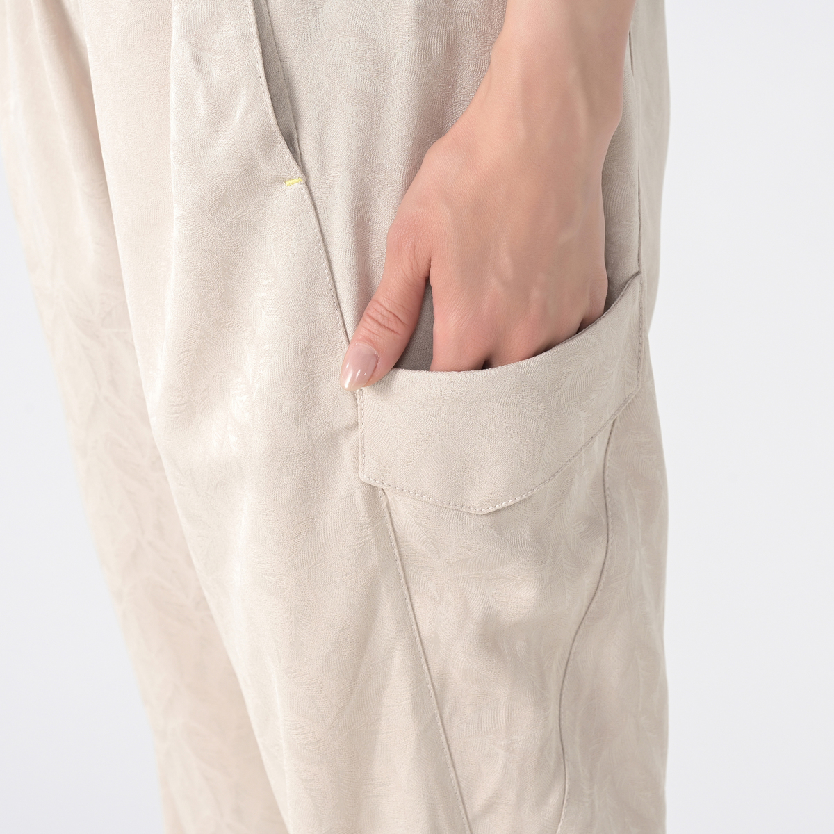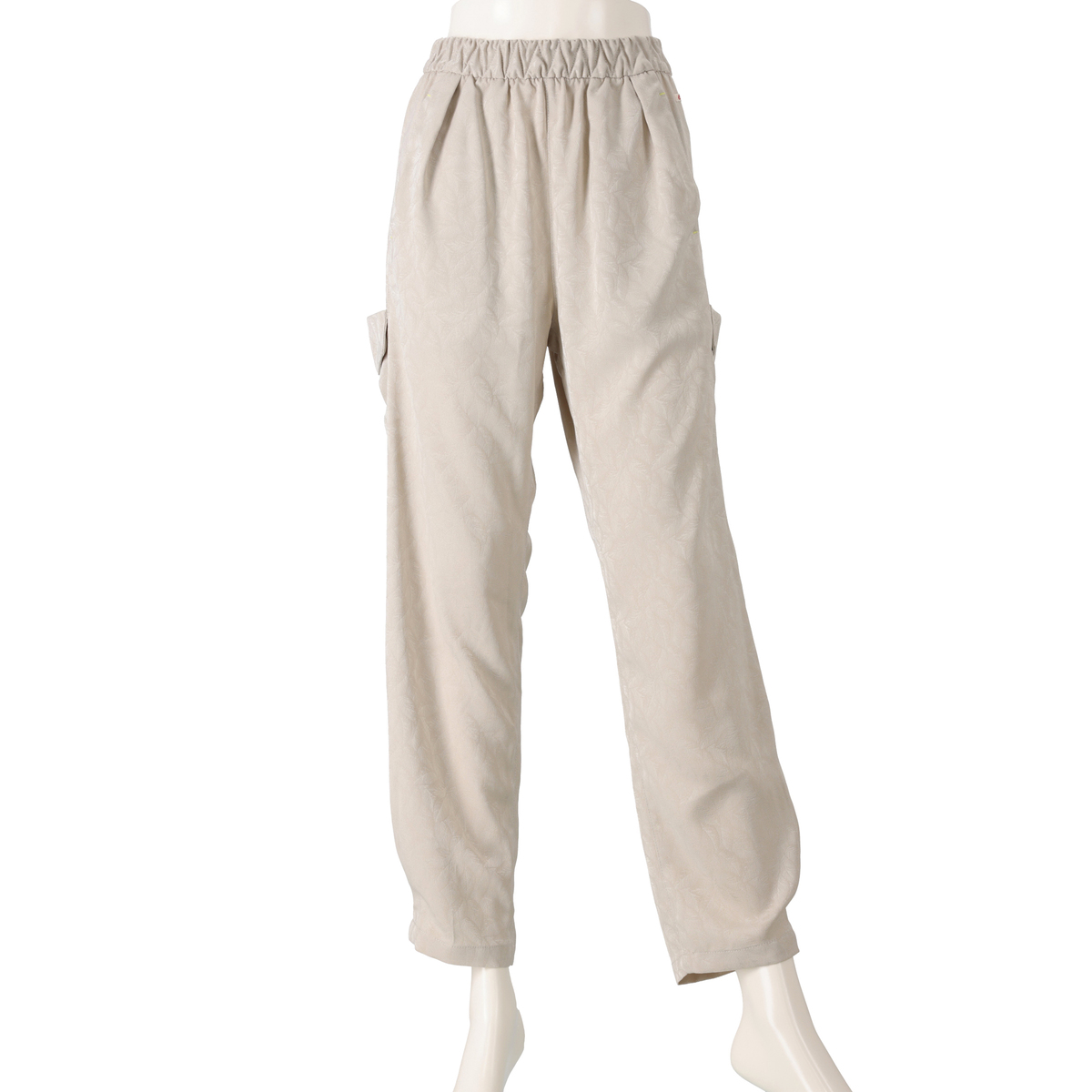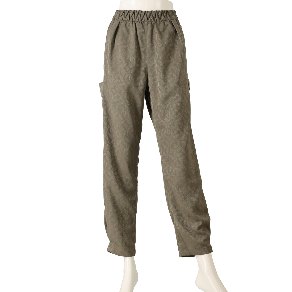 ドレープと艶感の美しいリーフ柄のサテンジャガードを使った、カジュアルなカーゴパンツ。マットなツヤを感じる素材で、大人のこなれ感とリラックスした印象とのバランスが素敵です。伸びない素材なので、ゆとりを持たせたパターンでお作りしています