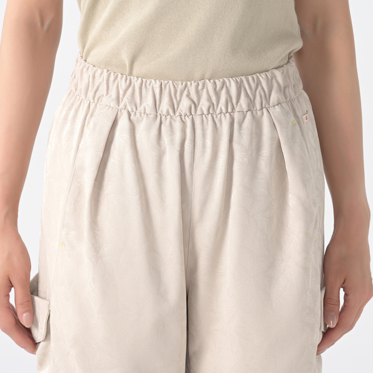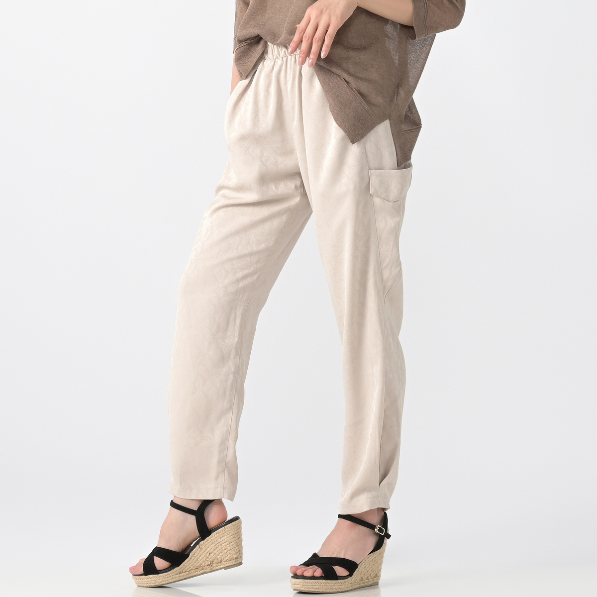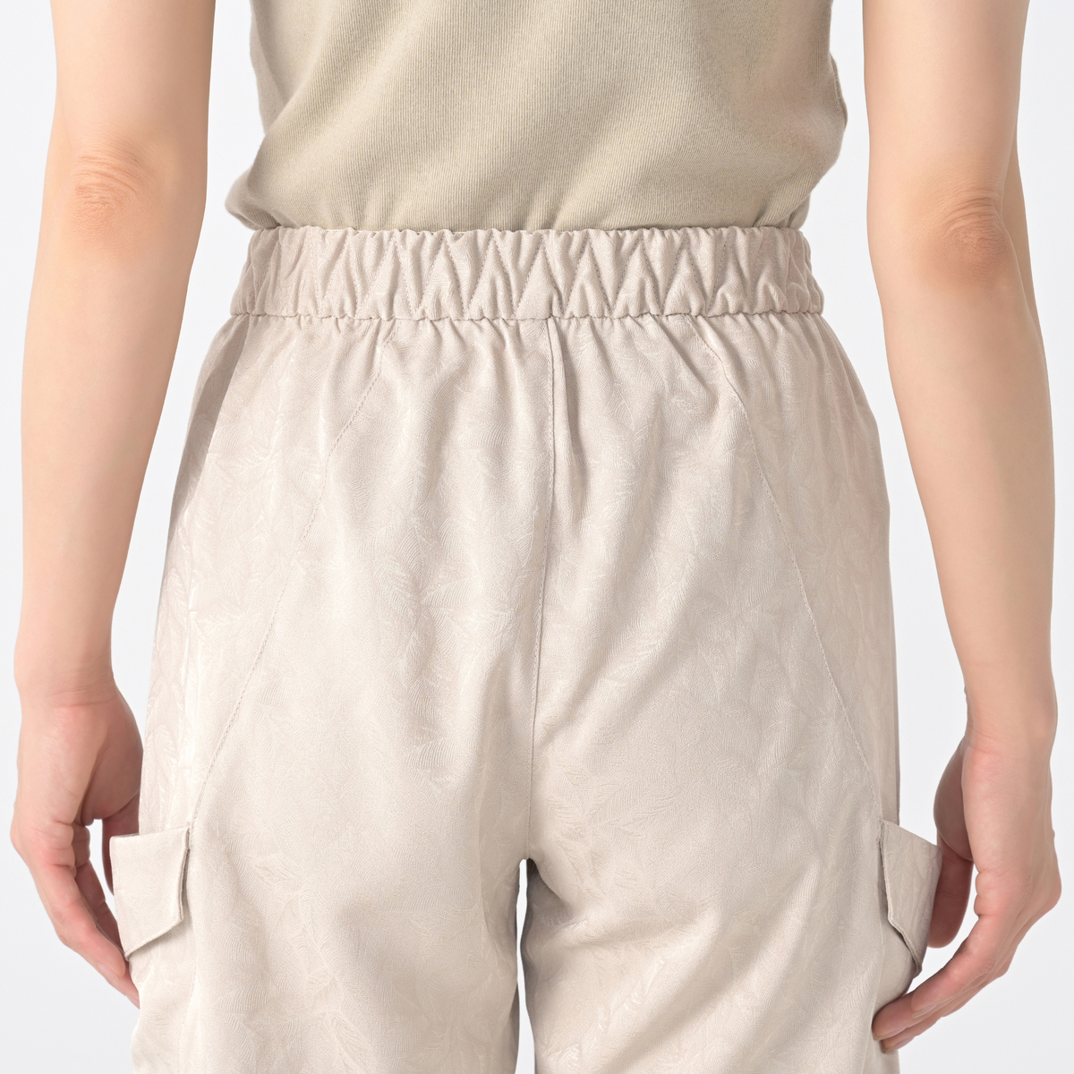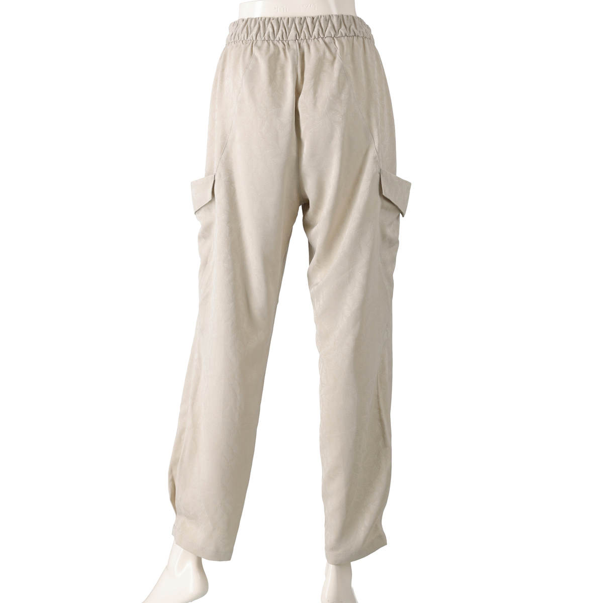 ドレープと艶感の美しいリーフ柄のサテンジャガードを使った、カジュアルなカーゴパンツ。マットなツヤを感じる素材で、大人のこなれ感とリラックスした印象とのバランスが素敵です。伸びない素材なので、ゆとりを持たせたパターンでお作りしています