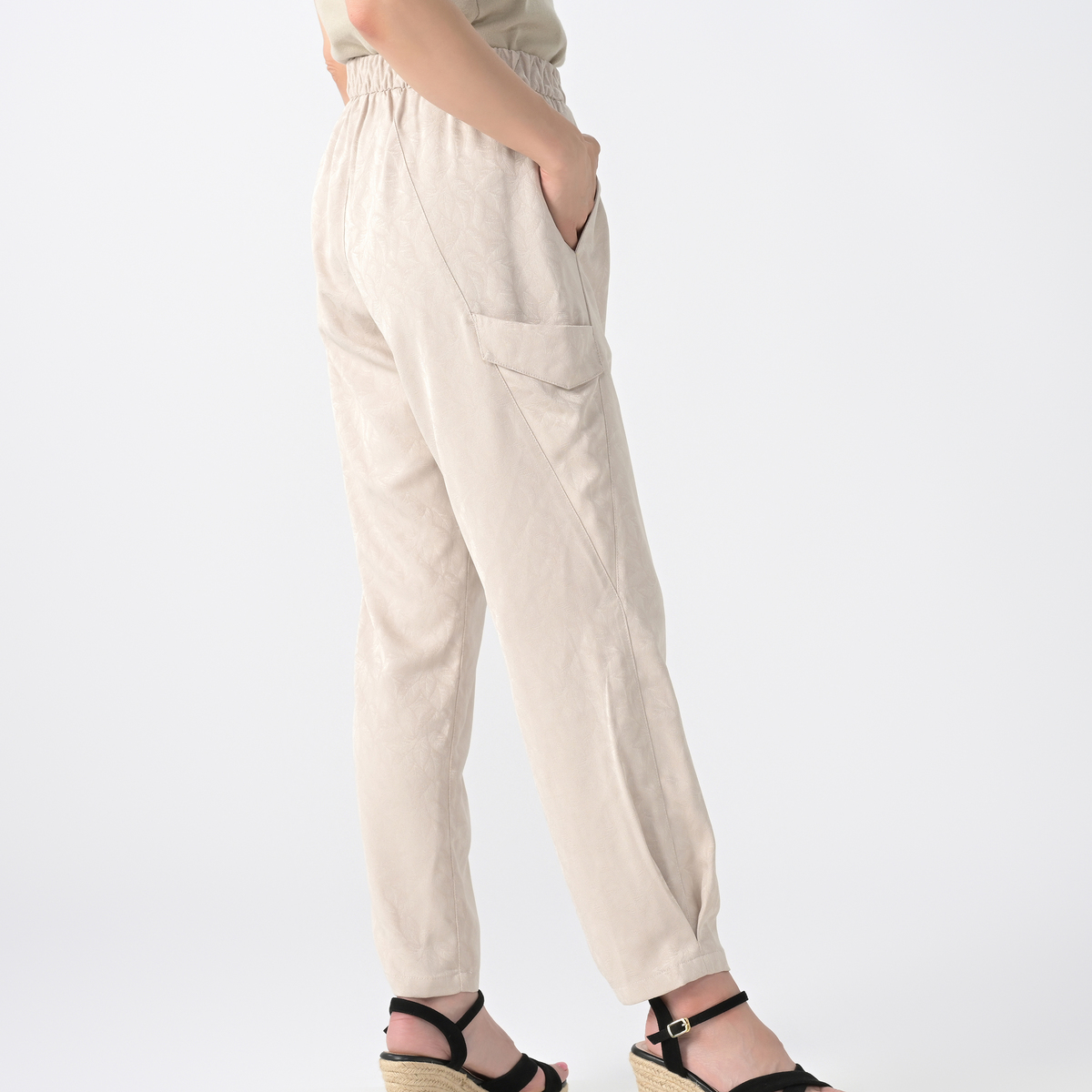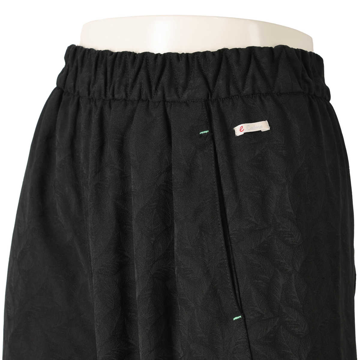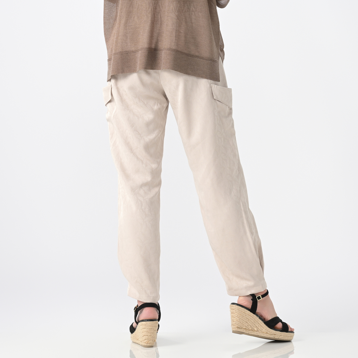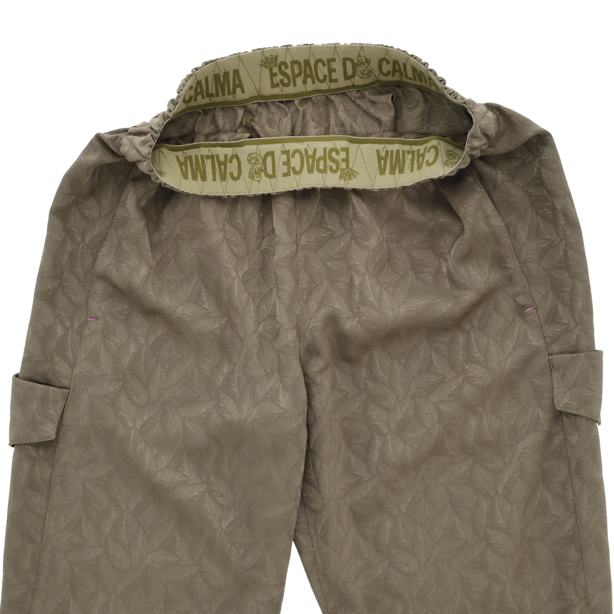 ドレープと艶感の美しいリーフ柄のサテンジャガードを使った、カジュアルなカーゴパンツ。マットなツヤを感じる素材で、大人のこなれ感とリラックスした印象とのバランスが素敵です。伸びない素材なので、ゆとりを持たせたパターンでお作りしています