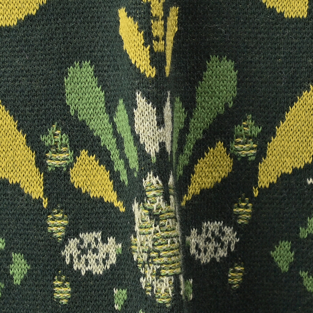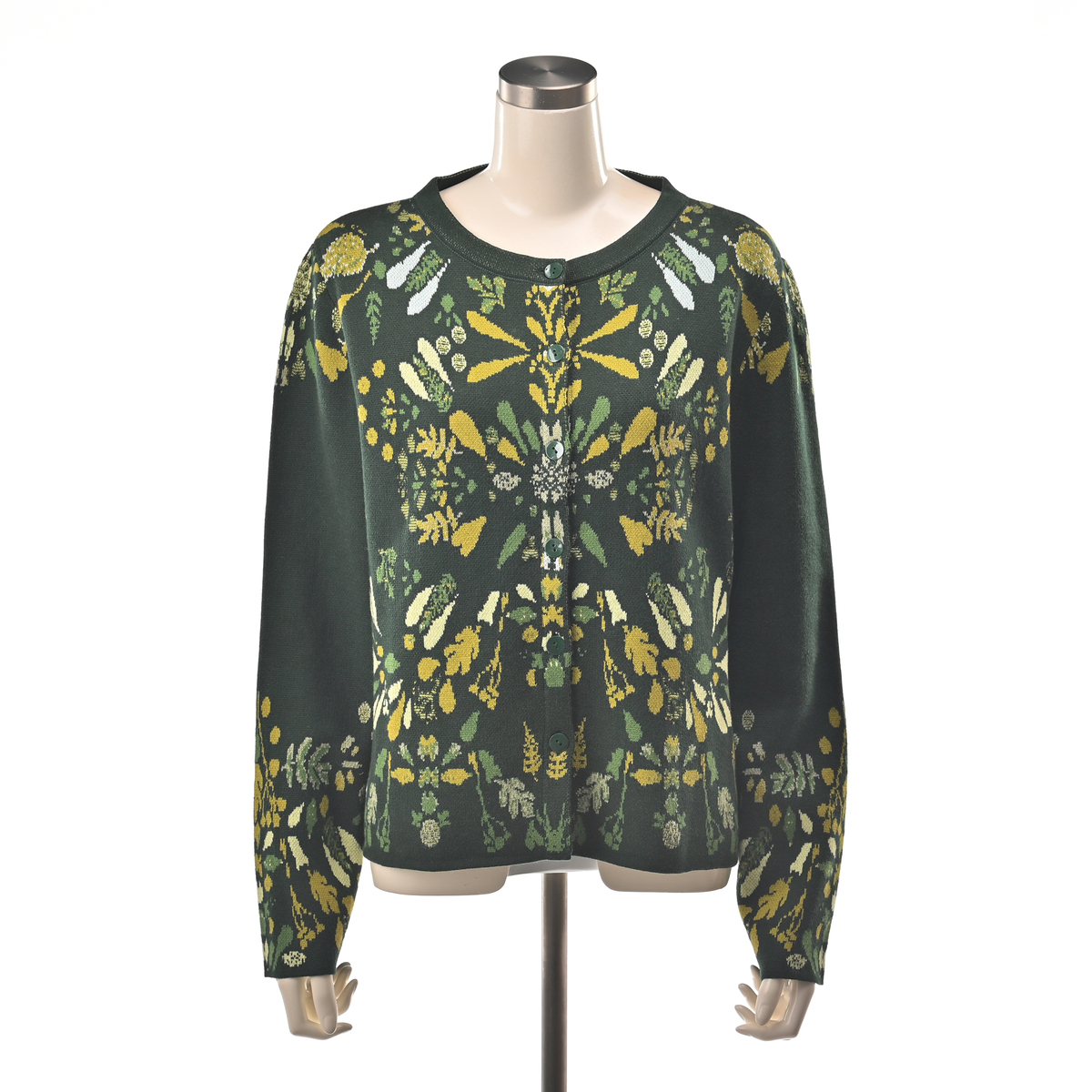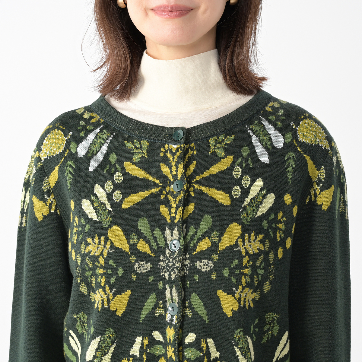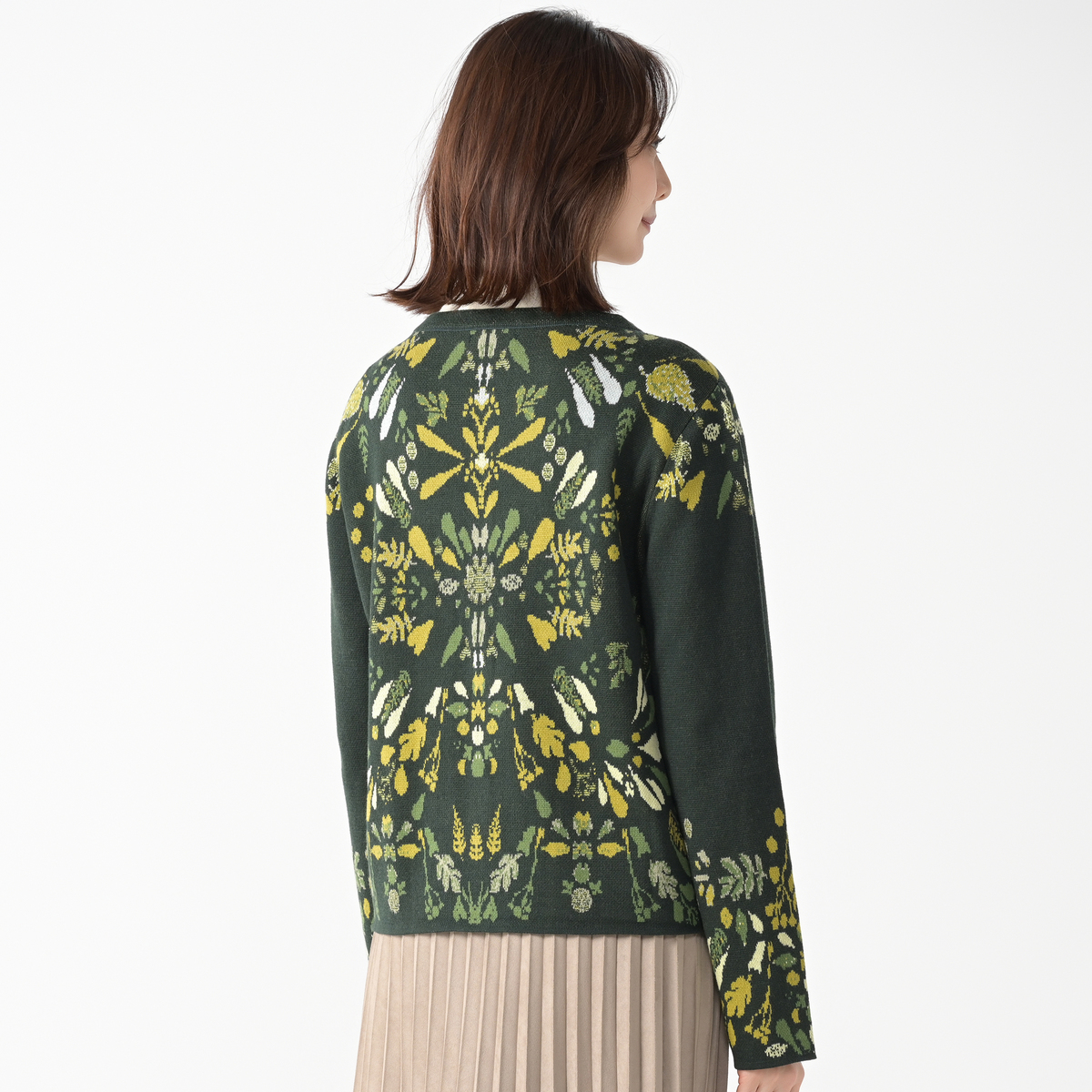 植物の楽園を抽象的に表現したプラントピアシリーズのカーディガン。葉や花のモチーフが左右対称に配置され、華やかさと落ち着きを両立。ダイナミックな柄がコーディネートに新鮮さを加え、日常を彩ります