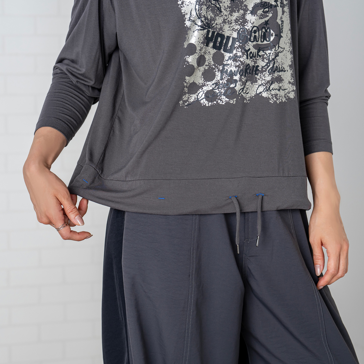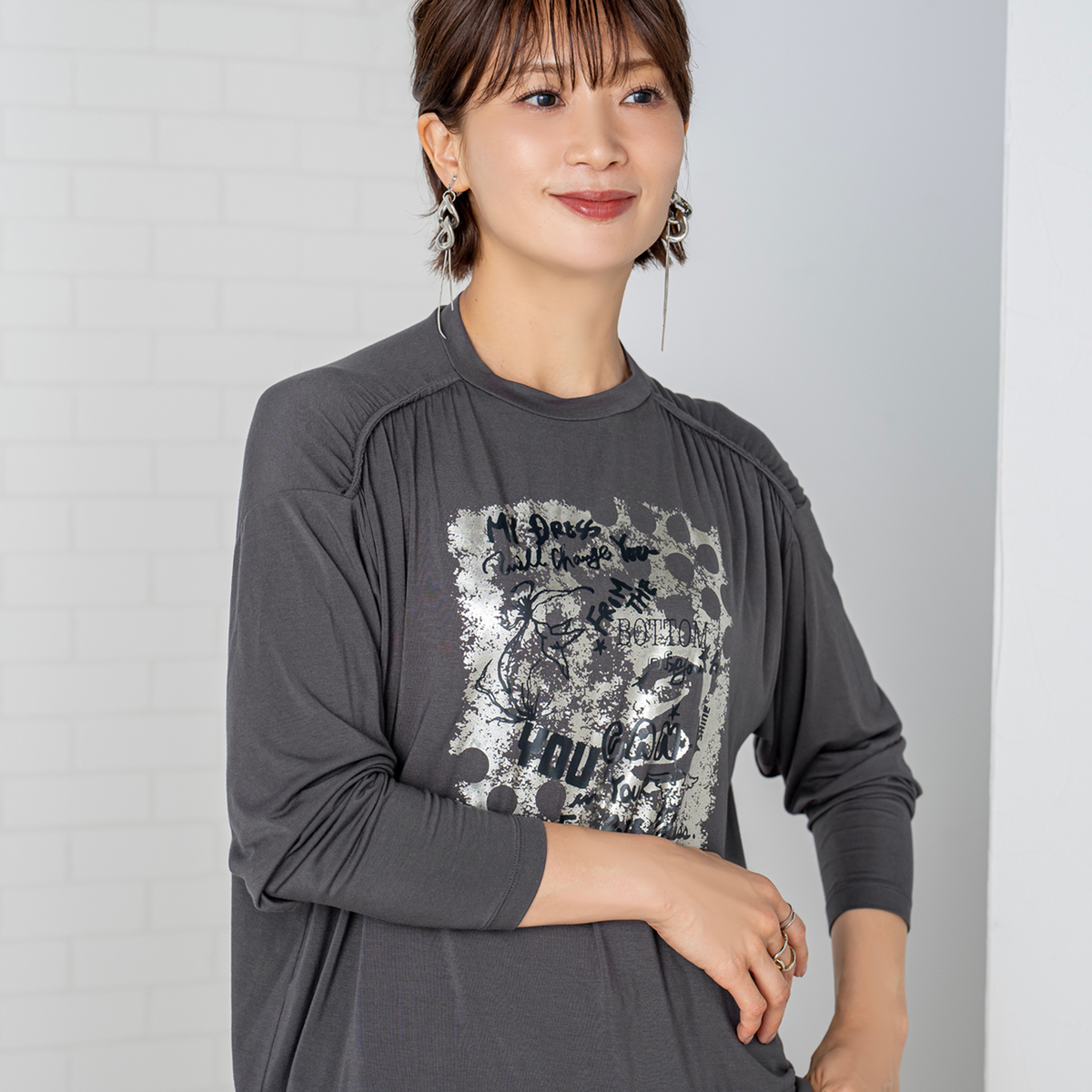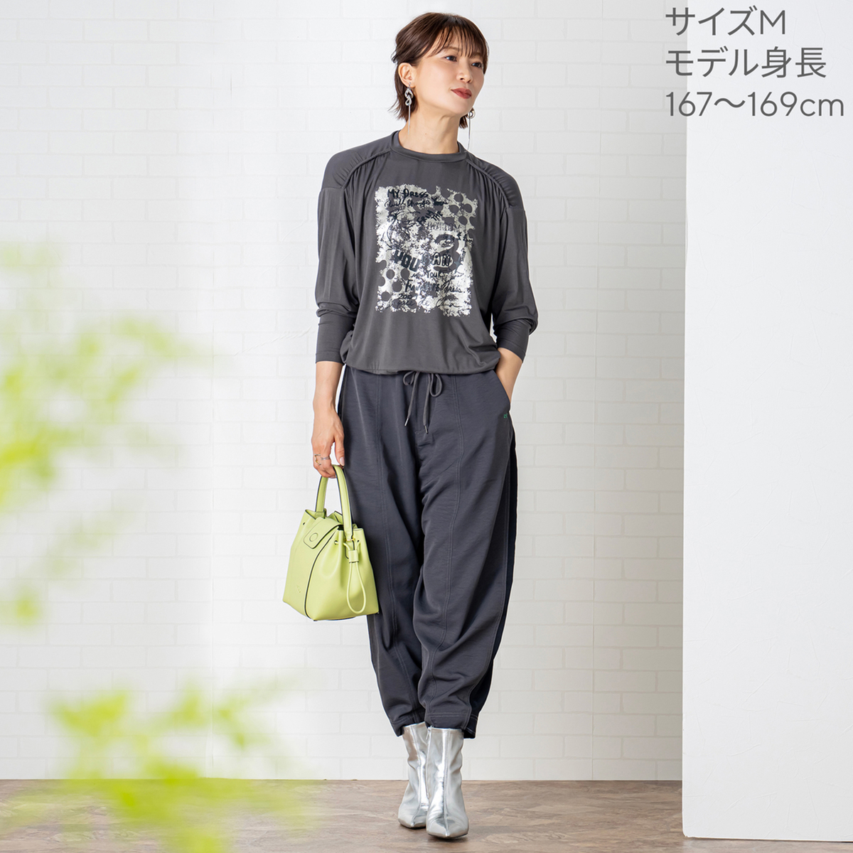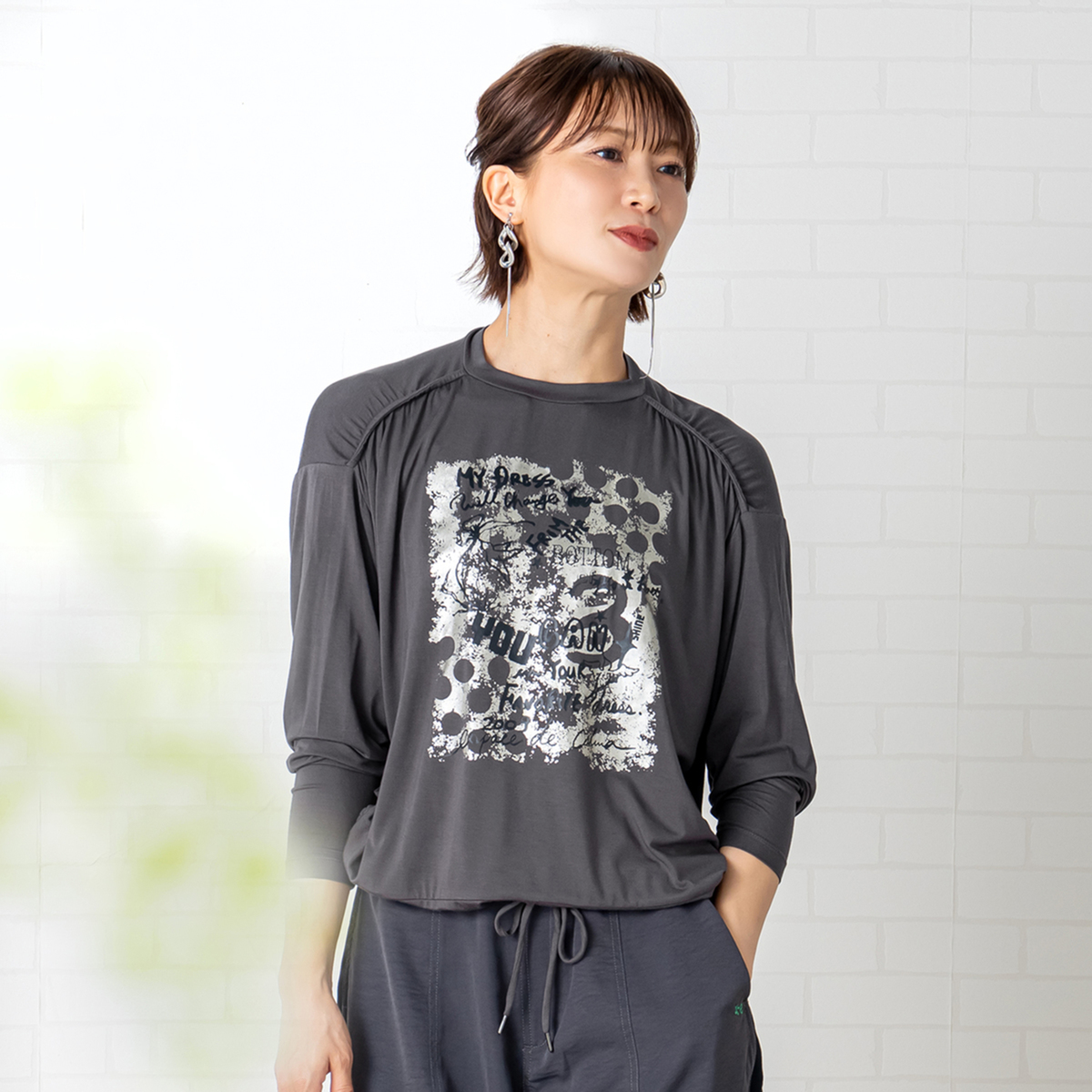 半袖から長袖の移行期に、サラッとして着心地よく、裾を紐で絞れるので、スタイリングしやすいです。箔の感じも派手すぎず、肩のギャザーもアクセントになっています。