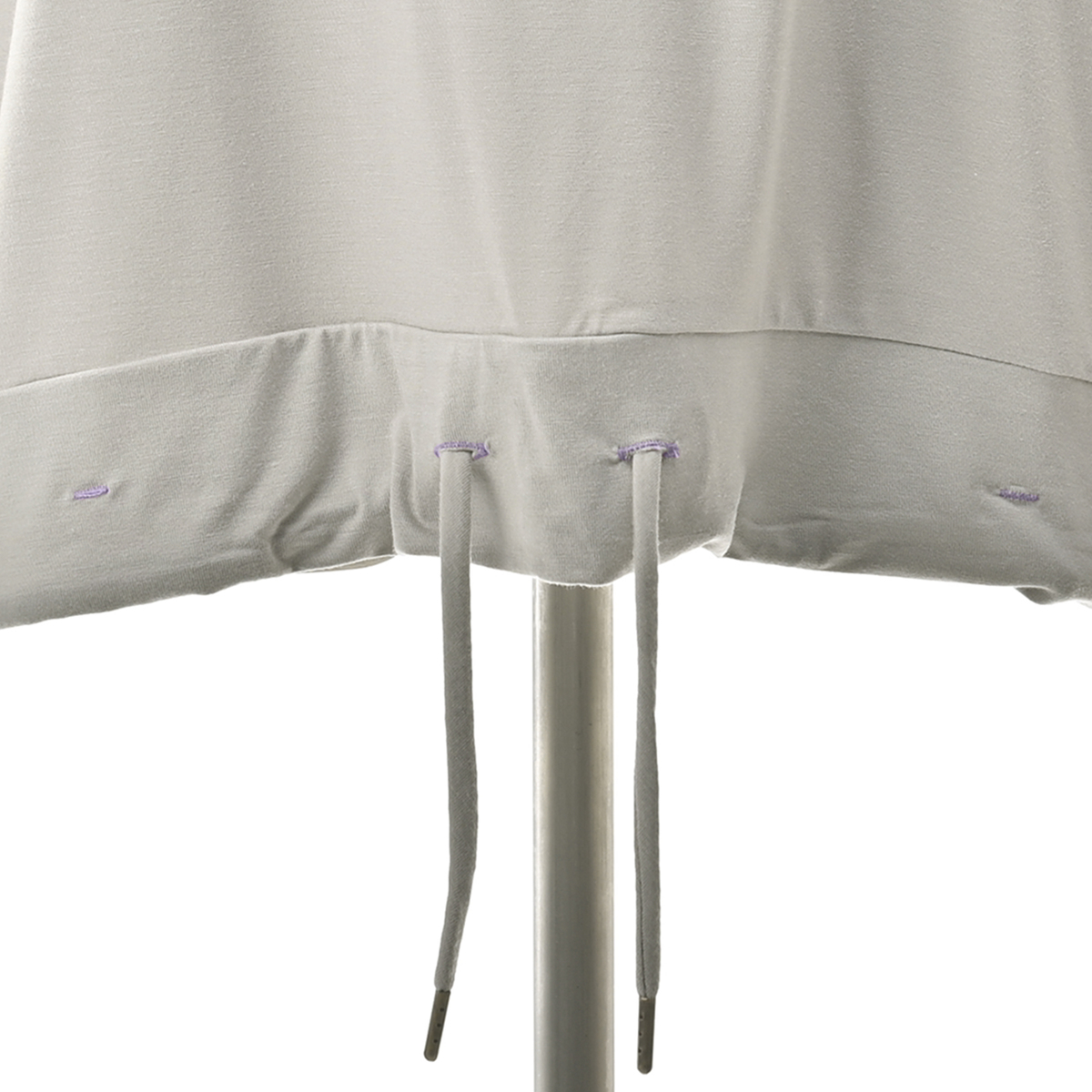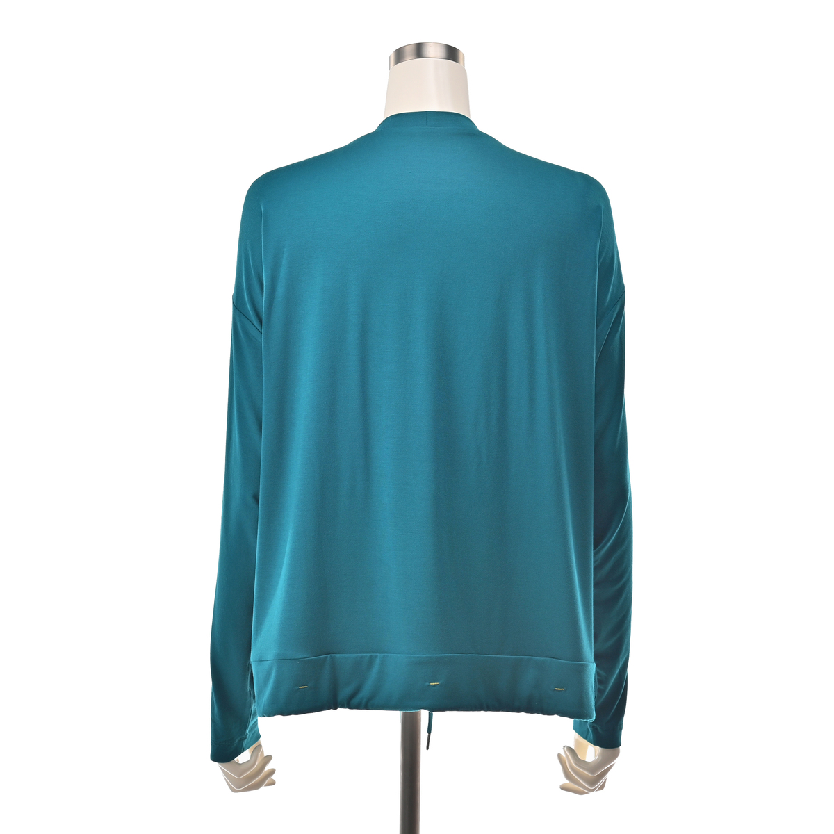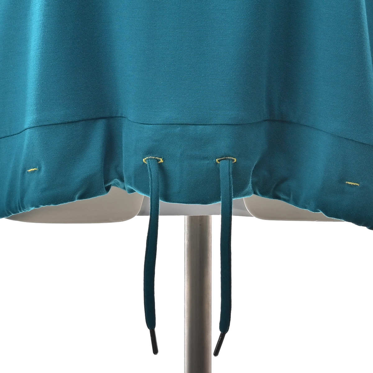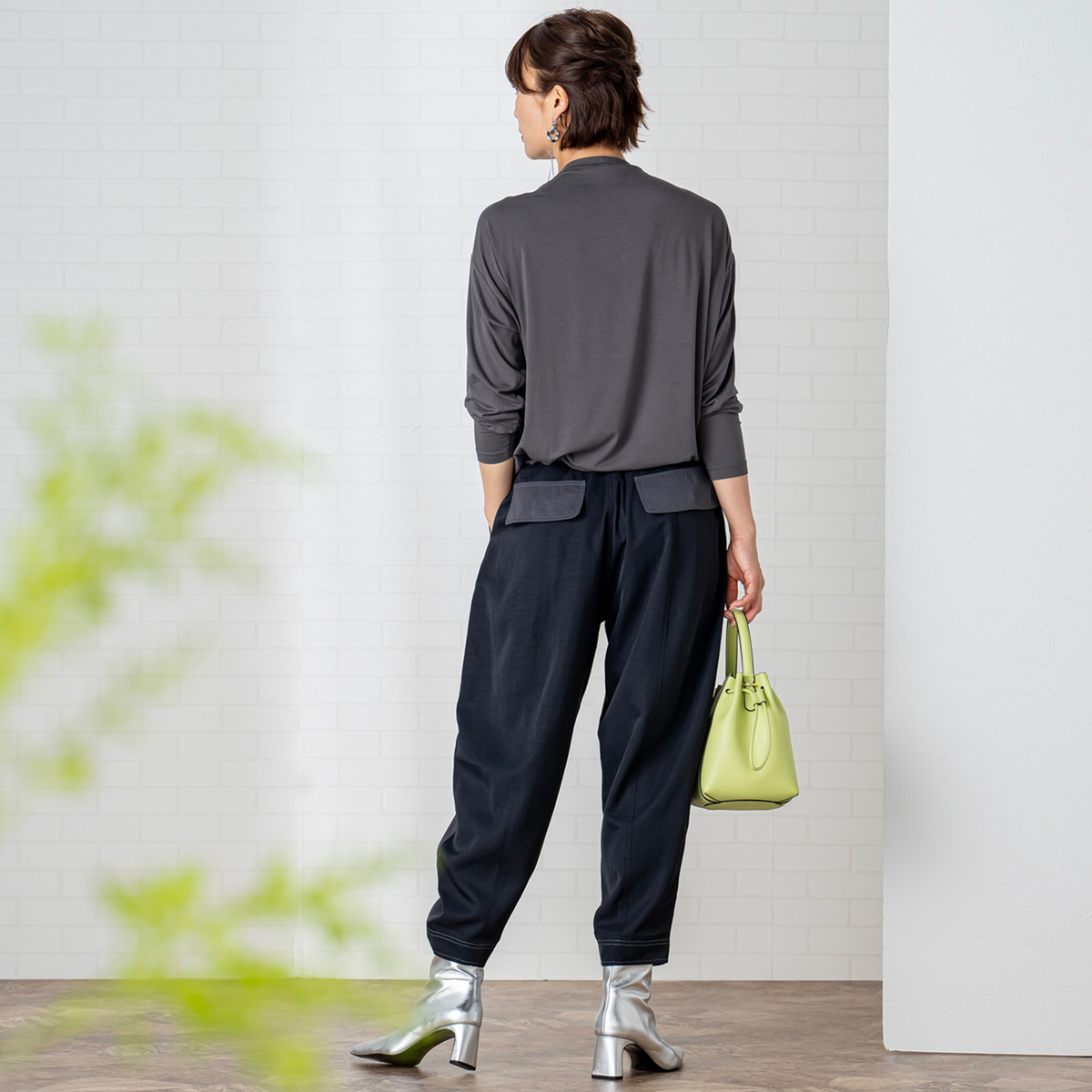 半袖から長袖の移行期に、サラッとして着心地よく、裾を紐で絞れるので、スタイリングしやすいです。箔の感じも派手すぎず、肩のギャザーもアクセントになっています。