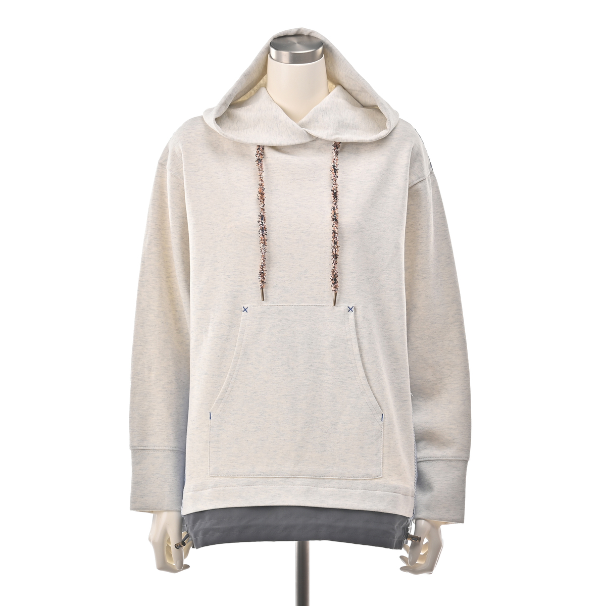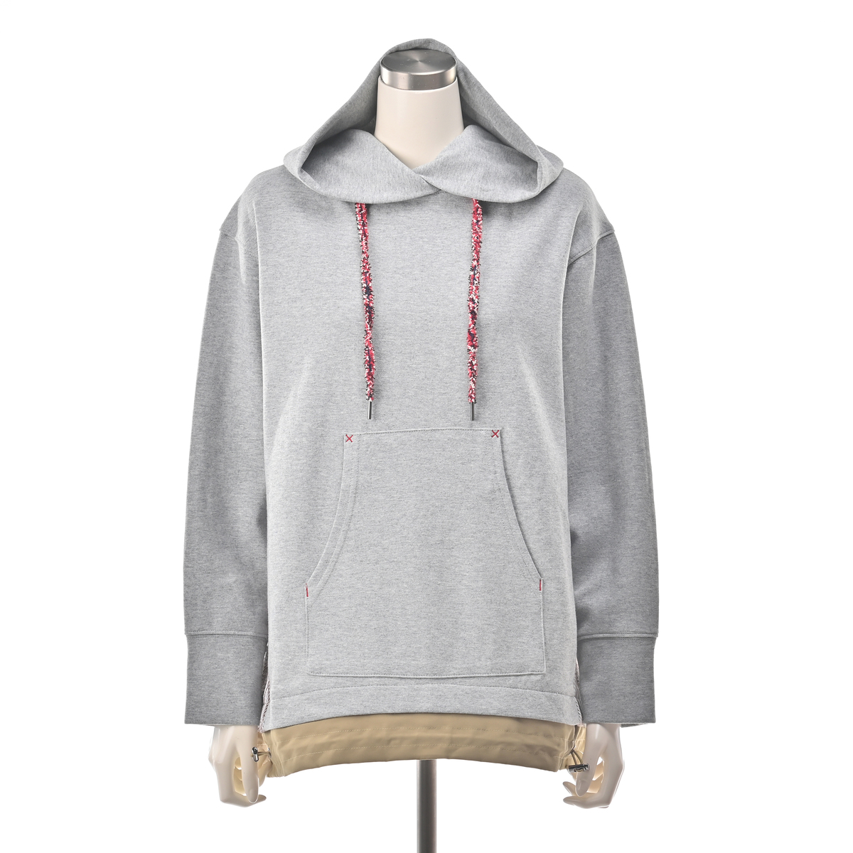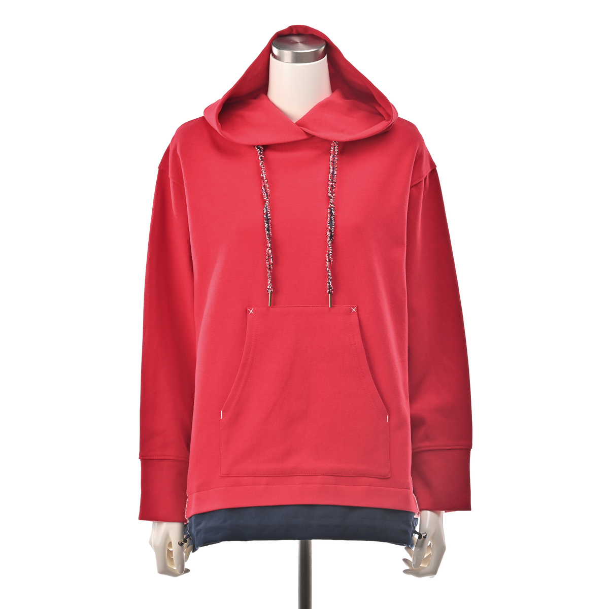 フードは立ち上がりが綺麗なデザインで、小顔効果にも期待できます。裾は無地の平織り生地をレイヤードしながら切り替え、ゴムスピンドルを通しているので、お好みで絞れます。前身頃がおよそ4cm短い、前後差ヘムのデザインです