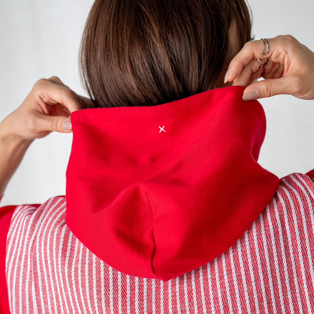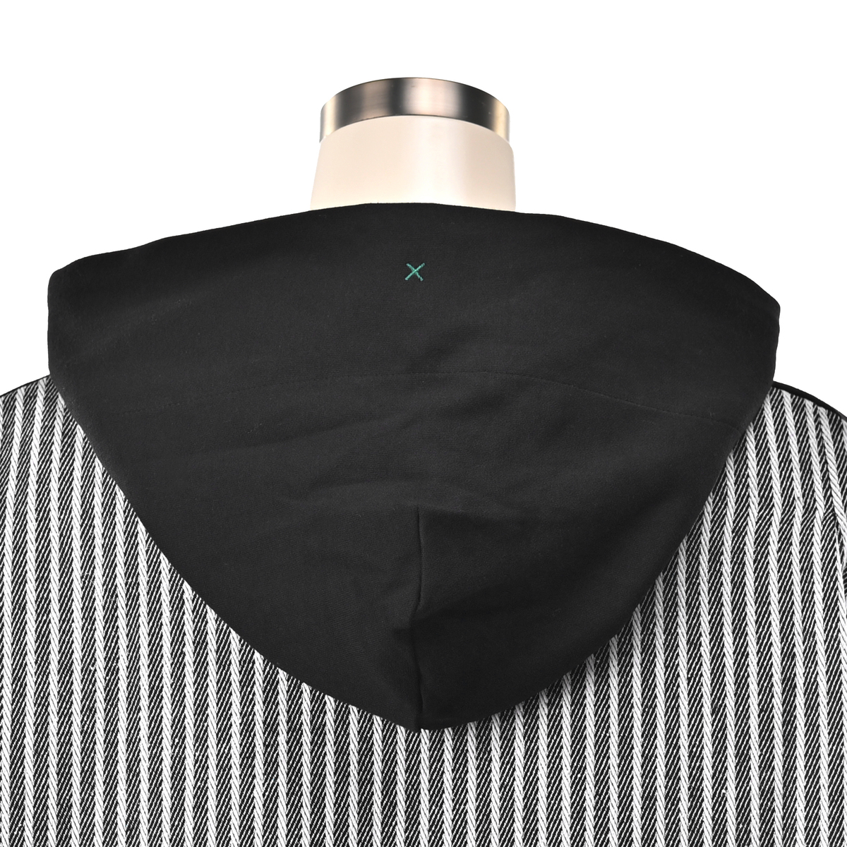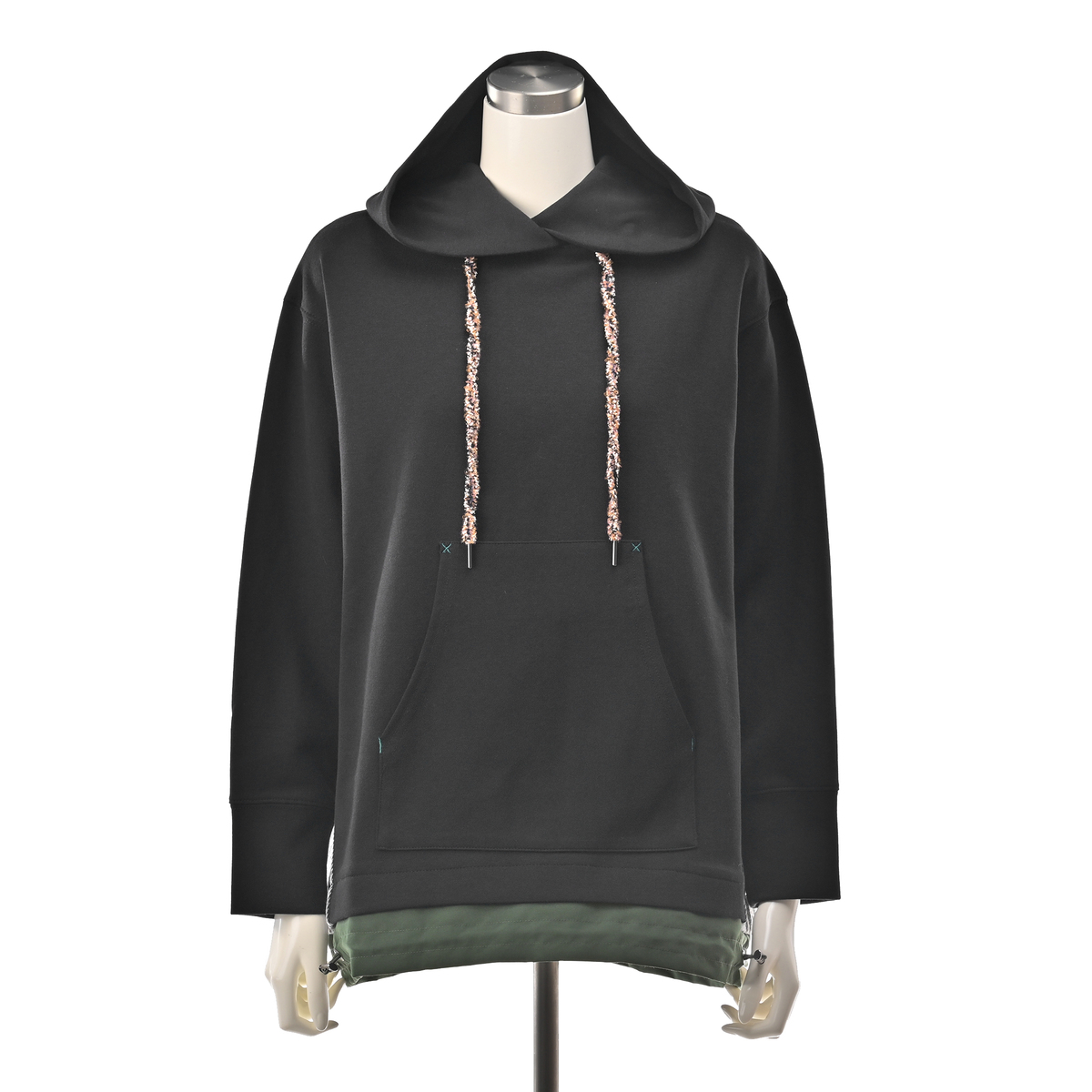 フードは立ち上がりが綺麗なデザインで、小顔効果にも期待できます。裾は無地の平織り生地をレイヤードしながら切り替え、ゴムスピンドルを通しているので、お好みで絞れます。前身頃がおよそ4cm短い、前後差ヘムのデザインです