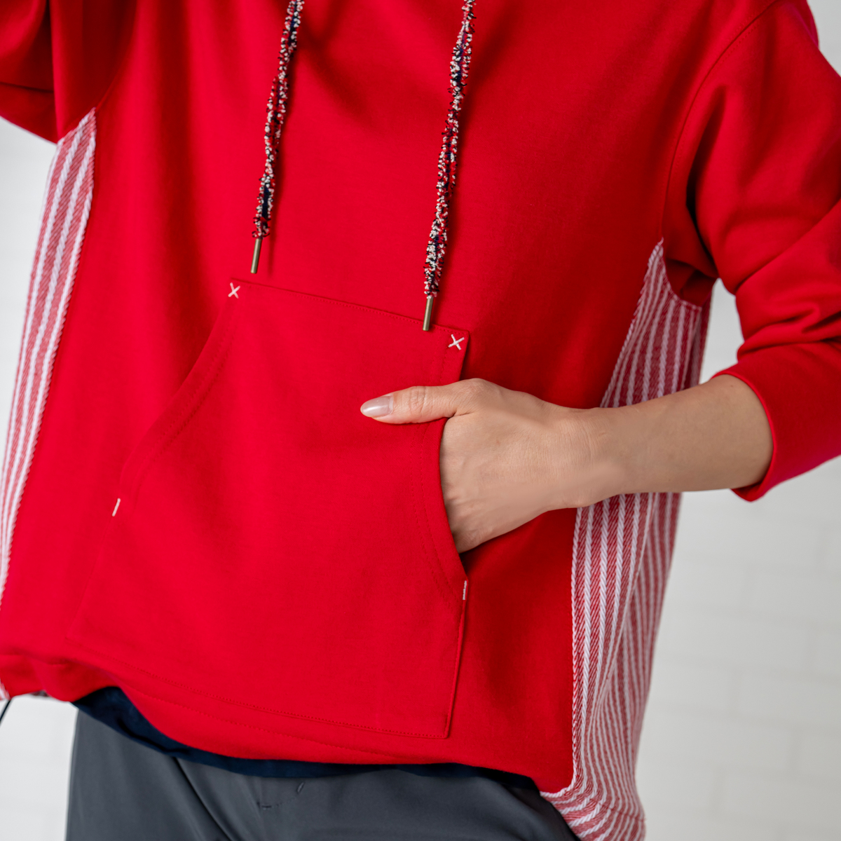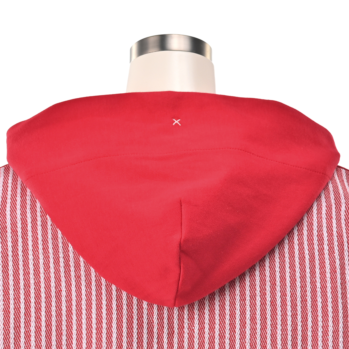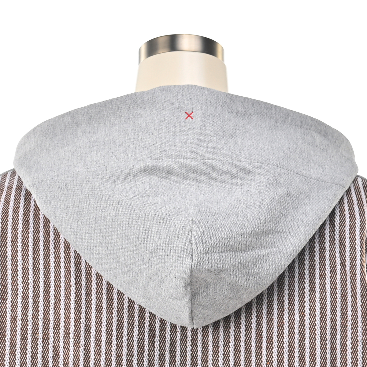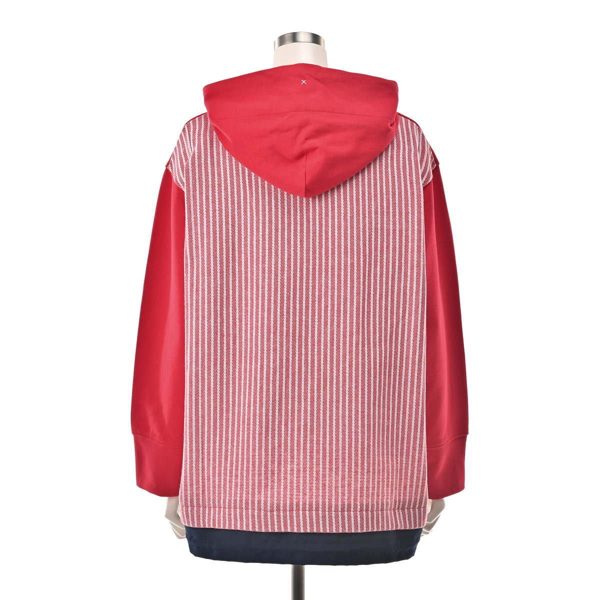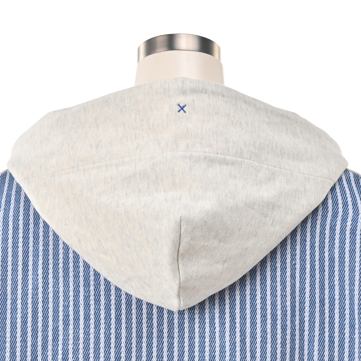 絶妙なゆったりシルエットで、前身頃に脇線を移動させ、後ろ身頃の変形ヒッコリーが前からも見える事でスッキリ見えを狙っています。縦長のカンガルーポケットをデザインし、ポケット口の上下に配色でカンヌキを入れて、ポイントを添えました