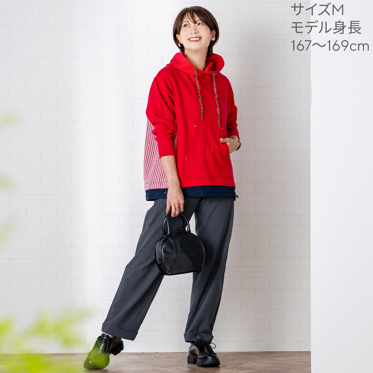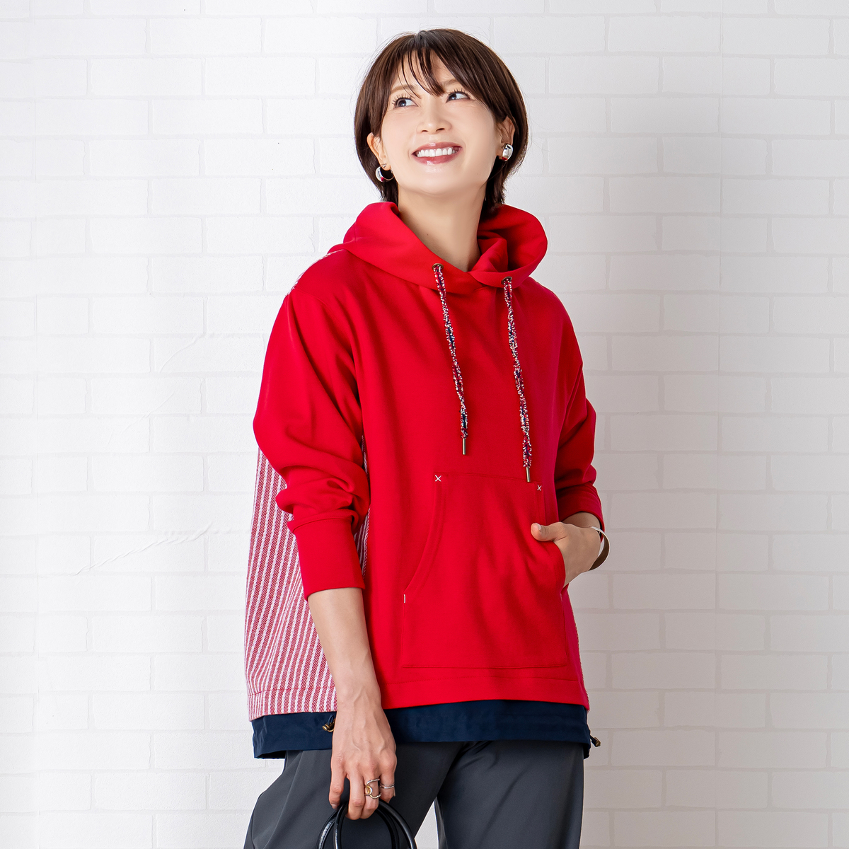 黒を購入しようと思っていたのですが、モデルさん着用の赤が気になってしまい、長らくクローゼットになかった色物を注文 正直、注文したものの着ることができるかな、、と、弱腰になりましたが、白、グレー、紺などの手持ちのインナー、アウター、パンツにとても合うことが判明 パーカーの作りやスピンドルのデザインも良く、そんなこだわり部分が、おばさんが赤を着ることができた理由になっているのかもしれません 前見頃のスピンドルも使いこなしてみたいです