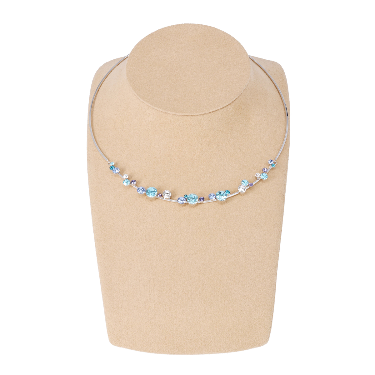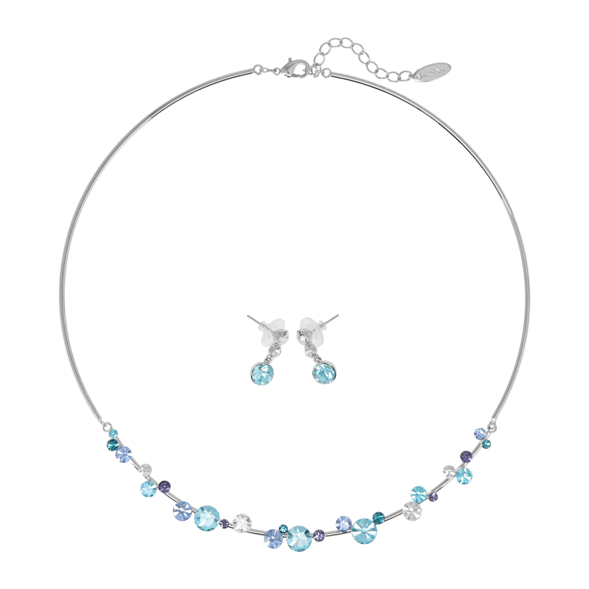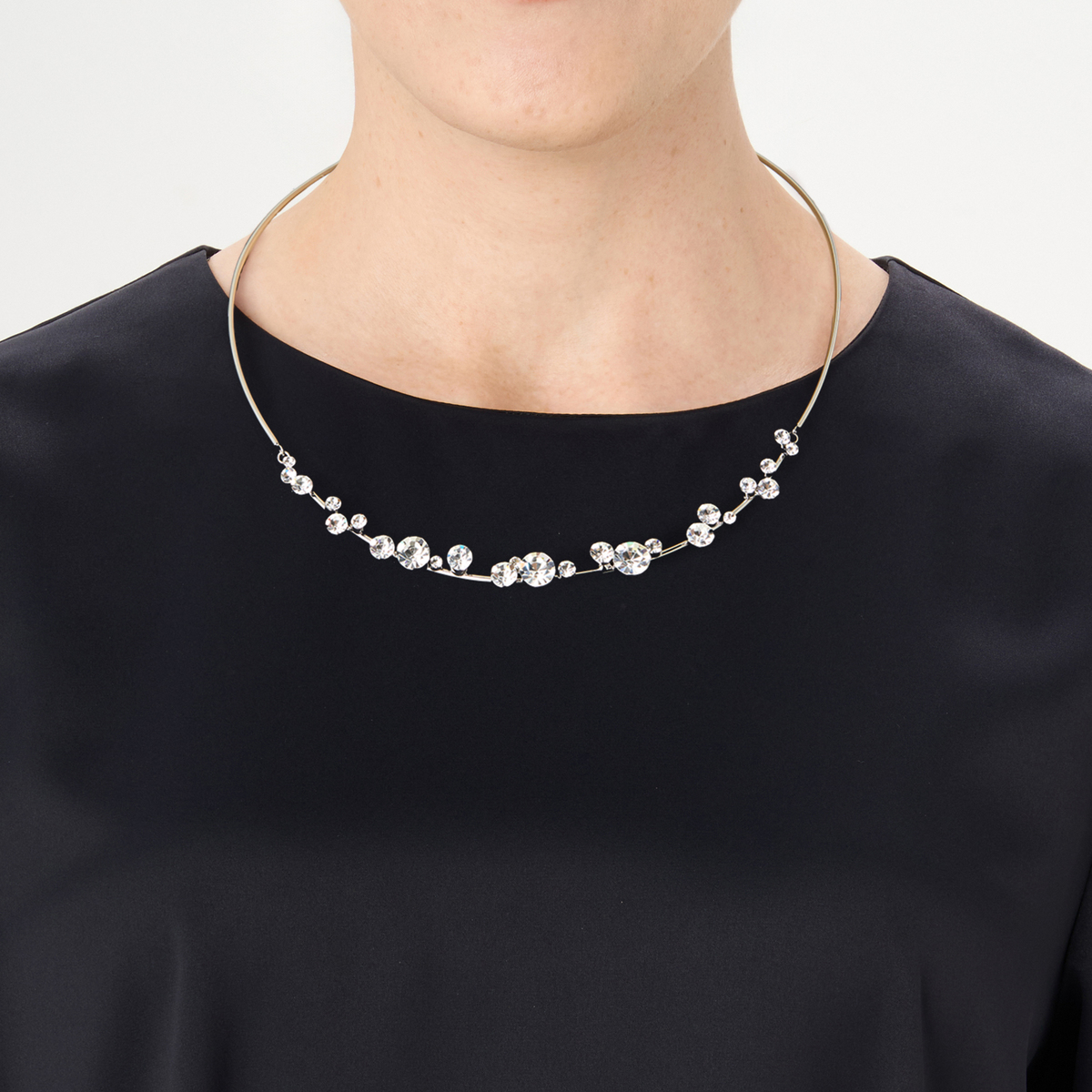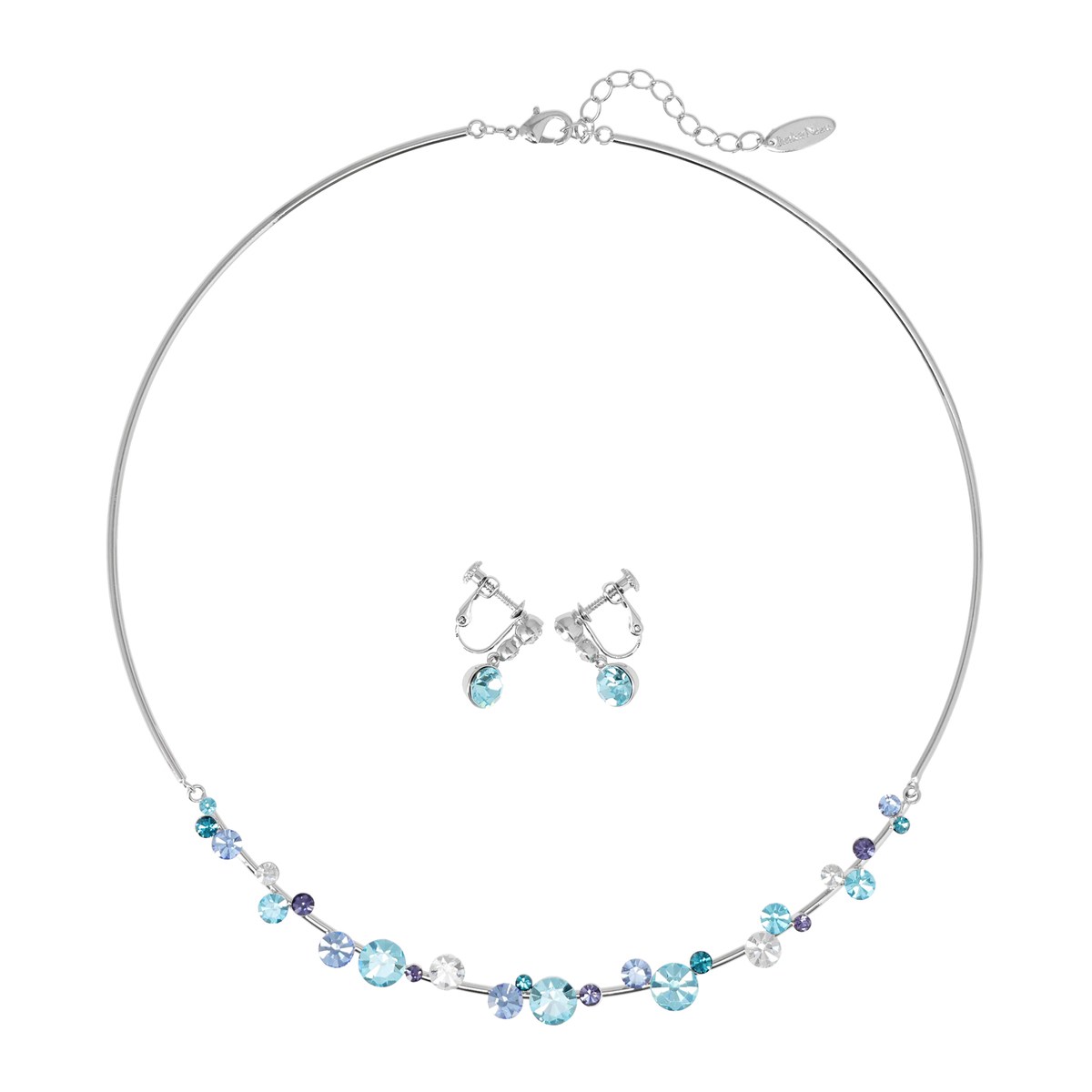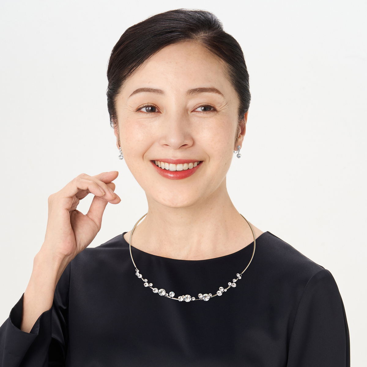 大小のクリスタルガラスが繊細に輝くチョーカーネックレス。洗練されたシンプルなデザインが首元に上品な存在感を与え、日常から特別な日まで幅広く活躍します。統一感のあるコーディネートでお使いいただけるよう、イヤリングまたはピアスをセットにしました