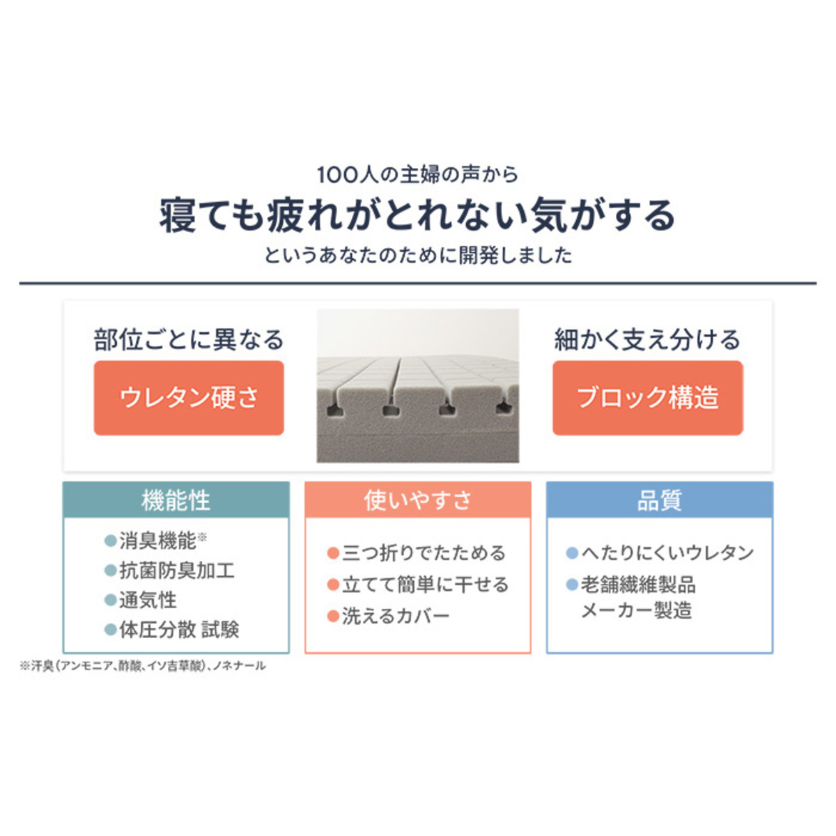ウレタンは汗臭(*2)、ノネナール(*3)に対する消臭機能を備え、さらに抗菌防臭加工を施しています。専用カバーには吸水性のある生地を使い、睡眠中の汗を素早く吸収します