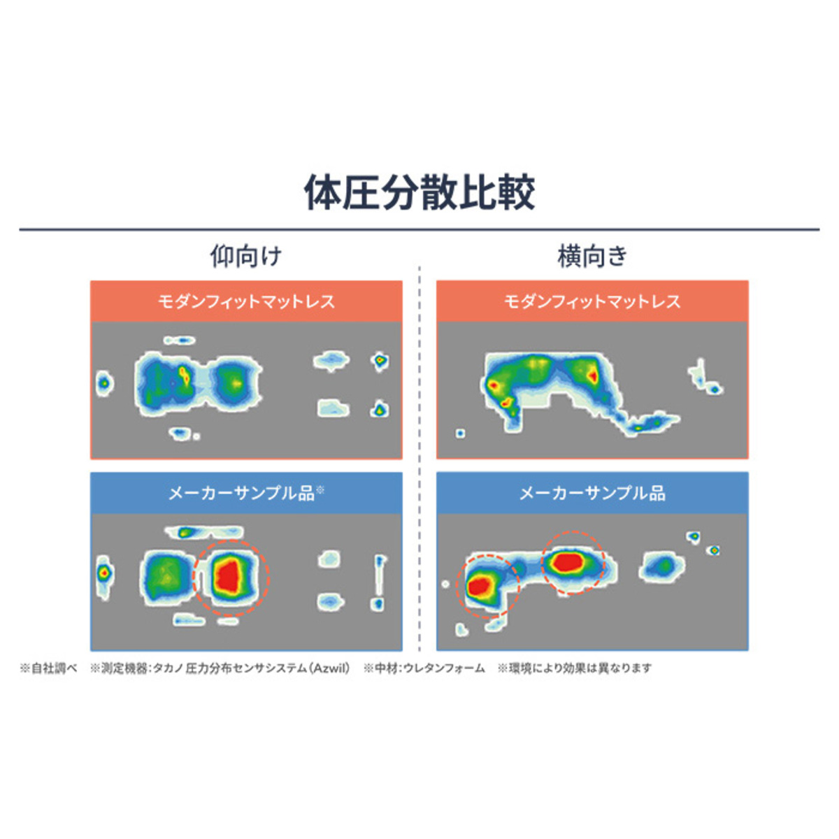 頭部は120ニュートン、腰は170ニュートン、脚は115ニュートンの硬さにバランスを変えた2D-balance(ツーディーバランス)製法。185ニュートンと硬めのウレタンながらもブロック状にすることで沈み込みが良くなり、寝返りがしやすい構造になっています